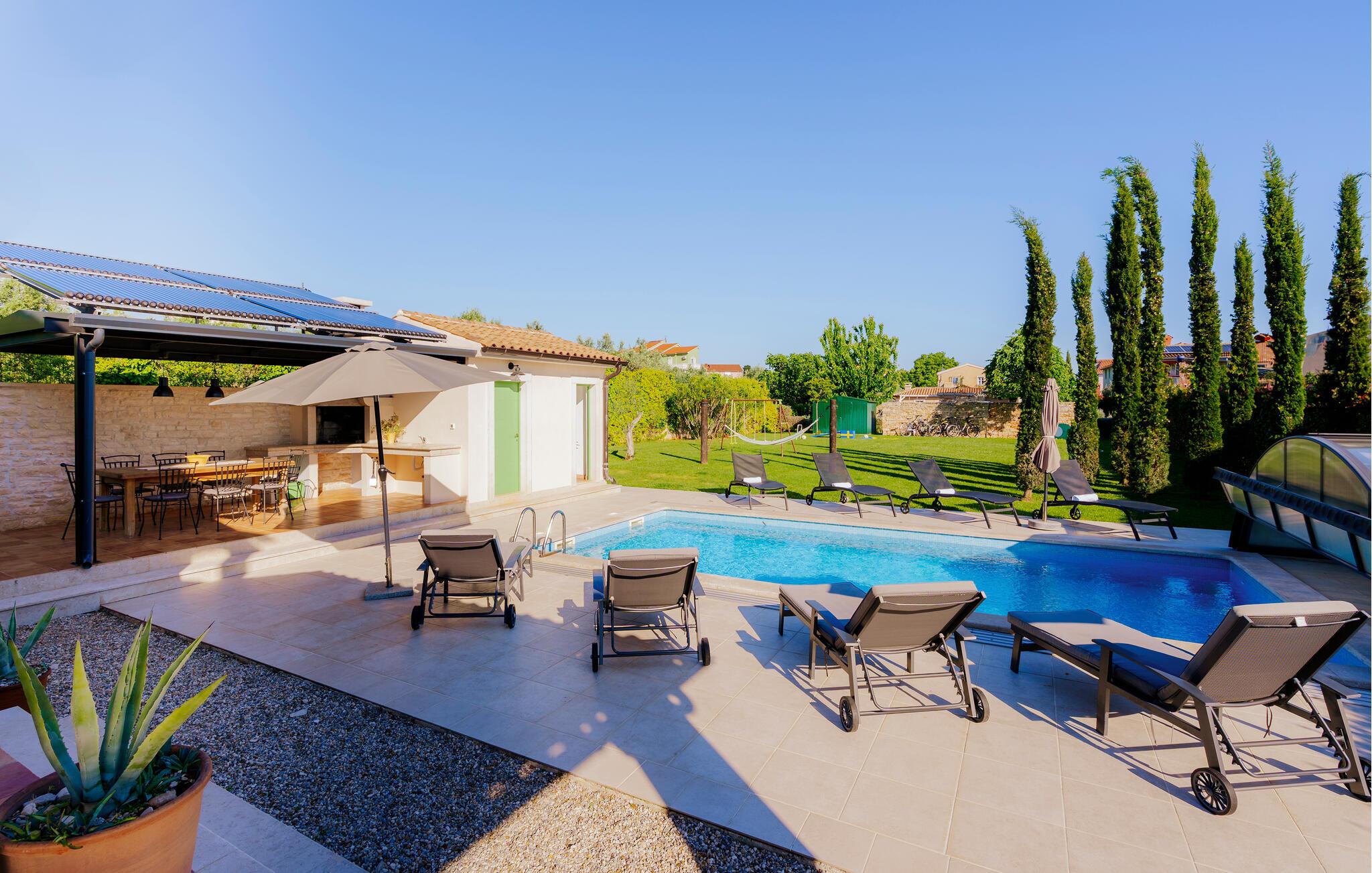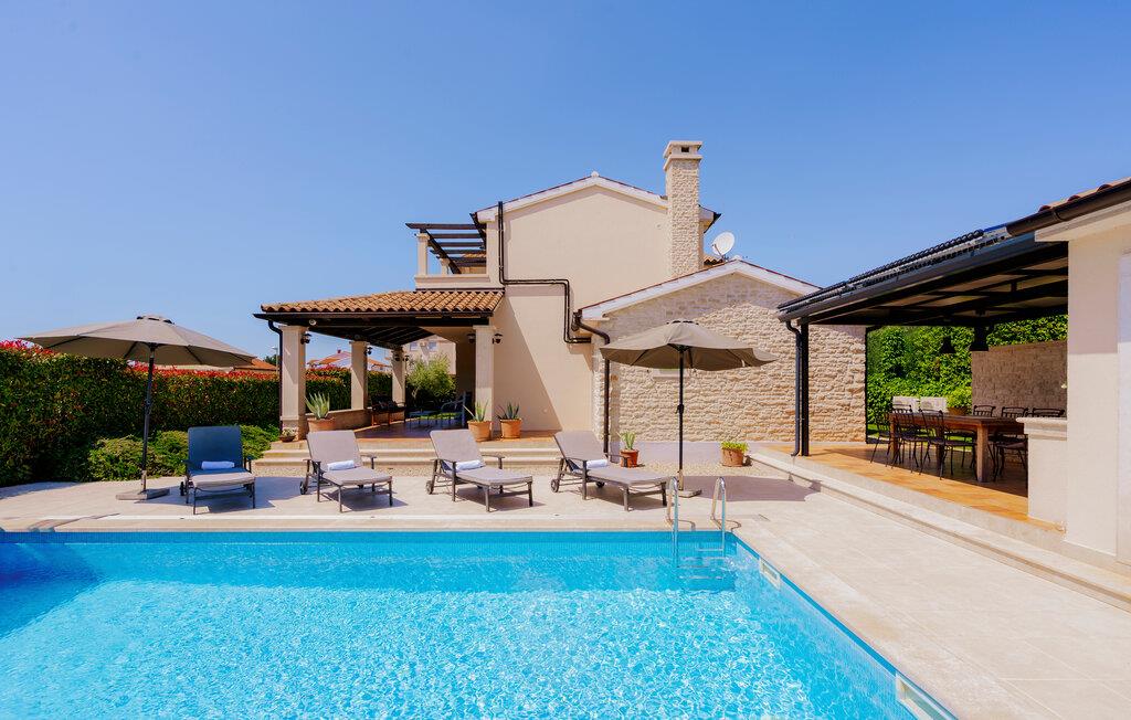 Diese außergewöhnliche Villa befindet sich in der kleinen schönen Stadt Fazana, nur einen Katzensprung von Pula und dem Nationalpark Brijuni entfernt. Die Villa Matia bietet Platz für bis zu 8 Personen in vier hübsch eingerichteten Schlafzimmern. Das schön eingerichtete offene Erdgeschoss besteht aus einer voll ausgestatteten Küche mit rustikalen Elementen, einem Essbereich und einem hellen Wohnbereich. Im Erdgeschoss finden Sie auch ein gut ausgestattetes Schlafzimmer mit eigenem Bad. Die Treppe führt Sie in den ersten Stock, wo Sie die anderen drei Schlafzimmer mit eigenem Bad finden. Von einem Schlafzimmer aus haben Sie direkten Zugang zu einer kleinen Terrasse, einem privaten Ort, von dem aus Sie die schöne Aussicht auf die Umgebung genießen können. Wenn Sie Ihre Zeit gerne draußen verbringen, ist der Außenbereich der perfekte Ort. Vor dem Haus finden Sie einen einladenden Poolbereich und Sonnenliegen, auf denen Sie an warmen Sommertagen bei einem kalten Getränk entspannen können. Die Villa Matia bietet einen kleinen Wellnessraum neben dem Haupthaus, in dem Sie einfach in der Sauna entspannen können. Der Außenbereich verfügt auch über einen überdachten Essbereich, der sich perfekt für ein Familientreffen eignet, und einen Holzkohlengrill, auf dem Sie köstliche Mahlzeiten für Ihre Lieben zubereiten können. Während Sie mit Ihren Freunden zu Abend essen, können Ihre Kinder auf dem großen Rasen und dem Kinderspielplatz spielen. Die Villa Matia bietet Ihnen viele Möglichkeiten, aktiv zu bleiben. Hier finden Sie Tischtennis, Darts, aber auch 4 Fahrräder, mit denen Sie die weitere Umgebung entdecken können. Diese charmante Villa ist der perfekte Ort für einen Familienurlaub, wo Sie sich entspannen, aber auch aktiv bleiben können, während Sie die verborgenen Schätze Istriens erkunden.Fazana: Man hat Herzklopfen in diesem steinernen Nest, man ist stolz auf die lange Fischertradition und erfreut über die Stimmung beim ersten Händeschütteln, bei dem jeder Gast zum Nachbarn und Freund und somit Teil einer großen Familie wird! Die Stadt Fazana, die sich in der Nähe von Pula befindet, ist mit seinen Stränden, Pinienwäldern, Strandboulevards, Restaurants am Meer ist der perfekte Ort für Erholung und Vergnügen: Es ist auch der Ausgangshafen für die Inseln Brijuni – den Nationalpark mit den Attributen eines irdischen Paradieses. Der Zauber, den einst der Dichter und Regisseur Pier Paolo Pasolini verspürte, zeugt von der spontanen Lebensweise, der bekannten Gastfreundschaft und einem herzlichen Willkommen!