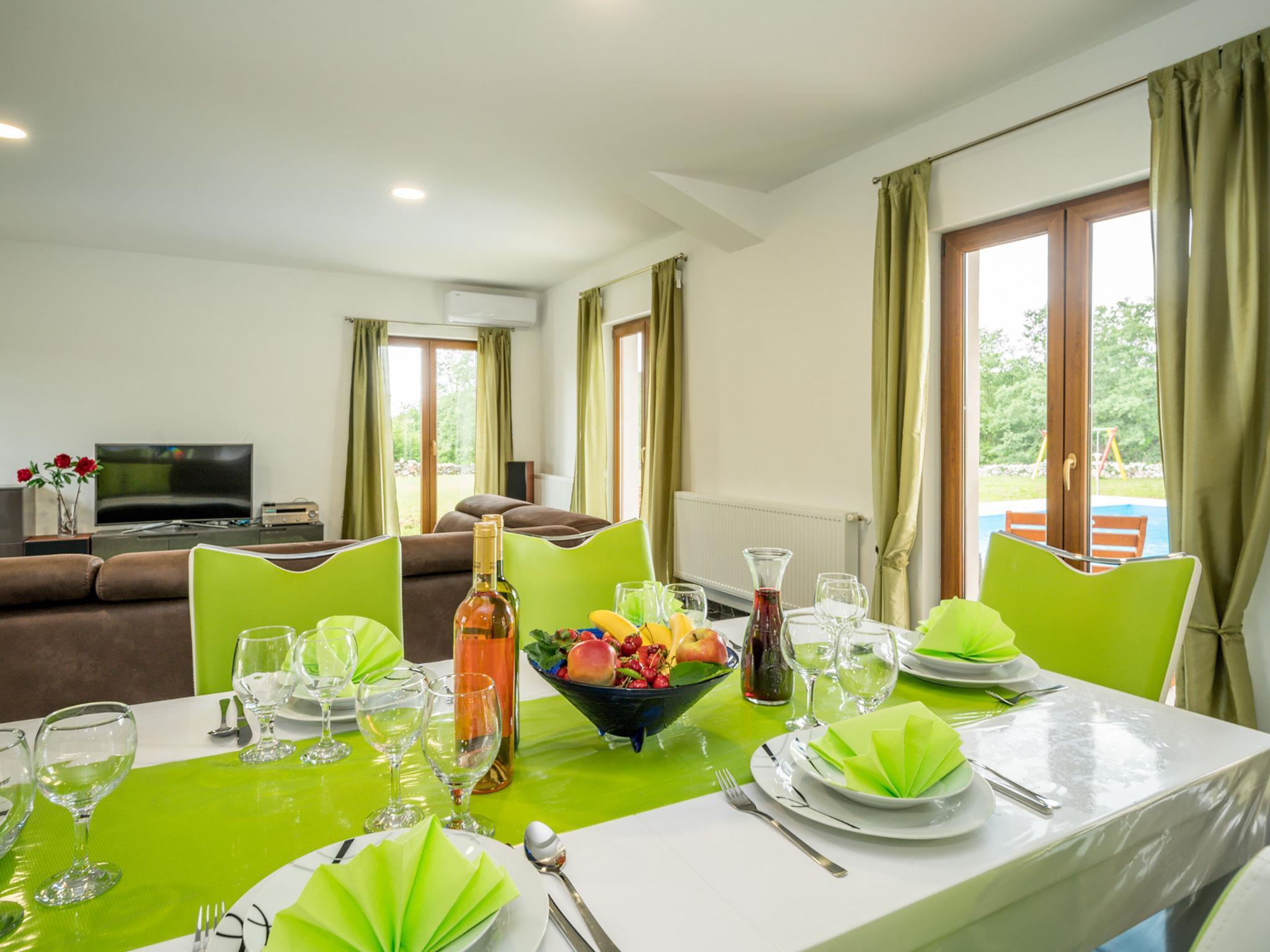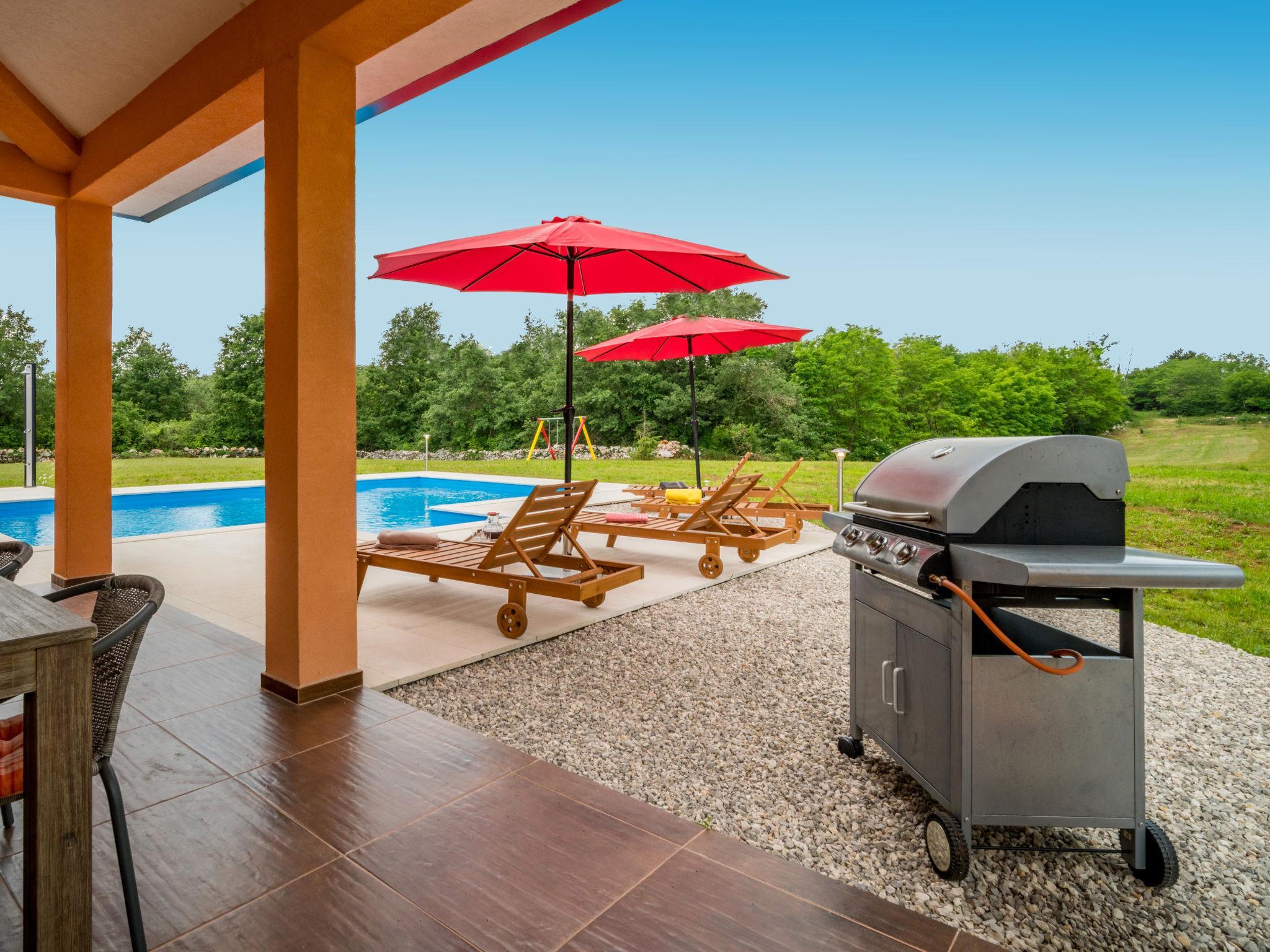 Frankovici 10 km from Motovun: Beautiful single-family house "Villa Frankovici", 2 storeys, built in 2017. In the hamlet Frankovici 8 km from the centre of Pazin, 33 km from the centre of Porec, 30 km from the sea, in the countryside. Private: property 14'000 m2, lawn, swimming pool angular (8 x 5 m, 46 m2, depth 140 cm, seasonal availability: 01.May. - 30.Sep.) with internal staircase. Outdoor shower, terrace (27 m2), garden furniture. In the house: internet access, washing machine. Parking (for 3 cars) at the house on the premises. Shop 3 km, supermarket 11 km, restaurant 3 km, bus stop 5.5 km, pebble beach 30 km. Walking paths from the house 300 m, cycle lane 350 m.