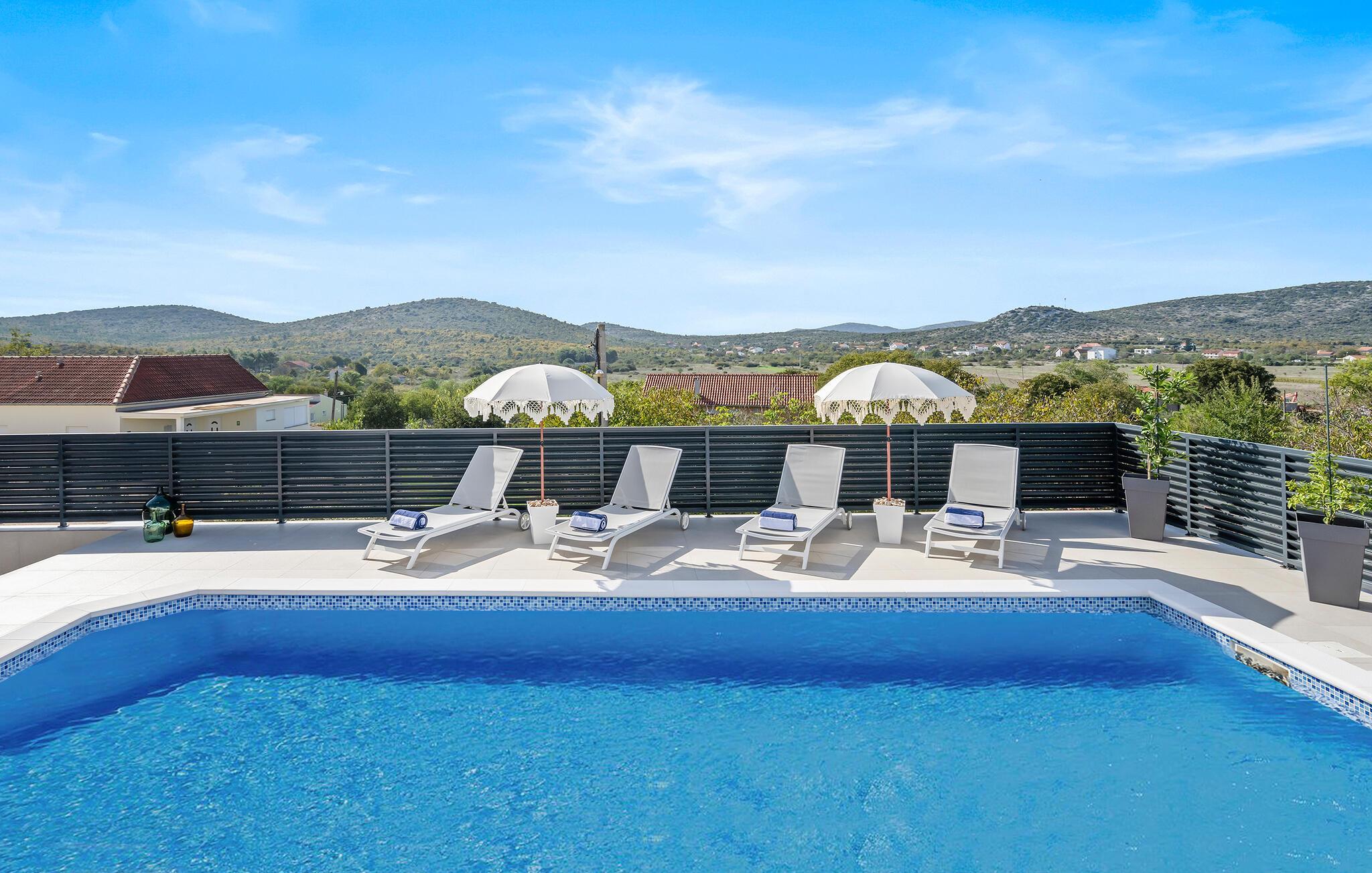 Genießen Sie die moderne Eleganz dieses Ferienhauses mit Pool und Terrassenblick.