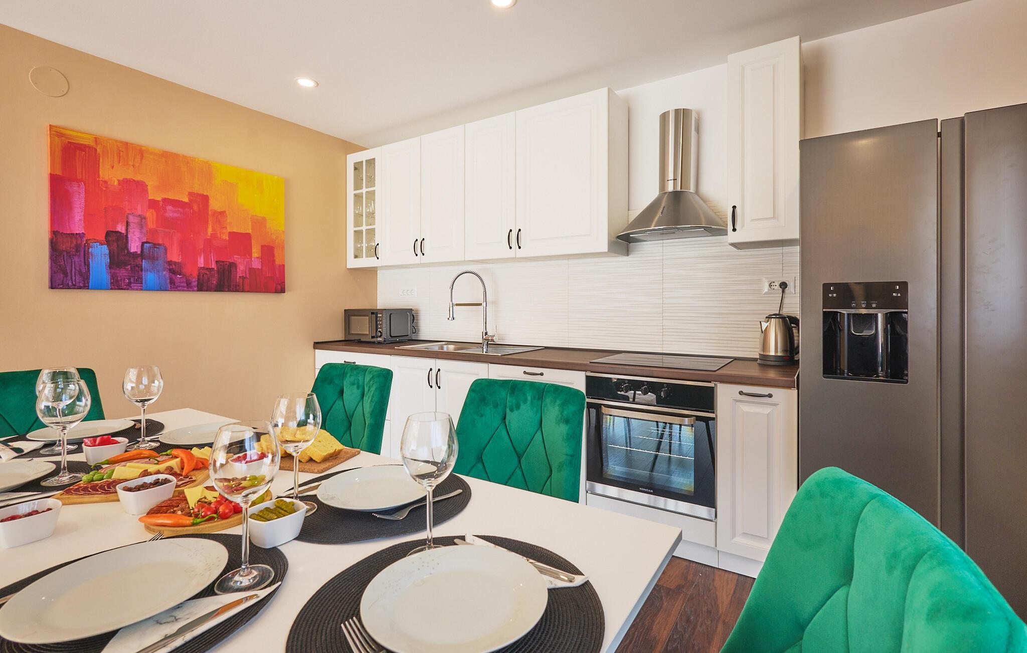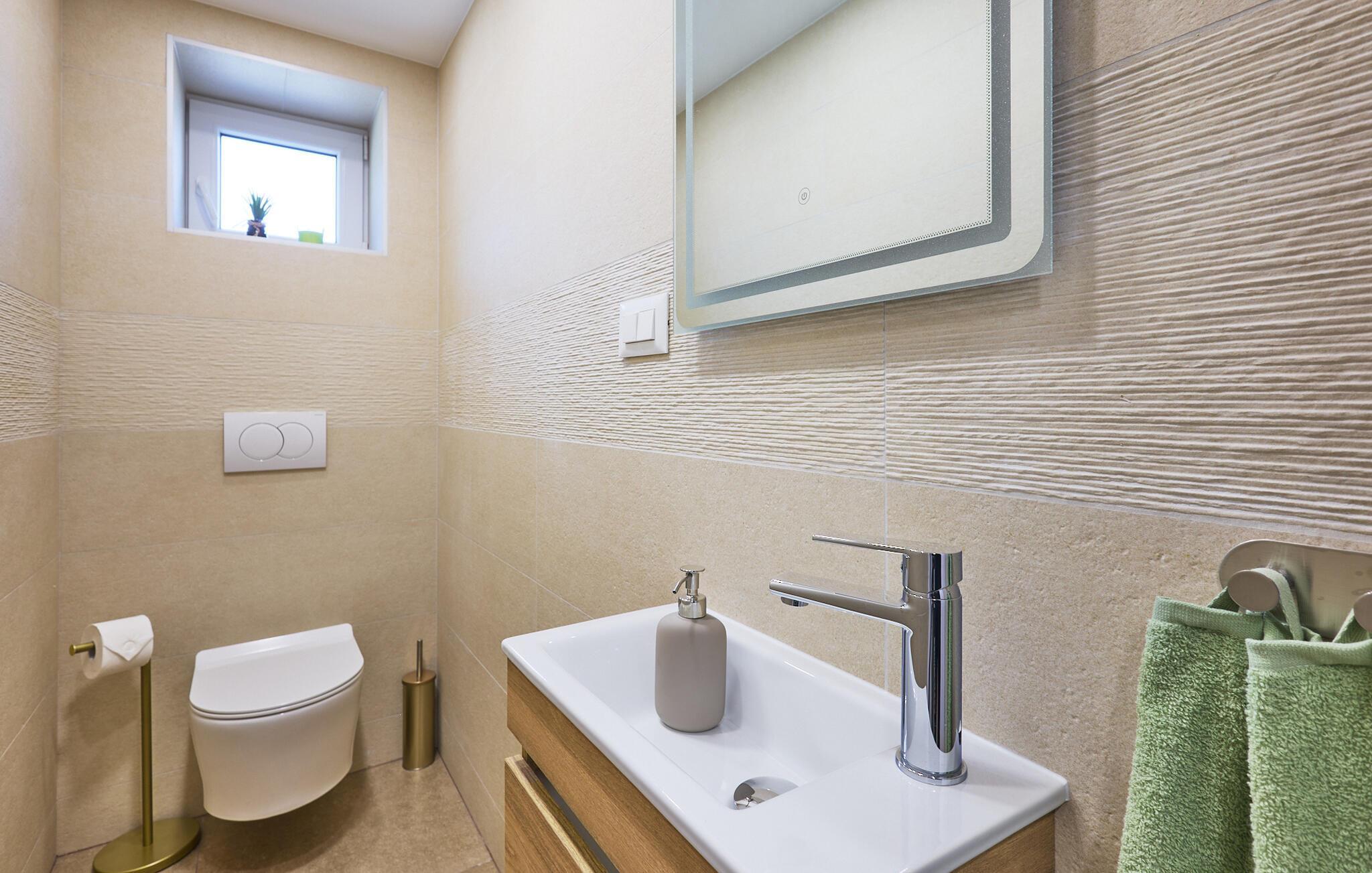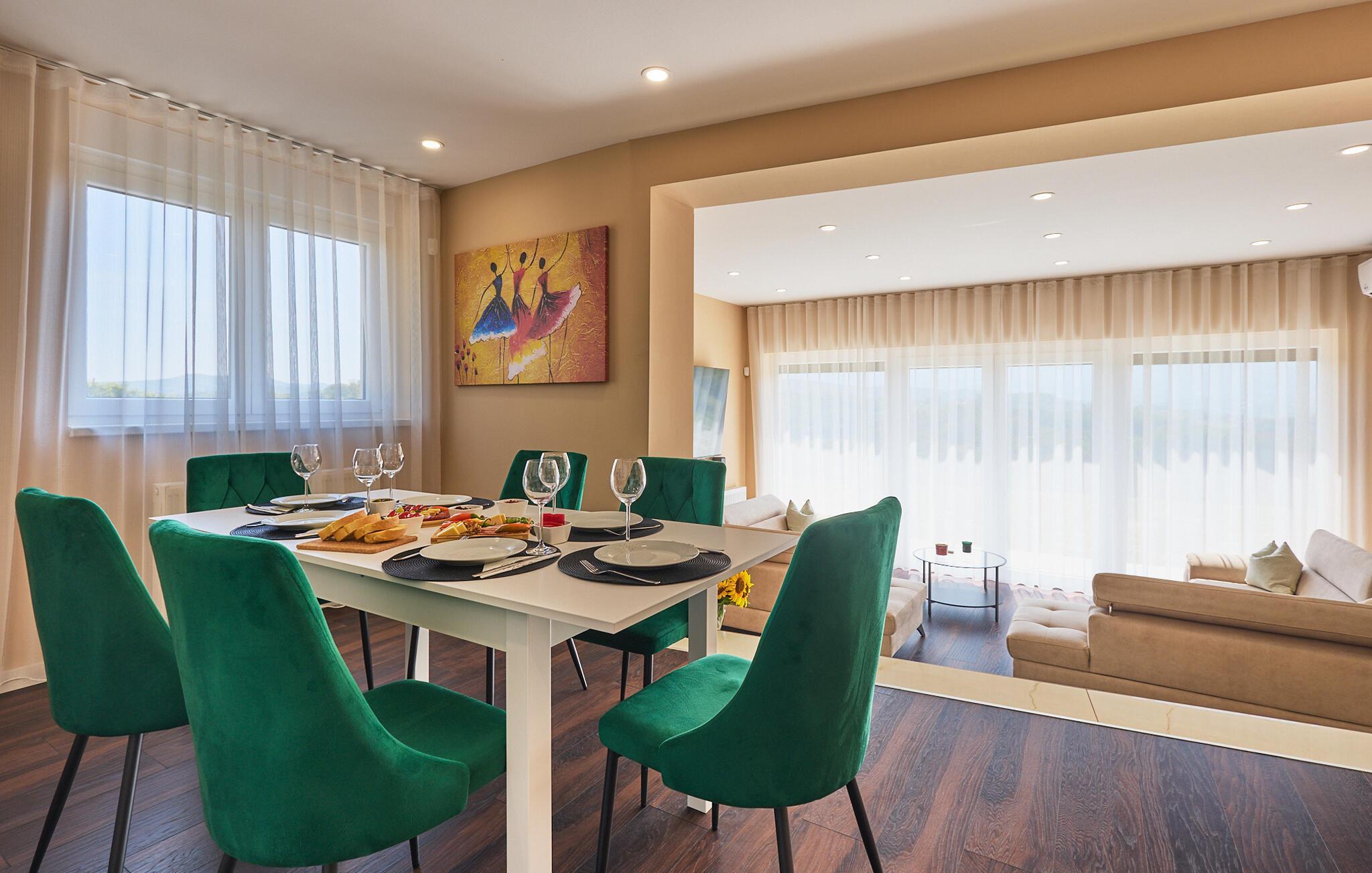 Das Innere Ihres Ferienhauses in Modrovec nahe Gornja Stubica ist elegant eingerichtet und bietet einen gemütlichen Wohnbereich mit großen Fenstern, die viel Tageslicht hereinlassen. Machen Sie es sich in der gemütlichen Sofalandschaft gemütlich oder bereiten Sie in der modernen Küche köstliche Speisen vor. Der angrenzende Esstisch ist ideal für gemeinsame Mahlzeiten mit der Familie und Freunden. Lassen Sie den Tag in der hauseigenen Sauna ausklingen und gönnen Sie sich einige Momente der Ruhe und Entspannung.