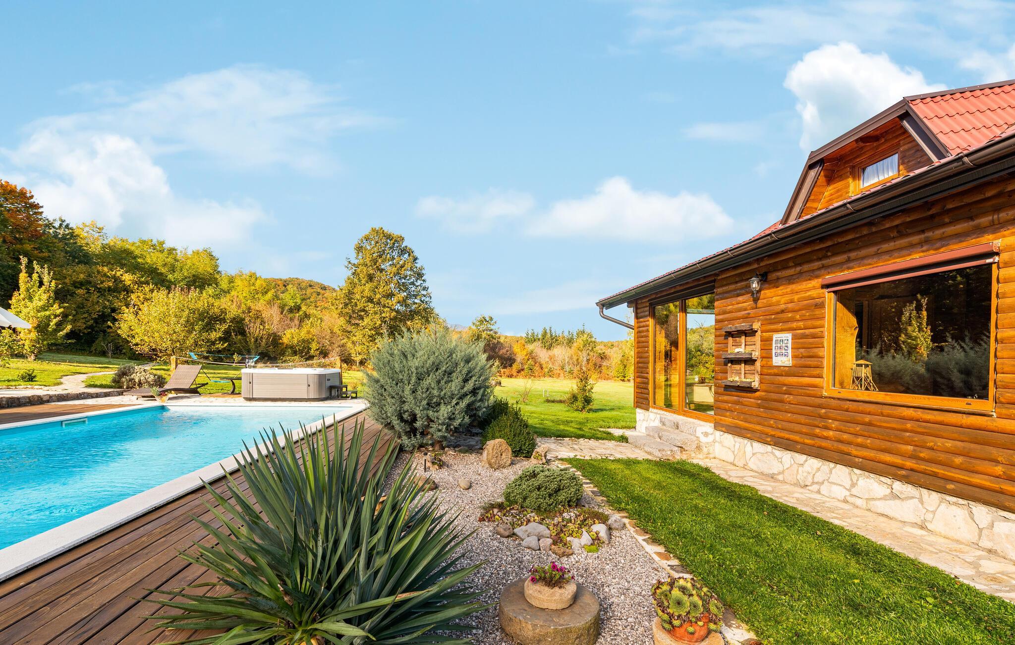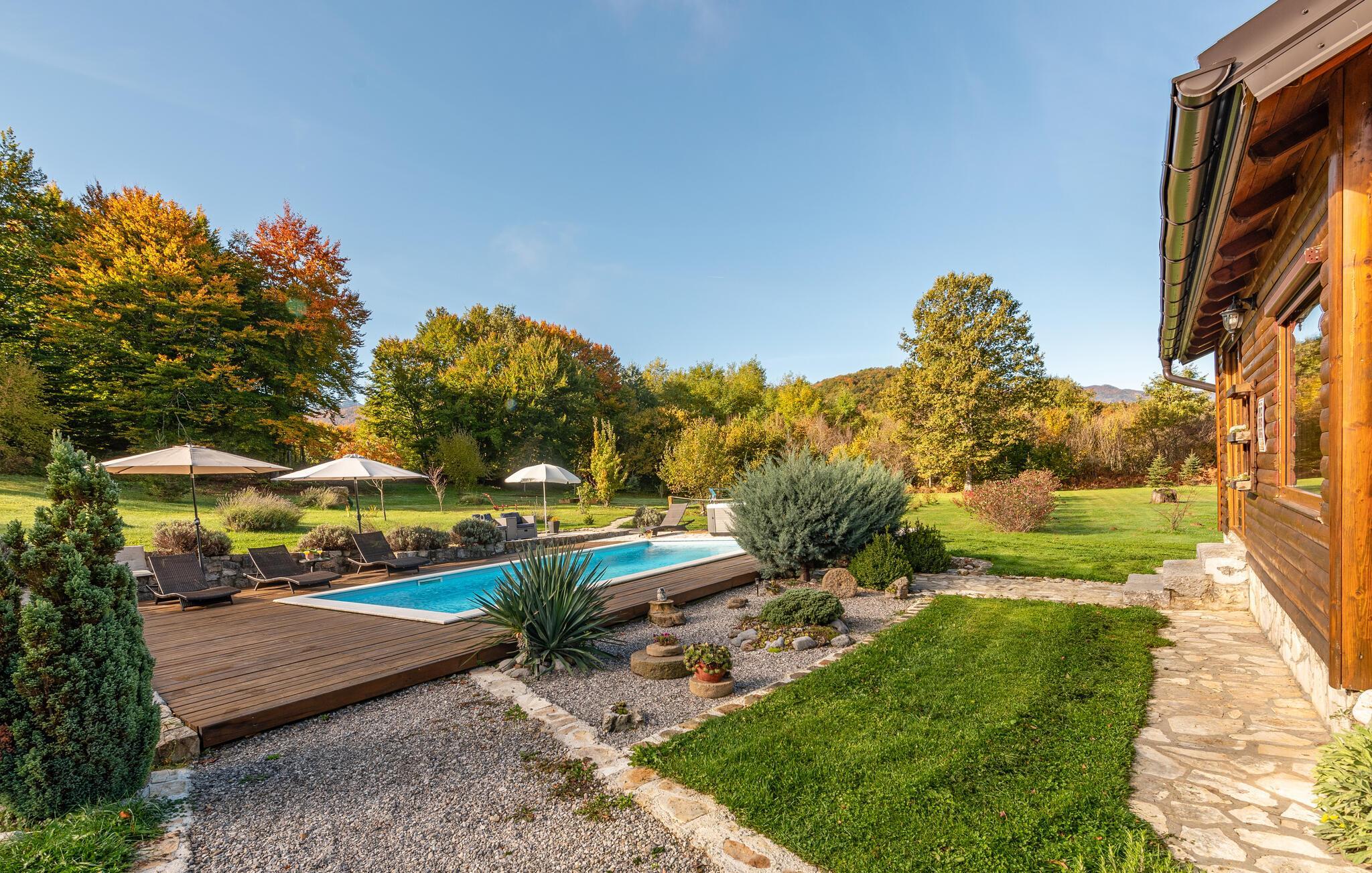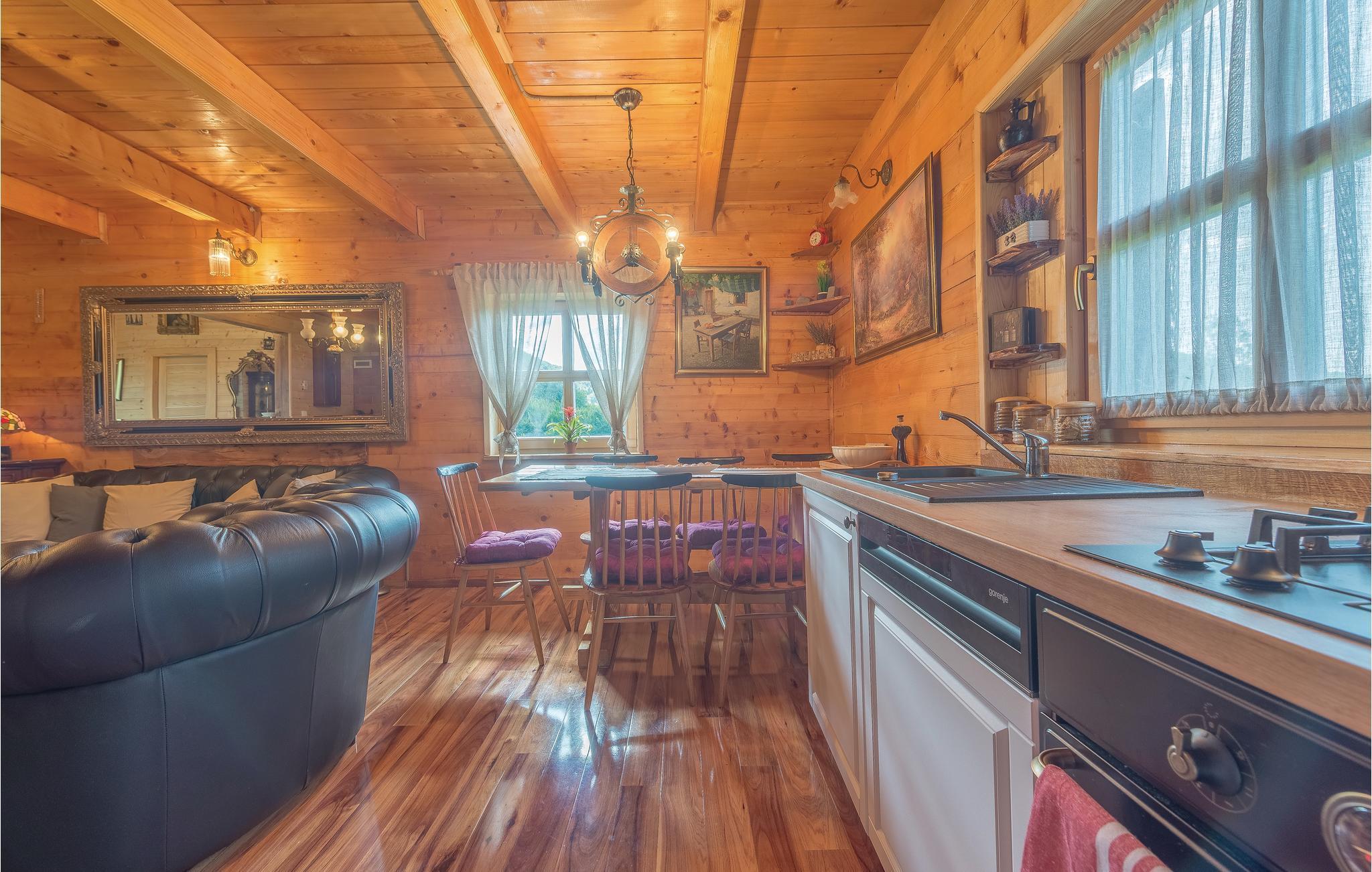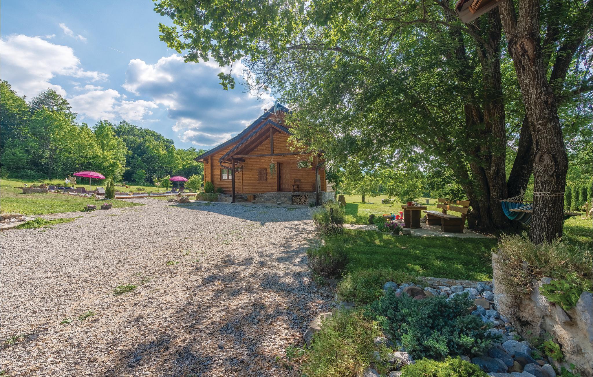 Dieses schöne Ferienhaus aus Holz mit Pool liegt einsam und ist von Natur und einer Rasenfläche umgeben. Es ist geschmackvoll und im traditionellen Stil eingerichtet, mit vielen Details aus Holz und Stein. Neben dem Haus ist der Pool mit Sonnenbereich, eine Außendusche und Sitzgarnitur. Es steht Ihnen auch eine Sommerküche mit gemauertem Grill zur Verfügung. Naturliebhaber werden sicherlich Spaziergänge in unberührter Natur, Radtouren, Gebirgswanderungen, Angeln in den umliegenden Seen und Flüssen sowie das Erforschen von Höhlen in der Nähe genießen. Unternehmen Sie Ausflüge zum Nationalpark der Plitwitzer Seen und in das Museum von Nikola Tesla in etwa 29 km Entfernung.