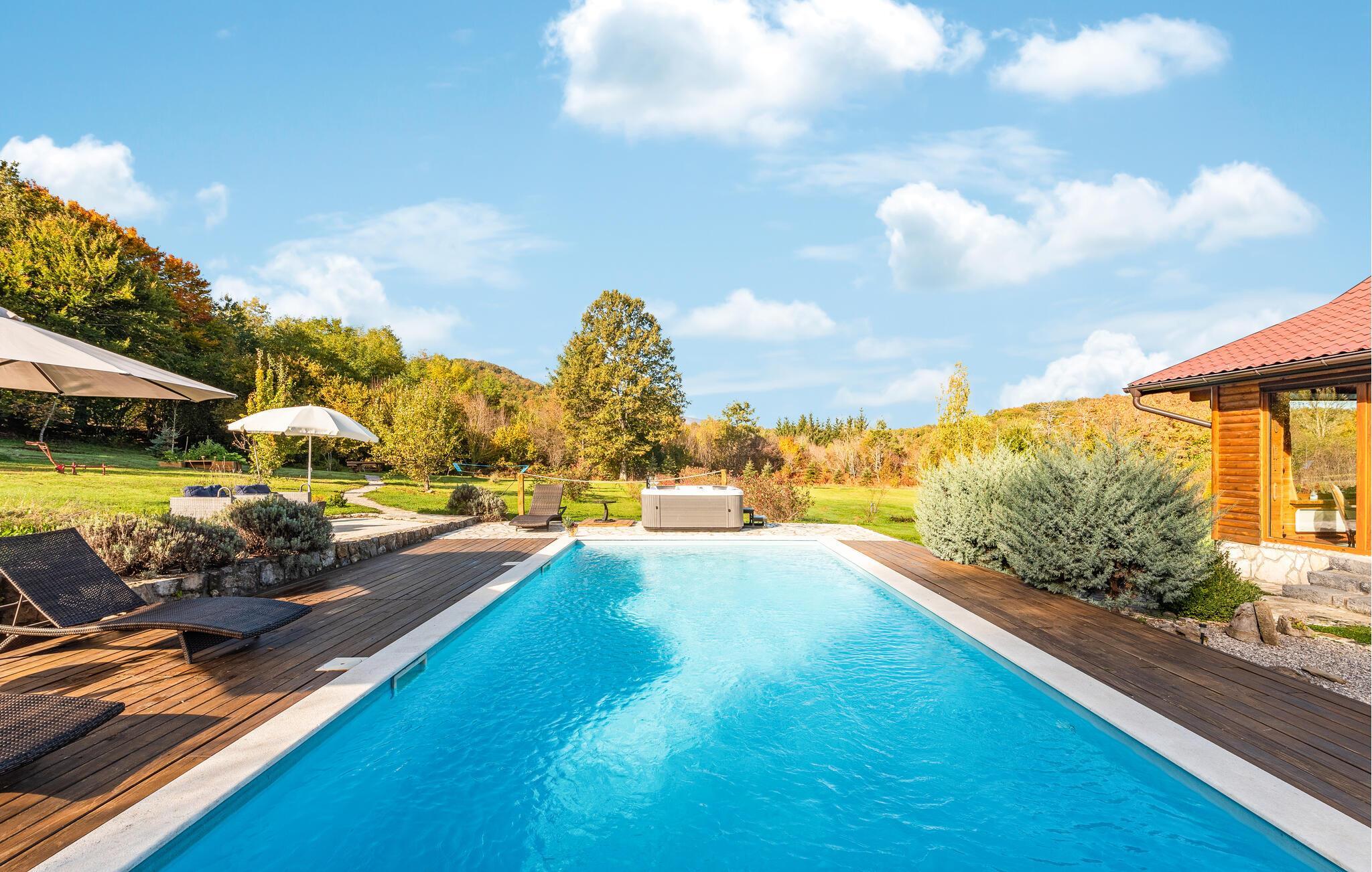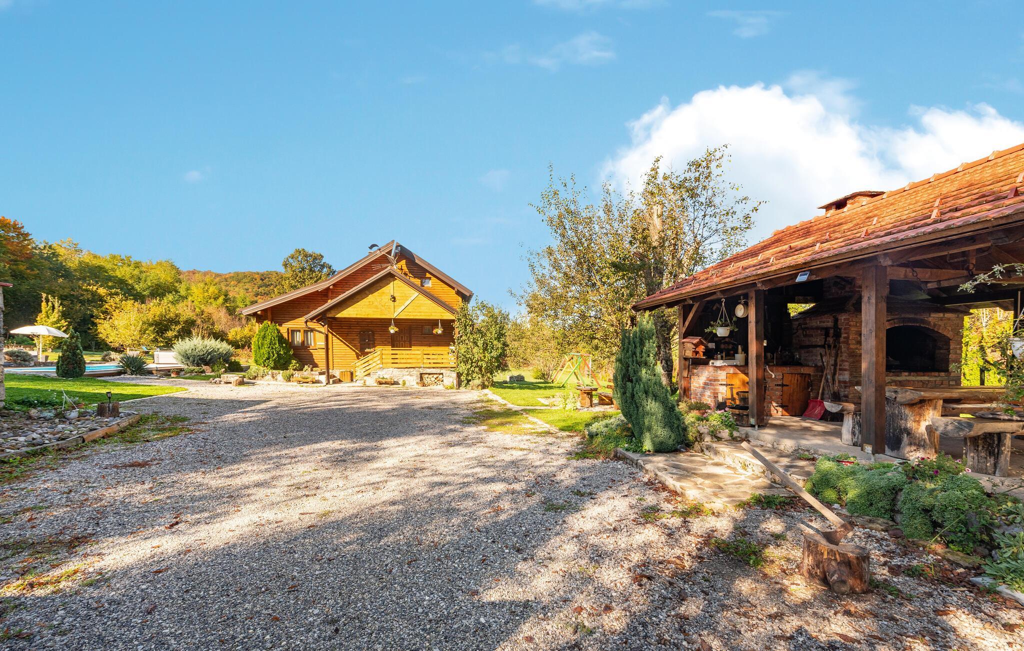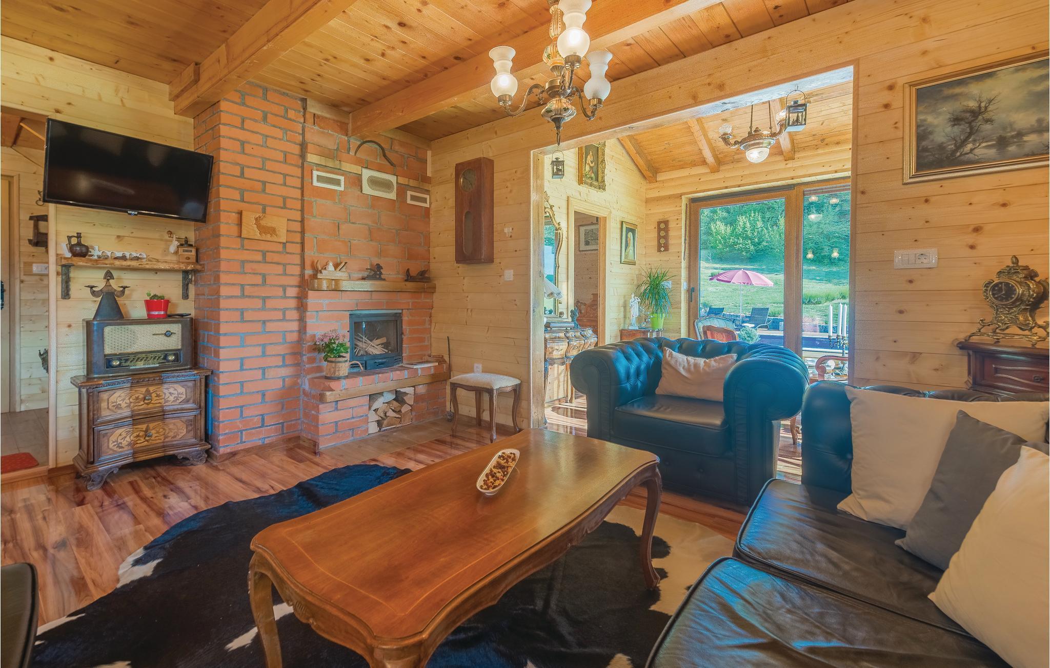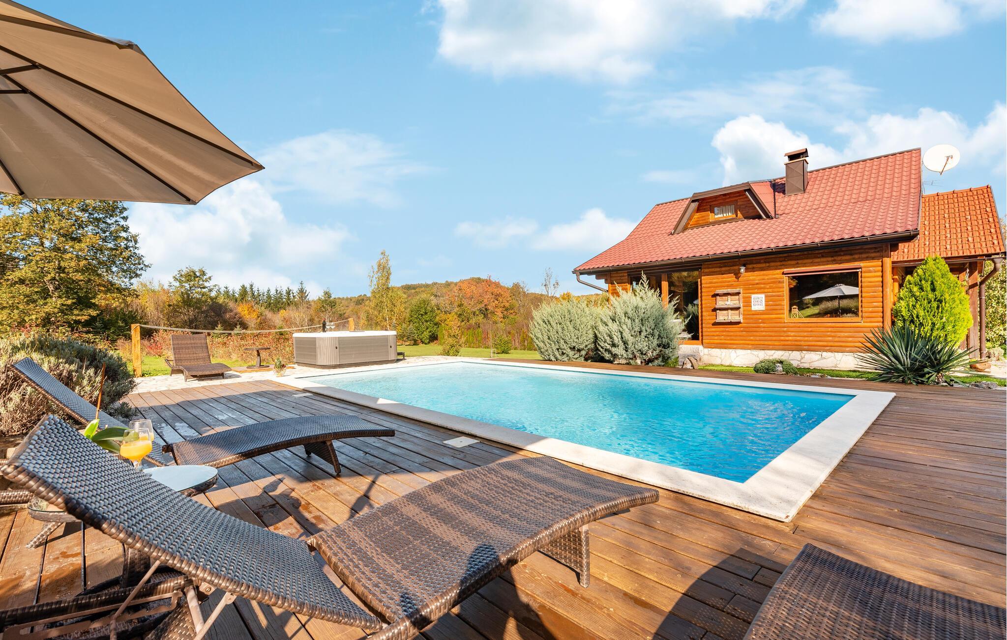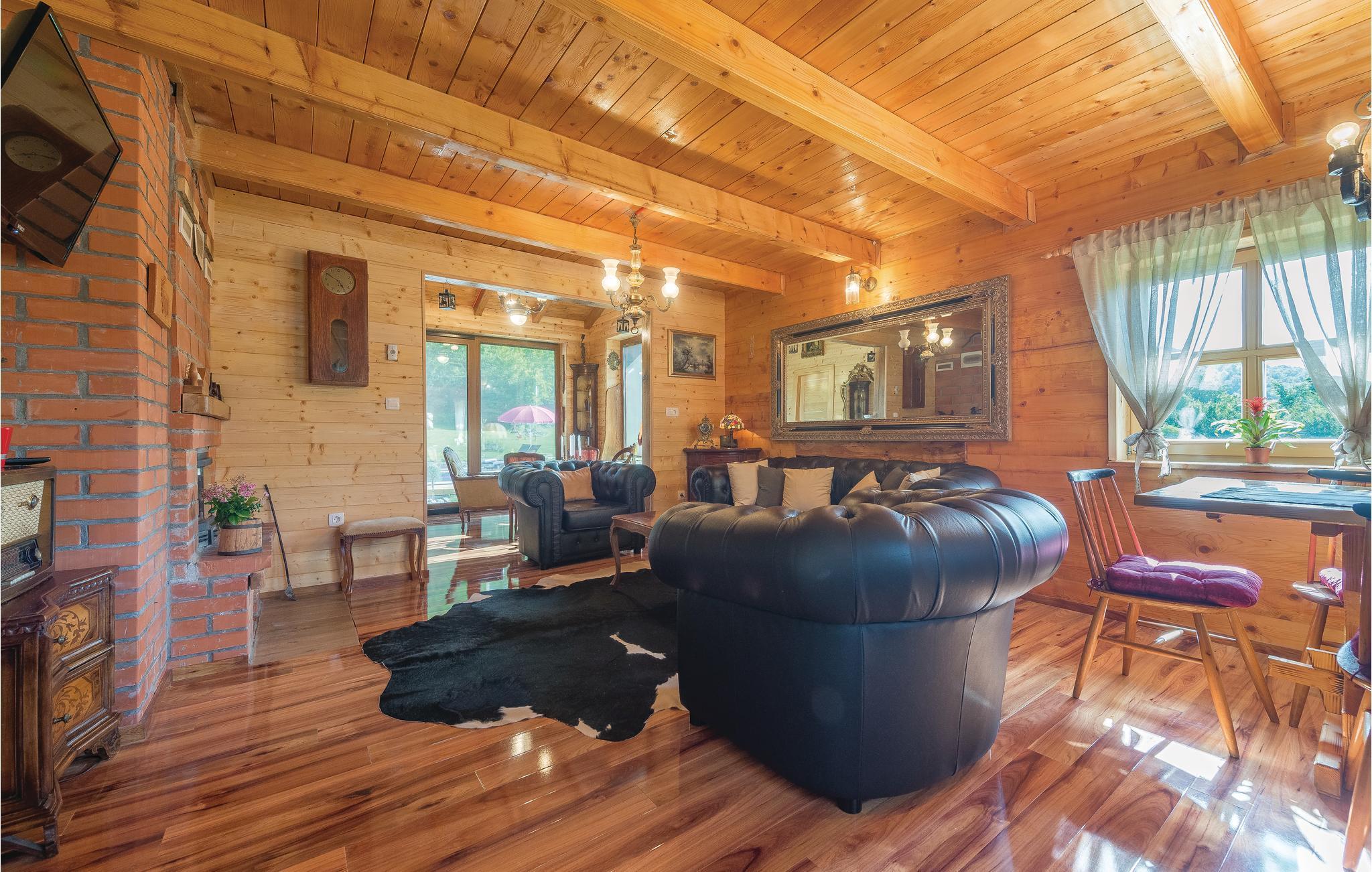 Dieses schöne Ferienhaus aus Holz mit Pool liegt einsam und ist von Natur und einer Rasenfläche umgeben. Es ist geschmackvoll und im traditionellen Stil eingerichtet, mit vielen Details aus Holz und Stein. Neben dem Haus ist der Pool mit Sonnenbereich, eine Außendusche und Sitzgarnitur. Es steht Ihnen auch eine Sommerküche mit gemauertem Grill zur Verfügung. Naturliebhaber werden sicherlich Spaziergänge in unberührter Natur, Radtouren, Gebirgswanderungen, Angeln in den umliegenden Seen und Flüssen sowie das Erforschen von Höhlen in der Nähe genießen. Unternehmen Sie Ausflüge zum Nationalpark der Plitwitzer Seen und in das Museum von Nikola Tesla in etwa 29 km Entfernung.