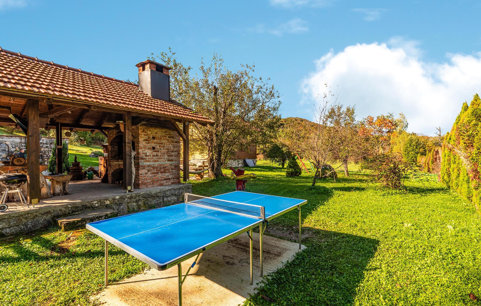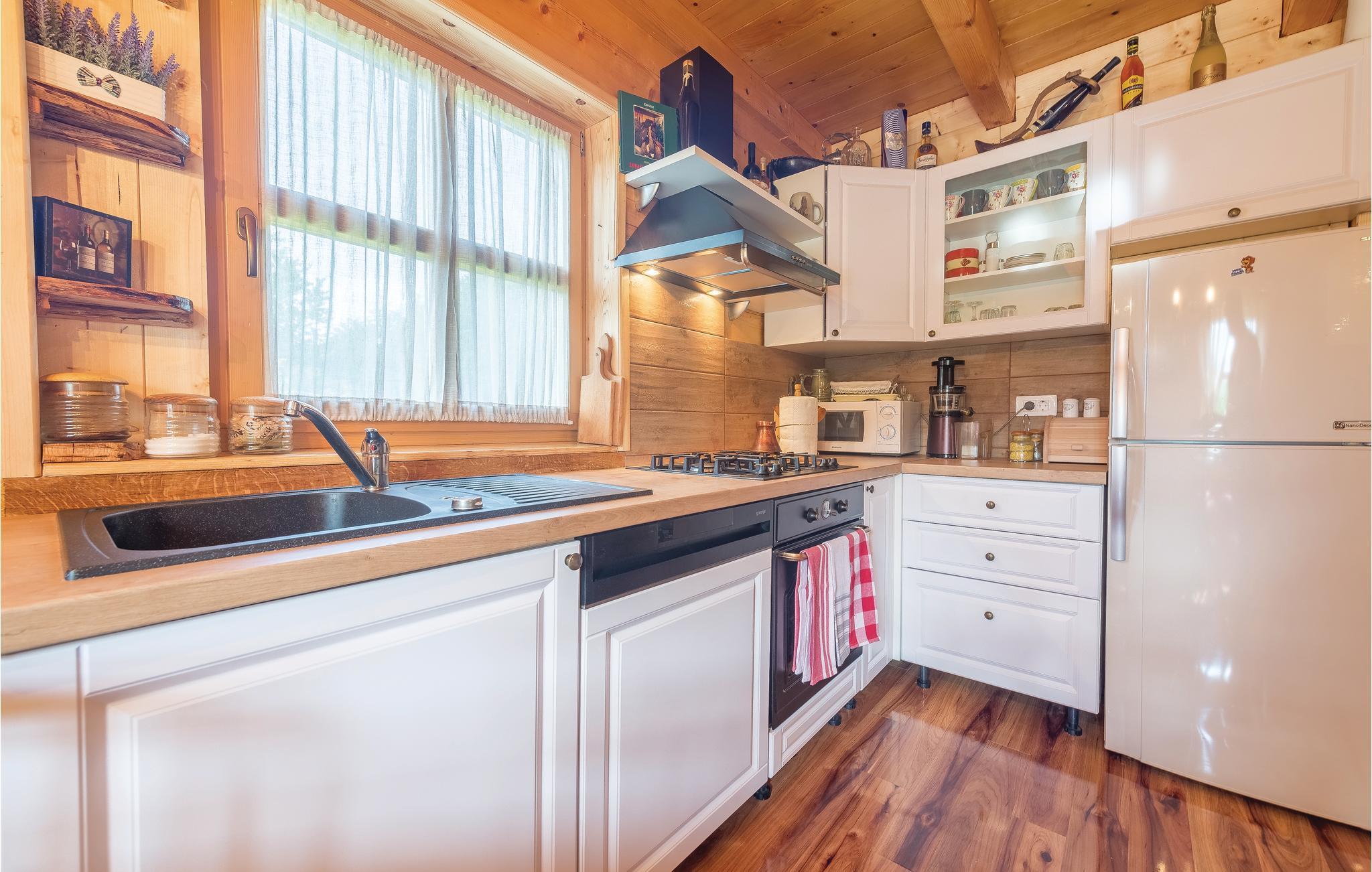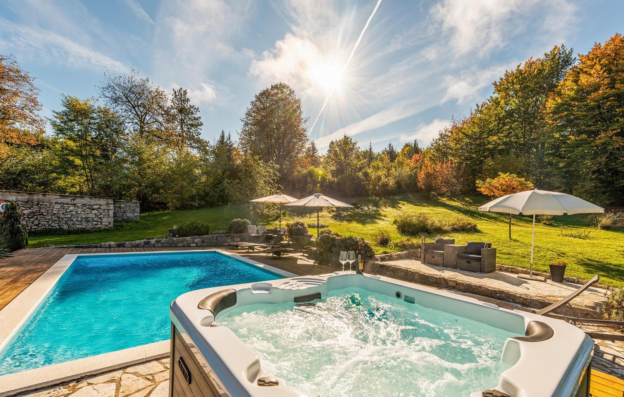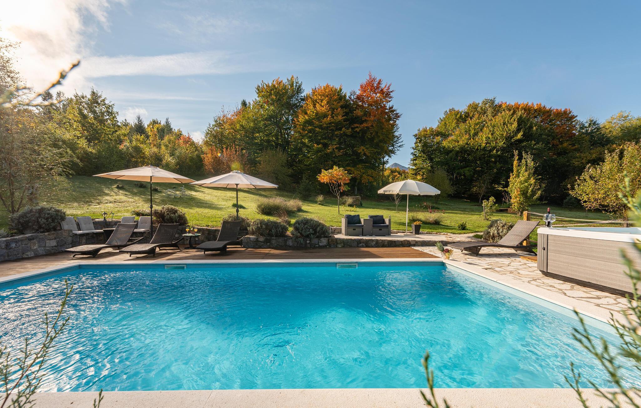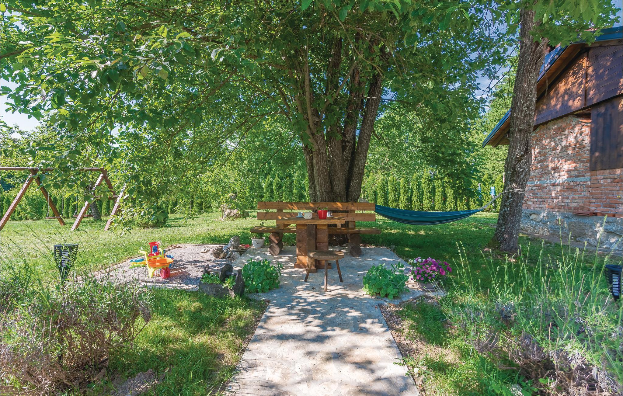 Dieses schöne Ferienhaus aus Holz mit Pool liegt einsam und ist von Natur und einer Rasenfläche umgeben. Es ist geschmackvoll und im traditionellen Stil eingerichtet, mit vielen Details aus Holz und Stein. Neben dem Haus ist der Pool mit Sonnenbereich, eine Außendusche und Sitzgarnitur. Es steht Ihnen auch eine Sommerküche mit gemauertem Grill zur Verfügung. Naturliebhaber werden sicherlich Spaziergänge in unberührter Natur, Radtouren, Gebirgswanderungen, Angeln in den umliegenden Seen und Flüssen sowie das Erforschen von Höhlen in der Nähe genießen. Unternehmen Sie Ausflüge zum Nationalpark der Plitwitzer Seen und in das Museum von Nikola Tesla in etwa 29 km Entfernung.