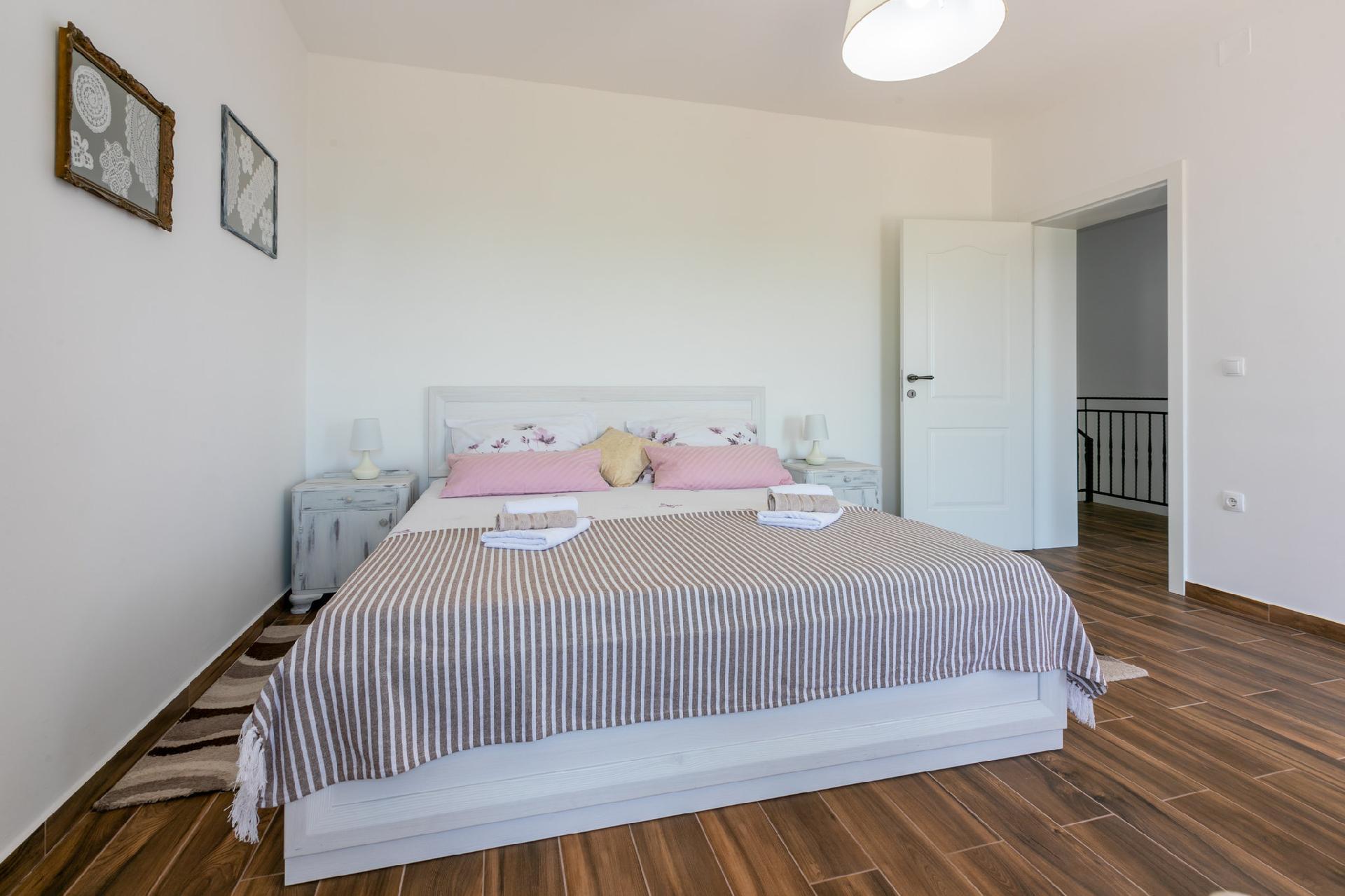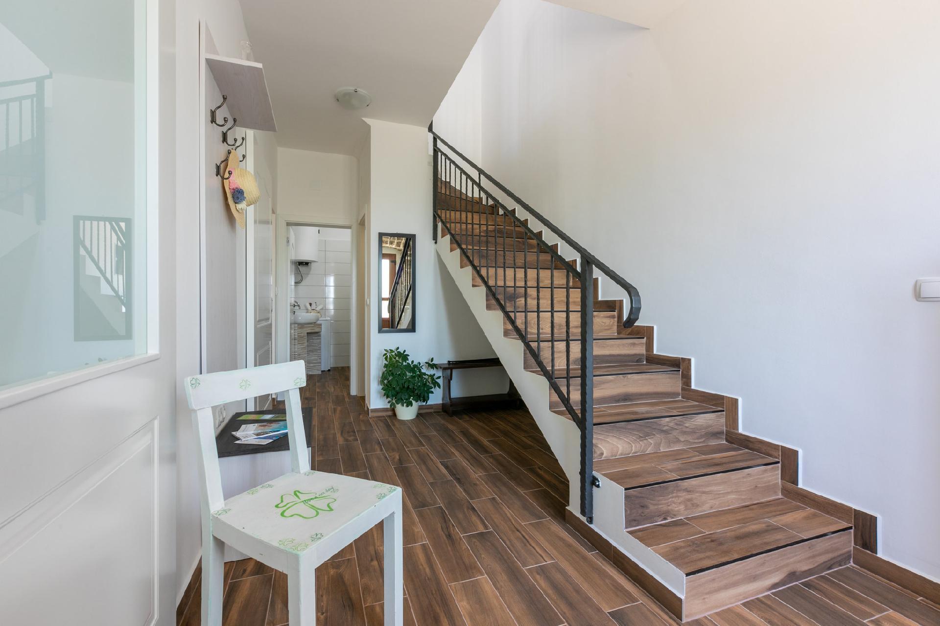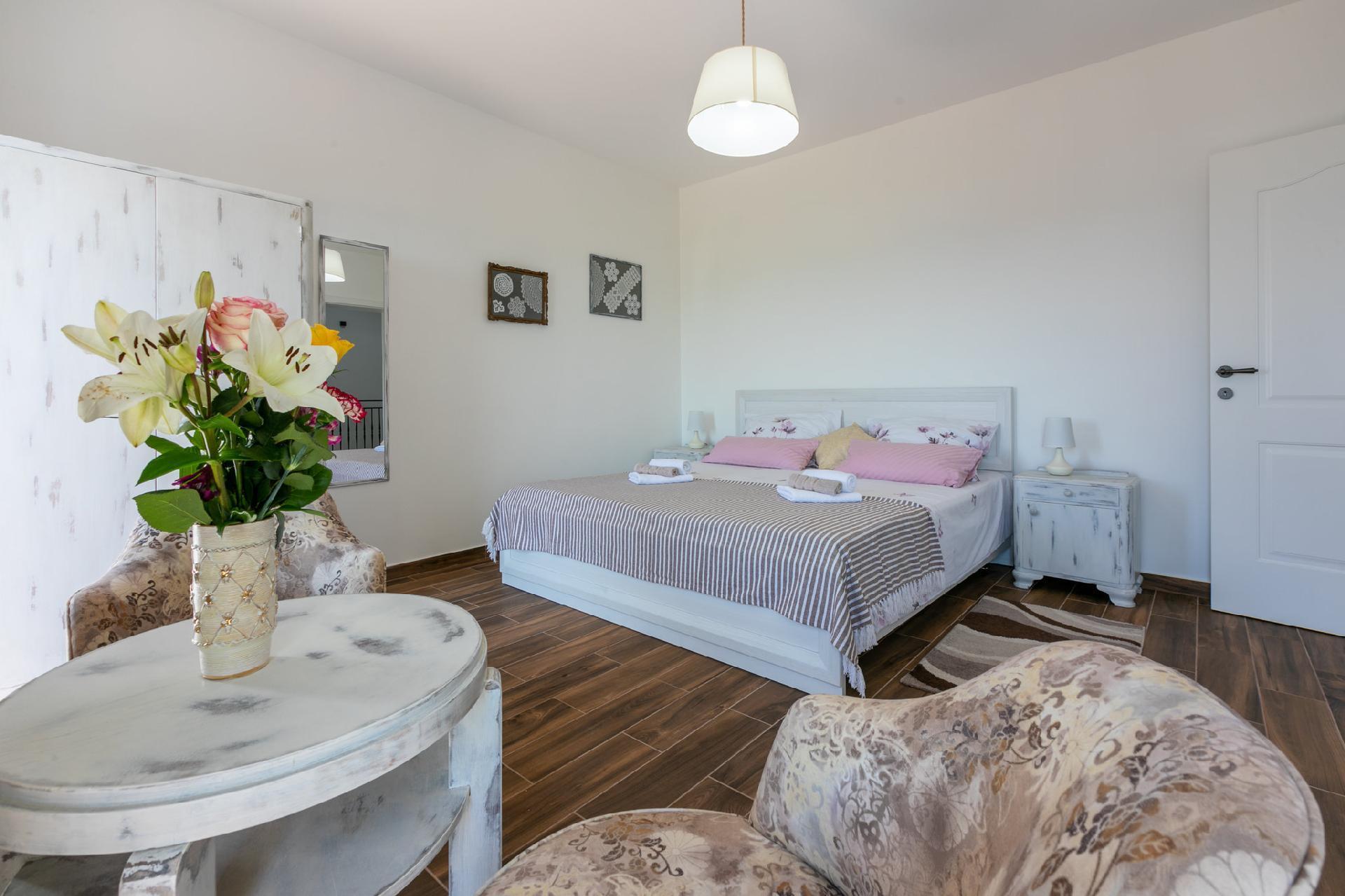 Newly renovated holiday home in 2021, with newly created swimming pool and pool area.This cozy holiday home is located away from the daily hustle and bustle but not far from the sea and the beautiful beaches.This holiday property consists of a house on two floors and a very nice outdoor area.On the ground floor of the house there is a spacious living / dining room with a well-equipped kitchen, a bathroom (with underfloor heating), a separate toilet and the entrance area from which you have access to the terrace and the internal staircase which leads to the 1st floor. If required, the living area has a sofa bed for 2 people, a smart TV with satellite connection and a PlayStation3 game console. Air conditioning ensures a pleasant temperature.On the first floor there are three bedrooms and another bathroom (with underfloor heating) available to the guests of this house. All three bedrooms are equipped with televisions (SmartTV) and air conditioning. One of the three bedrooms has bunk beds and two have double beds, one of which also has a cot. Two bedrooms have access to the balcony and a sea view. All rooms are equipped with mosquito nets.The very pleasant outdoor area consists of a front terrace and the centerpiece behind the house, the 32 m² swimming pool and a wonderful pool area. This is equipped with 8 sun loungers, a large table with seating for everyone, a gas grill, a sink, an outdoor shower, a toilet and an additional refrigerator.For the little guests of this house there is a play area with a trampoline.A small herb garden can be used by cooking lovers.In the pleasant surroundings of the house there are beautiful hiking trails that lead to the numerous peaks in this area.Living area: Living / dining room and kitchen are one room Sofa bed for two people terrace Sea view Tiles radio Satellite TVKitchen: kitchen dishes Kitchen towels Electric stove Hotplates: 4 Oven Fridge with freezer compartment Filter coffee machine water heater microwave Toaster dishwasherBedroom: Double room with double bed, balcony, sea view, tiles Double room with double bed, cot, 1 extra bed, sea view, tiles Room with bunk bed, balcony, sea view, tilesBathroom: Bathroom with toilet, shower Bathroom with toilet, shower separate toiletBalcony & terrace: own balcony Sea view Seating Balcony size: 8 m² own terrace partially covered Sea view Seating Terrace size: 24 m²Additional Information:Garden for use, gas grill available, parking on the property, swimming pool available, swimming pool size: 32 m², children's pool available, outdoor shower, pets allowed, daily fee for pets: per day: 5.00 €, heating available, daily heating fee: 5.00 € , Air conditioning included in the price, bed linen available, towels available, hairdryer available, washing machine available in the house, Internet via W-LAN, safe available, bicycles available on request.