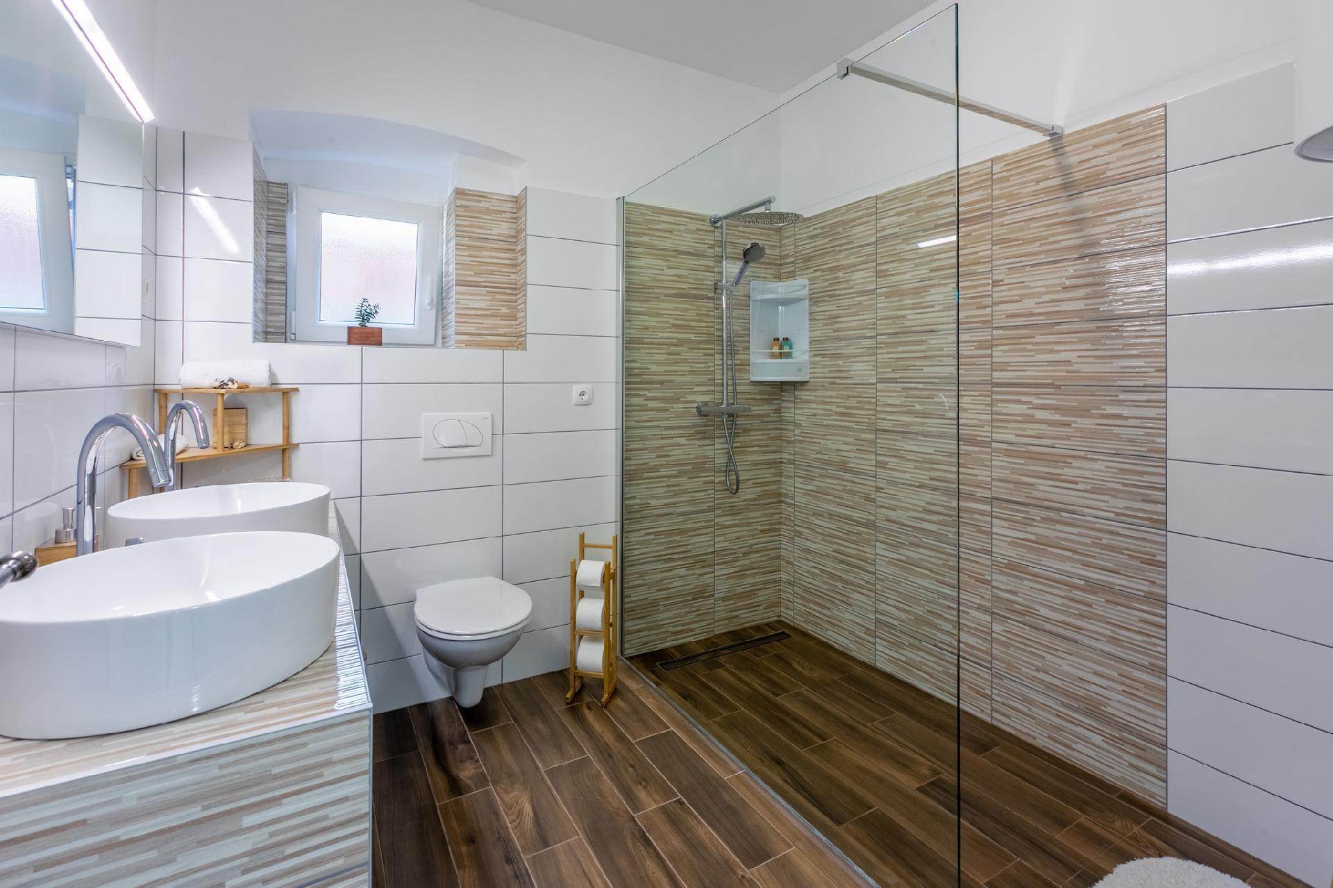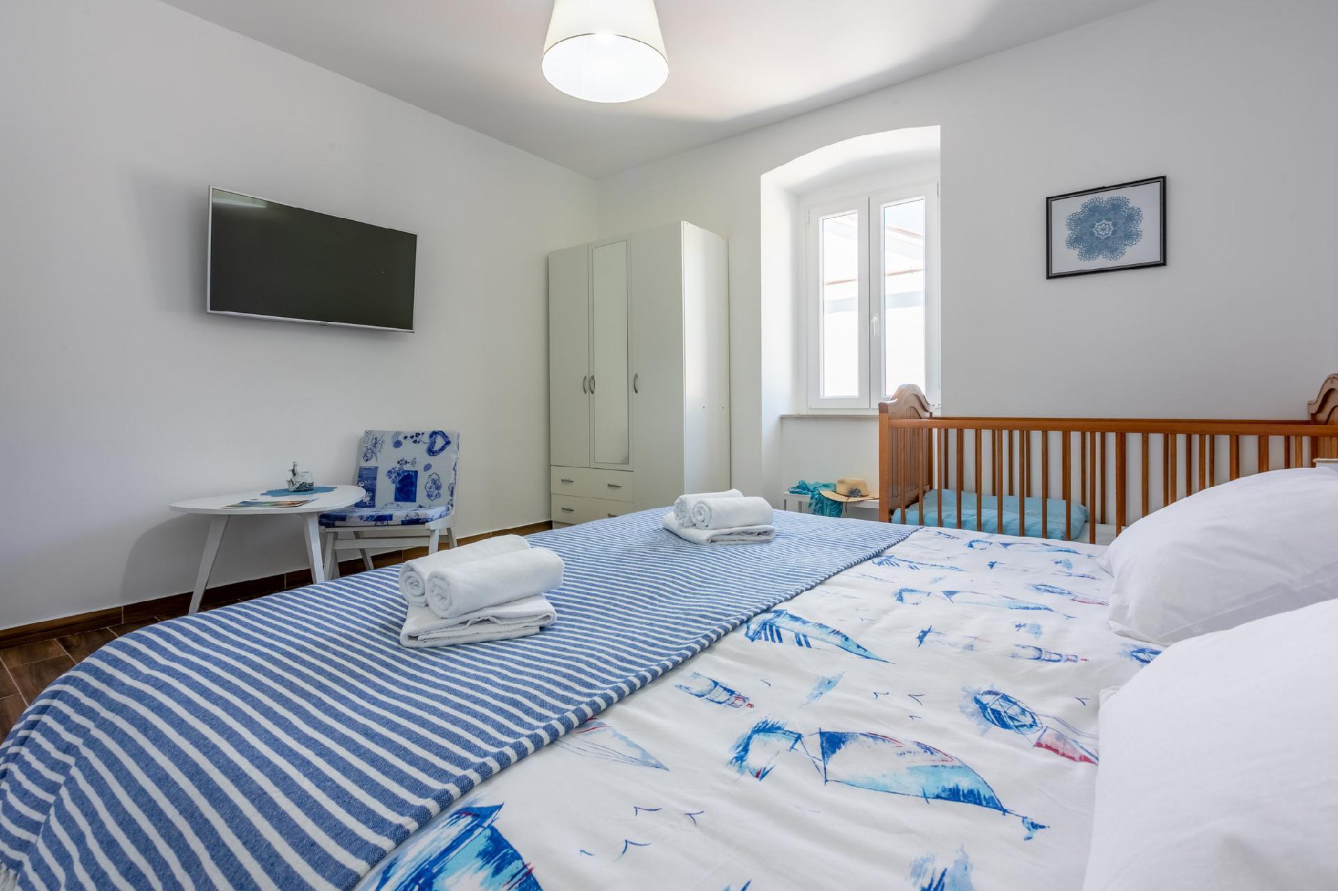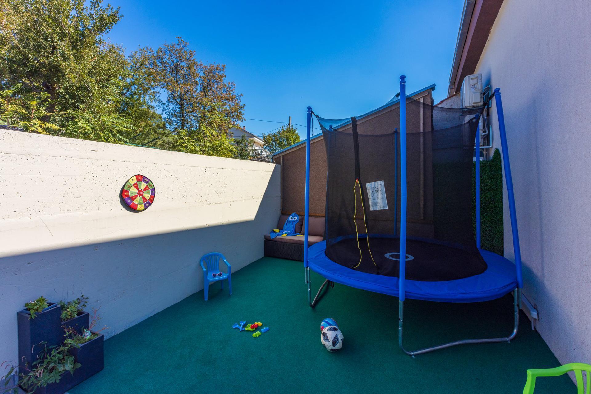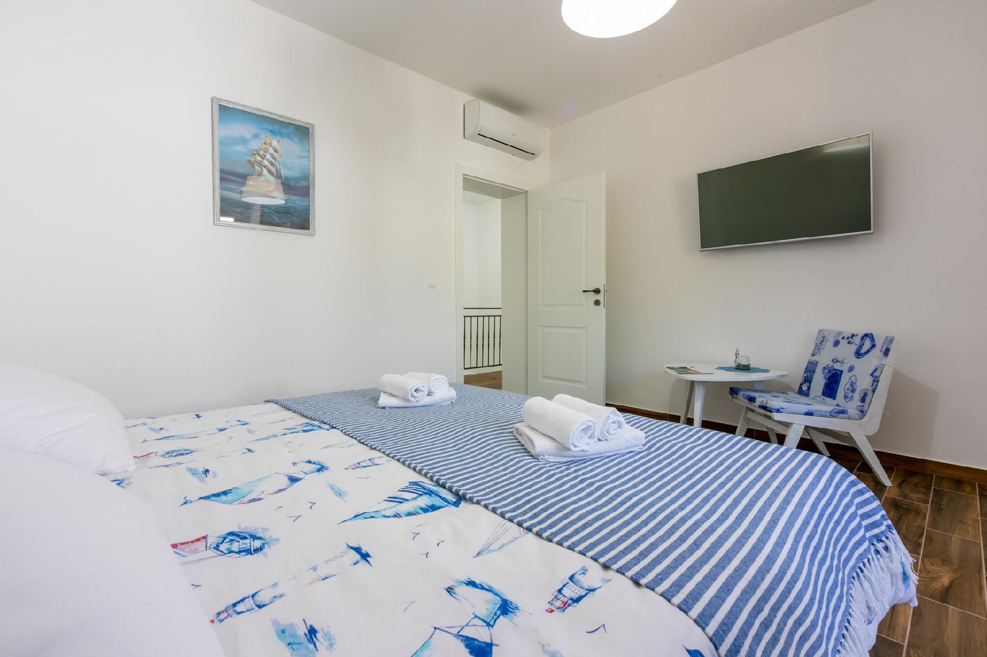 Newly renovated holiday home in 2021, with newly created swimming pool and pool area.This cozy holiday home is located away from the daily hustle and bustle but not far from the sea and the beautiful beaches.This holiday property consists of a house on two floors and a very nice outdoor area.On the ground floor of the house there is a spacious living / dining room with a well-equipped kitchen, a bathroom (with underfloor heating), a separate toilet and the entrance area from which you have access to the terrace and the internal staircase which leads to the 1st floor. If required, the living area has a sofa bed for 2 people, a smart TV with satellite connection and a PlayStation3 game console. Air conditioning ensures a pleasant temperature.On the first floor there are three bedrooms and another bathroom (with underfloor heating) available to the guests of this house. All three bedrooms are equipped with televisions (SmartTV) and air conditioning. One of the three bedrooms has bunk beds and two have double beds, one of which also has a cot. Two bedrooms have access to the balcony and a sea view. All rooms are equipped with mosquito nets.The very pleasant outdoor area consists of a front terrace and the centerpiece behind the house, the 32 m² swimming pool and a wonderful pool area. This is equipped with 8 sun loungers, a large table with seating for everyone, a gas grill, a sink, an outdoor shower, a toilet and an additional refrigerator.For the little guests of this house there is a play area with a trampoline.A small herb garden can be used by cooking lovers.In the pleasant surroundings of the house there are beautiful hiking trails that lead to the numerous peaks in this area.Living area: Living / dining room and kitchen are one room Sofa bed for two people terrace Sea view Tiles radio Satellite TVKitchen: kitchen dishes Kitchen towels Electric stove Hotplates: 4 Oven Fridge with freezer compartment Filter coffee machine water heater microwave Toaster dishwasherBedroom: Double room with double bed, balcony, sea view, tiles Double room with double bed, cot, 1 extra bed, sea view, tiles Room with bunk bed, balcony, sea view, tilesBathroom: Bathroom with toilet, shower Bathroom with toilet, shower separate toiletBalcony & terrace: own balcony Sea view Seating Balcony size: 8 m² own terrace partially covered Sea view Seating Terrace size: 24 m²Additional Information:Garden for use, gas grill available, parking on the property, swimming pool available, swimming pool size: 32 m², children's pool available, outdoor shower, pets allowed, daily fee for pets: per day: 5.00 €, heating available, daily heating fee: 5.00 € , Air conditioning included in the price, bed linen available, towels available, hairdryer available, washing machine available in the house, Internet via W-LAN, safe available, bicycles available on request.