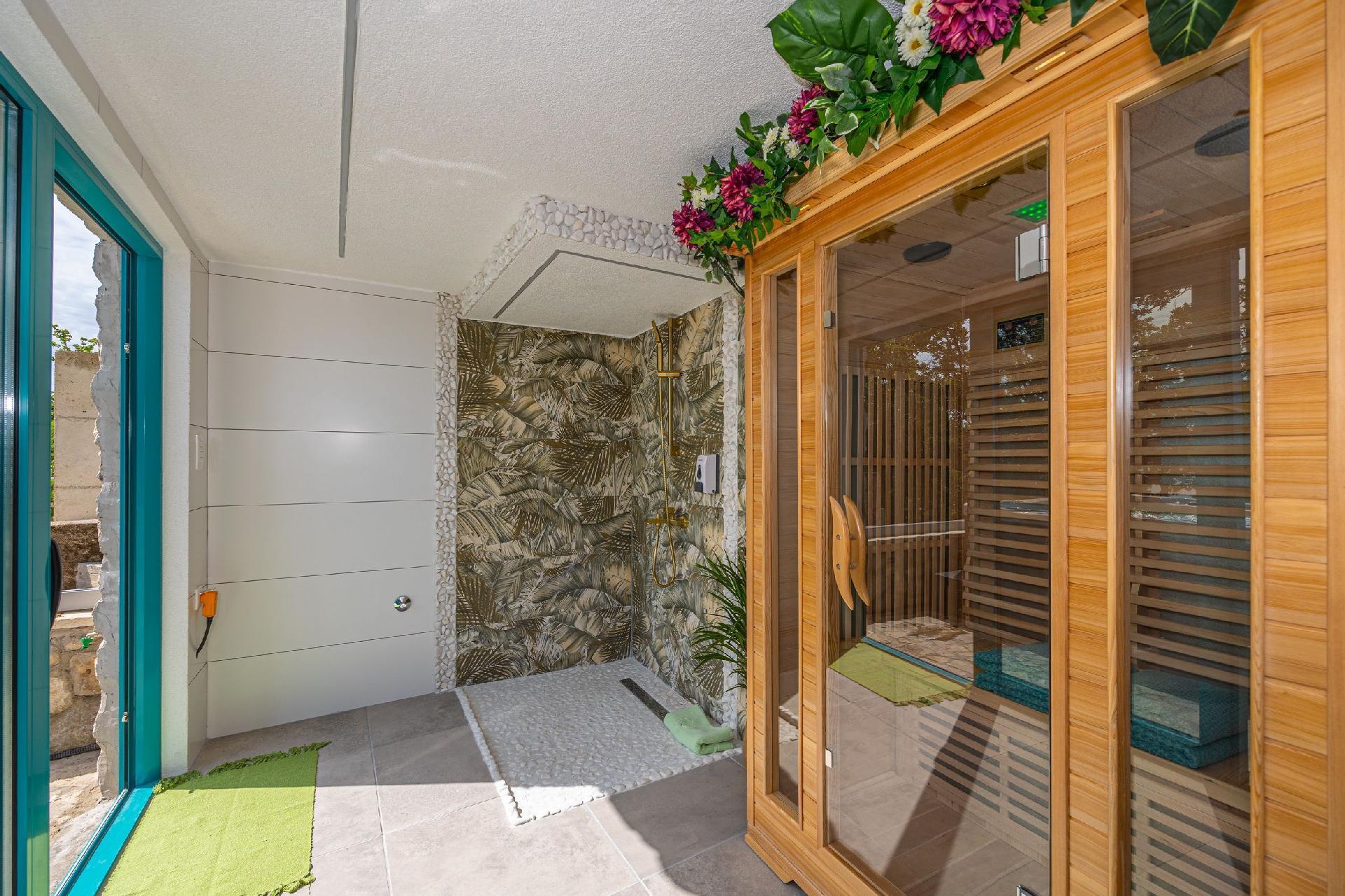 Inside, the villa impresses with comfortable furnishings that leave nothing to be desired. Three inviting bedrooms, each with its own bathroom, ensure privacy and comfort for all guests. A washing machine for exclusive use adds to the comfort. The living areas are equipped with air conditioning throughout, ensuring pleasant temperatures at any time of year. The technical equipment includes a dishwasher, an induction hob, a kettle and a coffee machine, which make everyday life easier and ensure culinary delights.