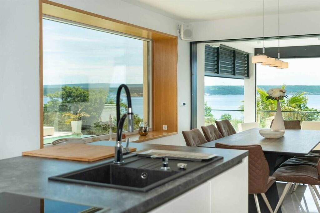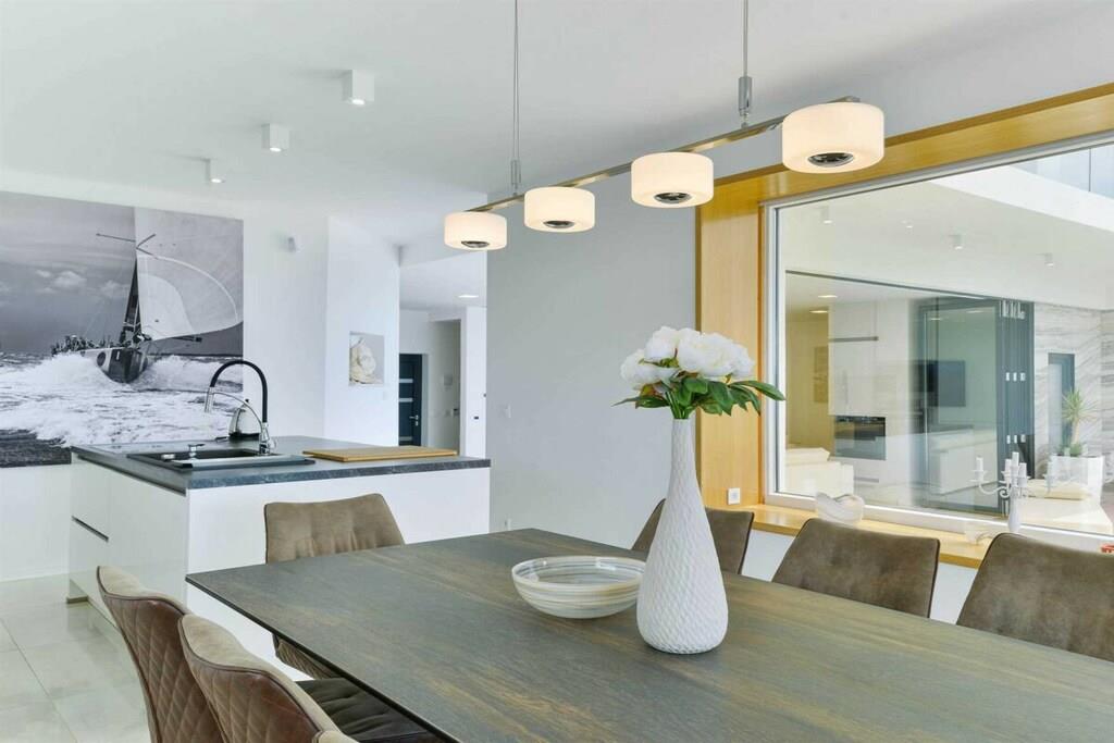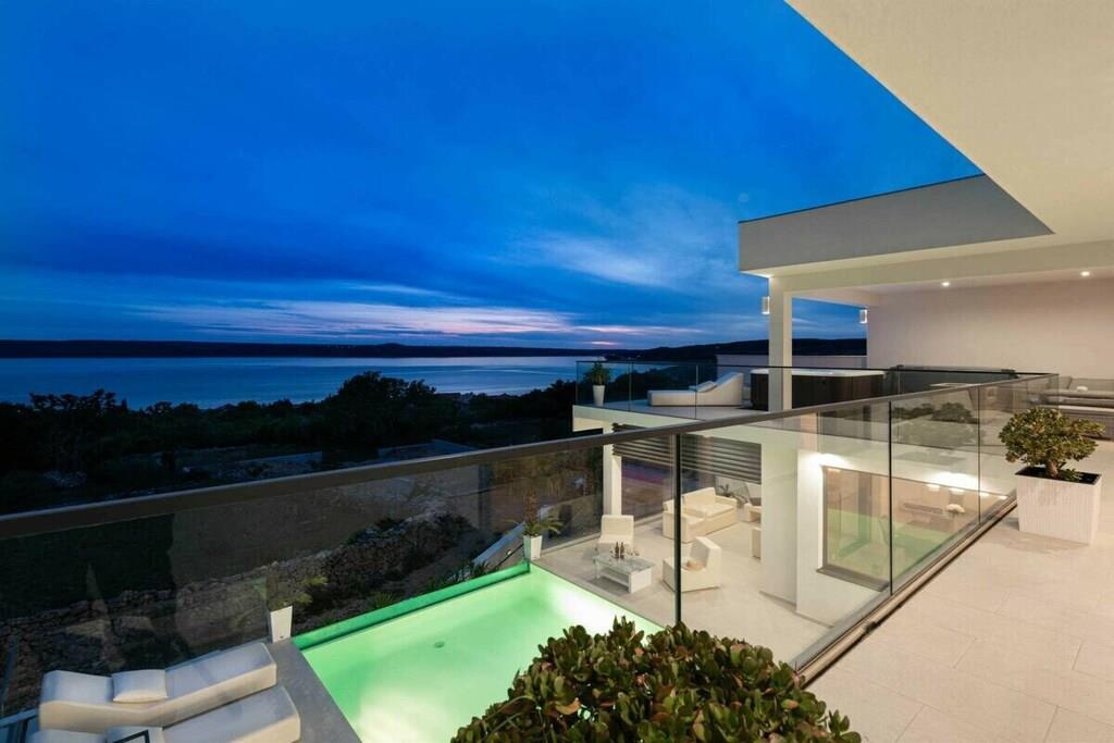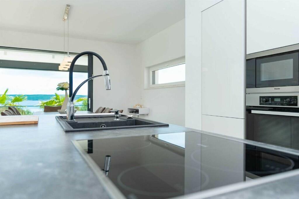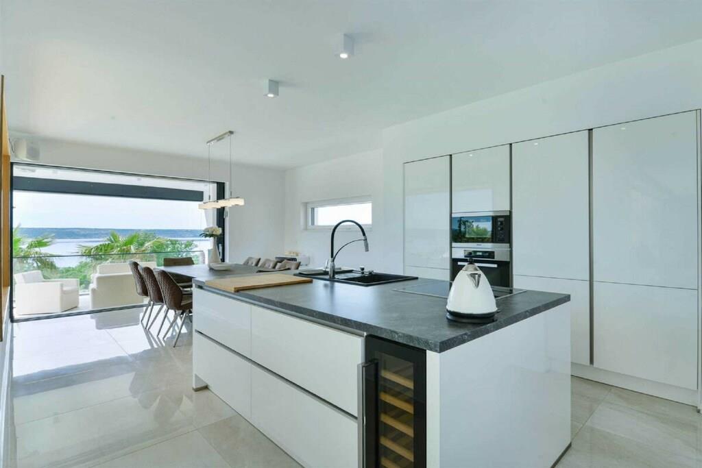 Diese brandneue, erstaunliche und luxuriöse 5-Sterne-Villa befindet sich in Maslenica, einer kleinen Stadt am Ufer des Novigrad-Meeres. Es ist von grüner Vegetation umgeben und blickt auf die wunderschöne Adria, die von jedem Zimmer der Villa aus zu sehen ist. Die Villa verfügt über 4 luxuriöse, klimatisierte Schlafzimmer mit Doppelbetten. Die Schlafzimmer haben ein eigenes Badezimmer mit Dusche. Im ersten Stock befinden sich drei Schlafzimmer, drei Badezimmer und eine große Terrasse mit einem entspannenden Whirlpool. Das Erdgeschoss verfügt über ein Wohnzimmer, Küche, Schlafzimmer, Bad, WC und einen Pool. Es gibt einen Außen- und einen Innenspeisesaal mit 8 Sitzplätzen. Neben dem Speisesaal im Freien befindet sich ein Gasgrill im Freien. Die Küche ist komplett mit hochwertigen Geräten ausgestattet. Das Äußere der Villa umfasst einen geräumigen Innenhof mit einem luxuriösen beheizten Infinity-Pool mit zwei zusätzlichen Außenduschen. Der Hof ist eingezäunt, sodass Sie Ihre Privatsphäre genießen können.