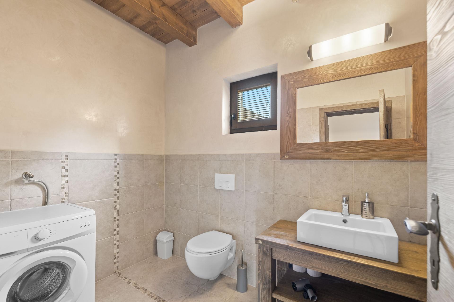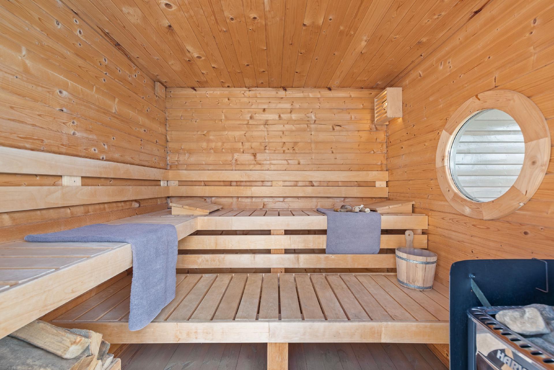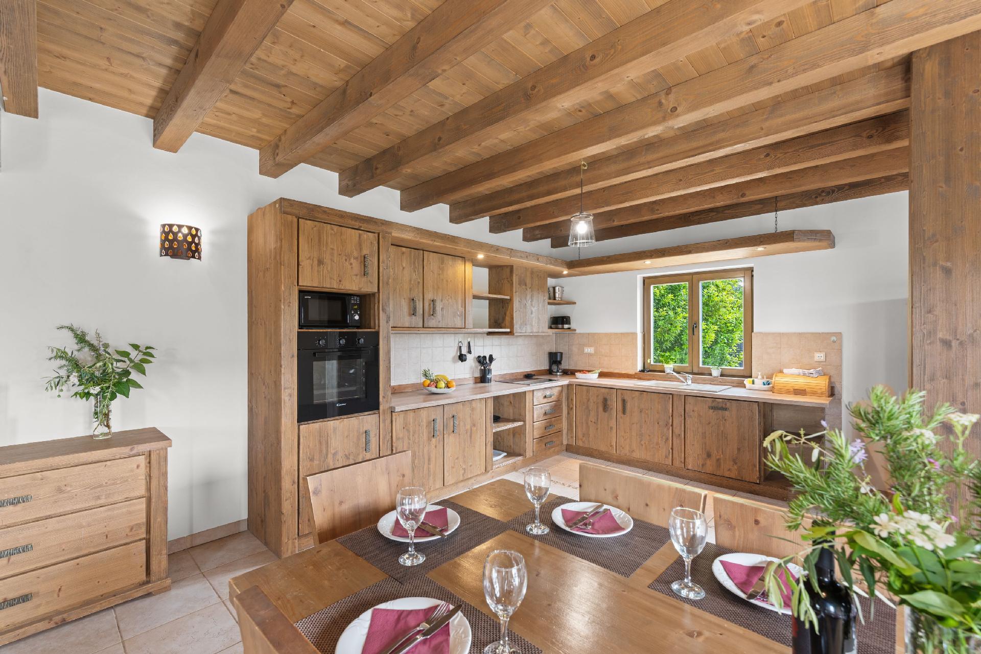 The interior of Villa Dante impresses with an open-plan living area that immediately casts a spell with its charming furnishings. The massive day beds, the tasteful coffee table, an LCD TV and the attractive corner fireplace are just some of the highlights of the living room. The adjoining, generously designed kitchen with modern amenities such as an oven, microwave, ceramic hob, dishwasher and much more, invites you to create culinary masterpieces. The massive dining table seats up to ten people, perfect for enjoying meals together.