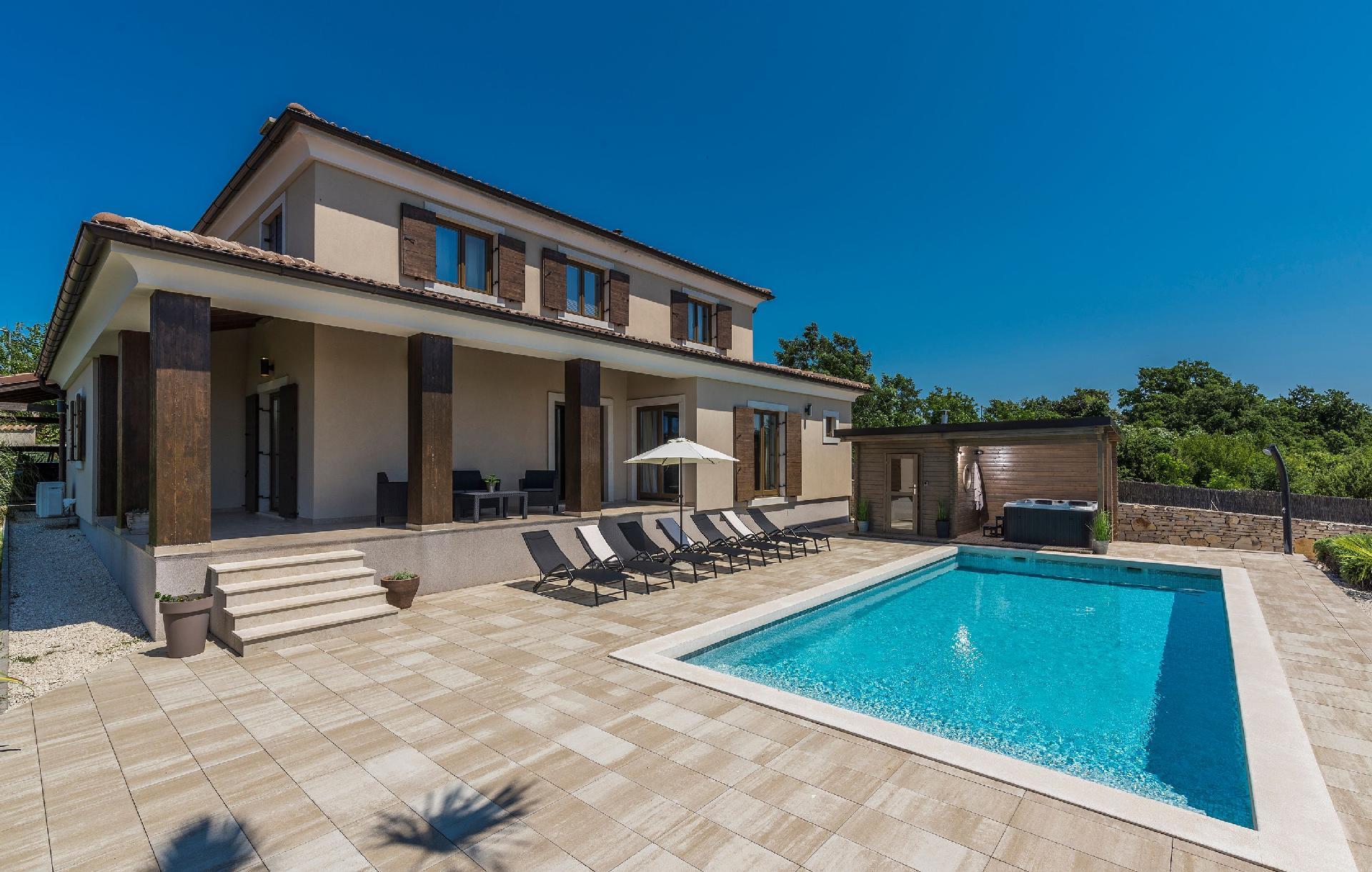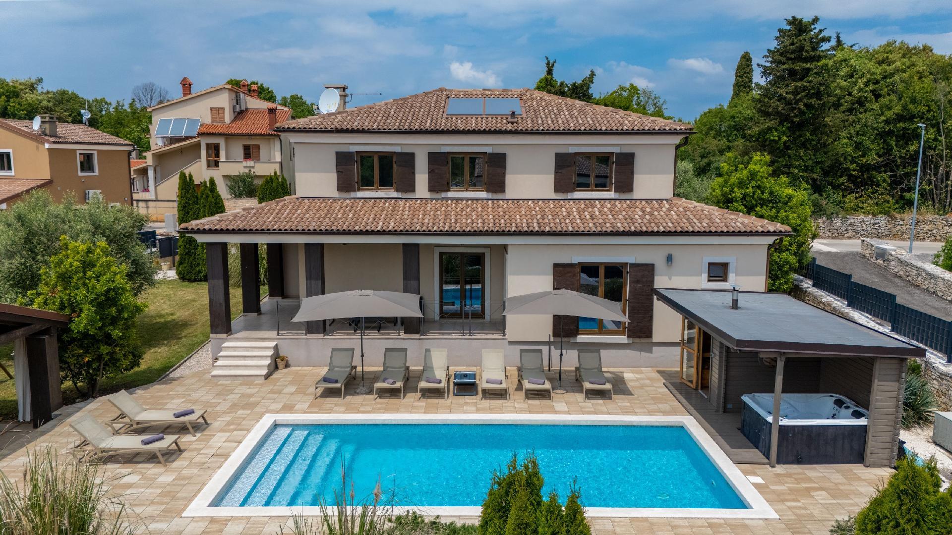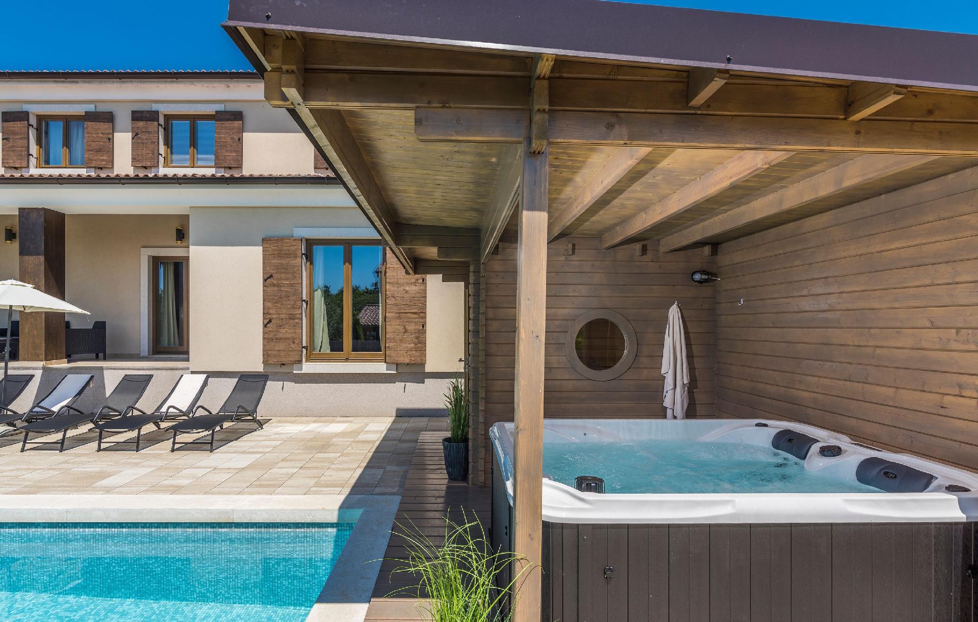 The luxury continues outside the villa. The pool terrace with a "wow effect" offers the ideal place for refreshment and relaxation with warm wooden floorboards and a seamlessly adjoining cool pool. The whole thing is complemented by the fully equipped, covered summer kitchen with barbecue oven and a cosy dining area. Surrounded by a Mediterranean natural stone wall, you can enjoy absolute privacy and an unrivalled ambience.