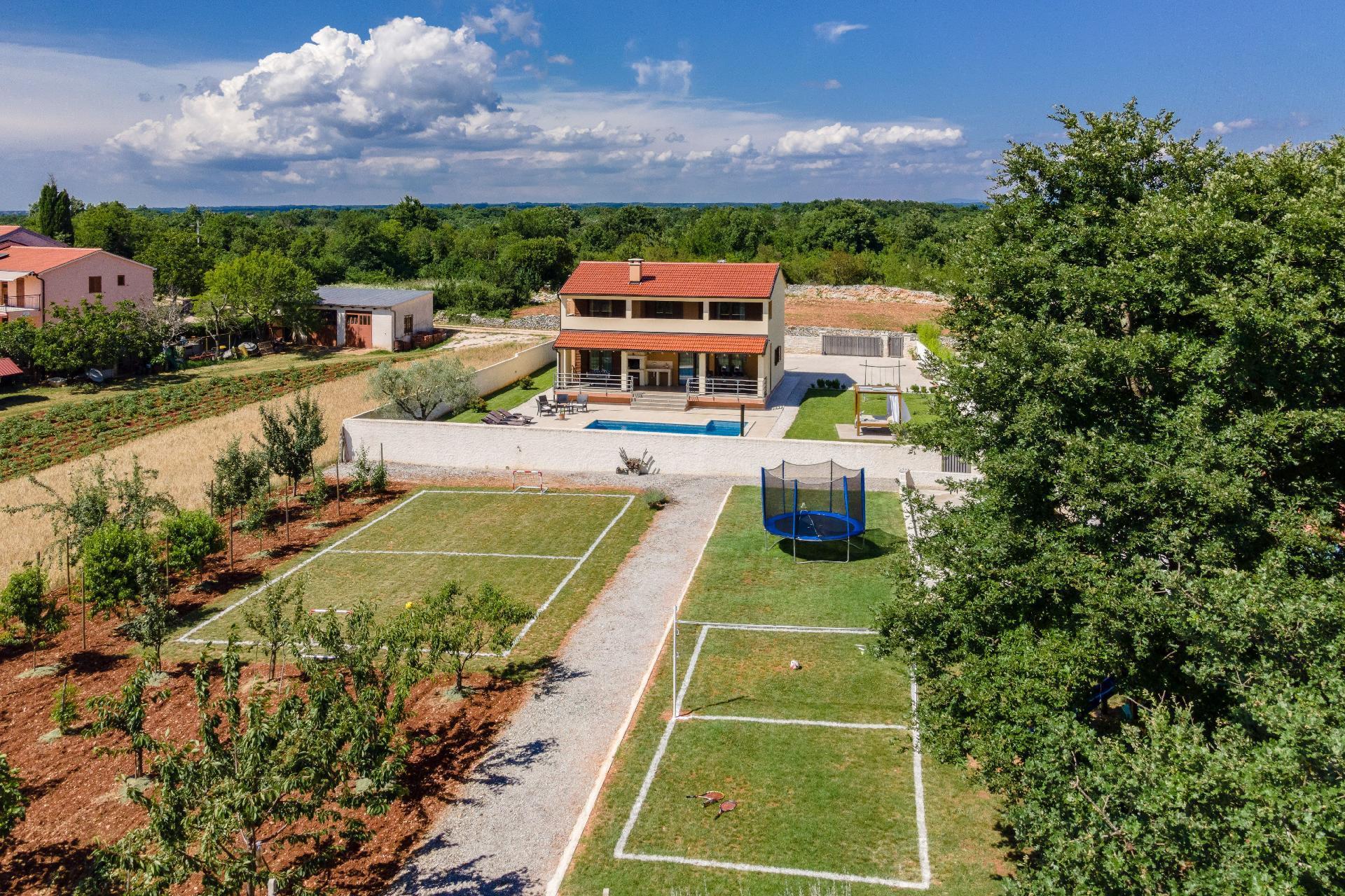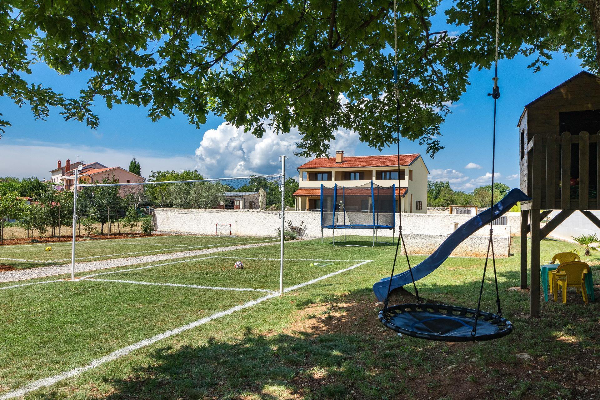 The outside area includes a completely enclosed garden with children’s playground and private swimming pool where you can relax and enjoy the Istrian sun. Besides offering a wonderful setting for relaxation with its inviting pool, you can also enjoy the garden, with its several different fruit trees. In midst of the garden, children can enjoy the playground in careless play. Whether you want pure relaxation laying on the sun loungers around the pool, or a holiday filled with activities in the villa playing badminton, volleyball, football, bowling or table football.Villa Dija is completely air- conditioned, has WiFi and private parking for 4 cars.
