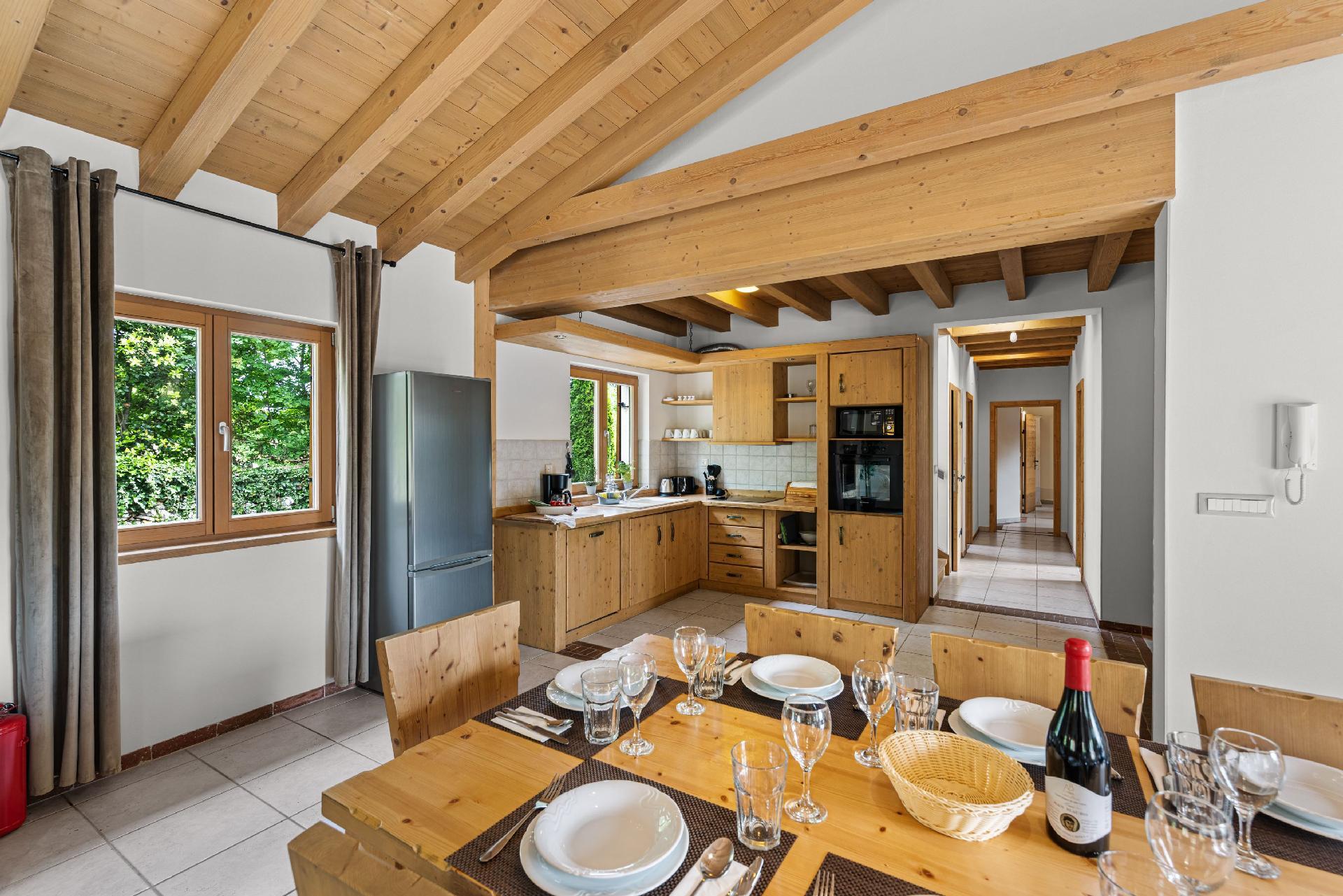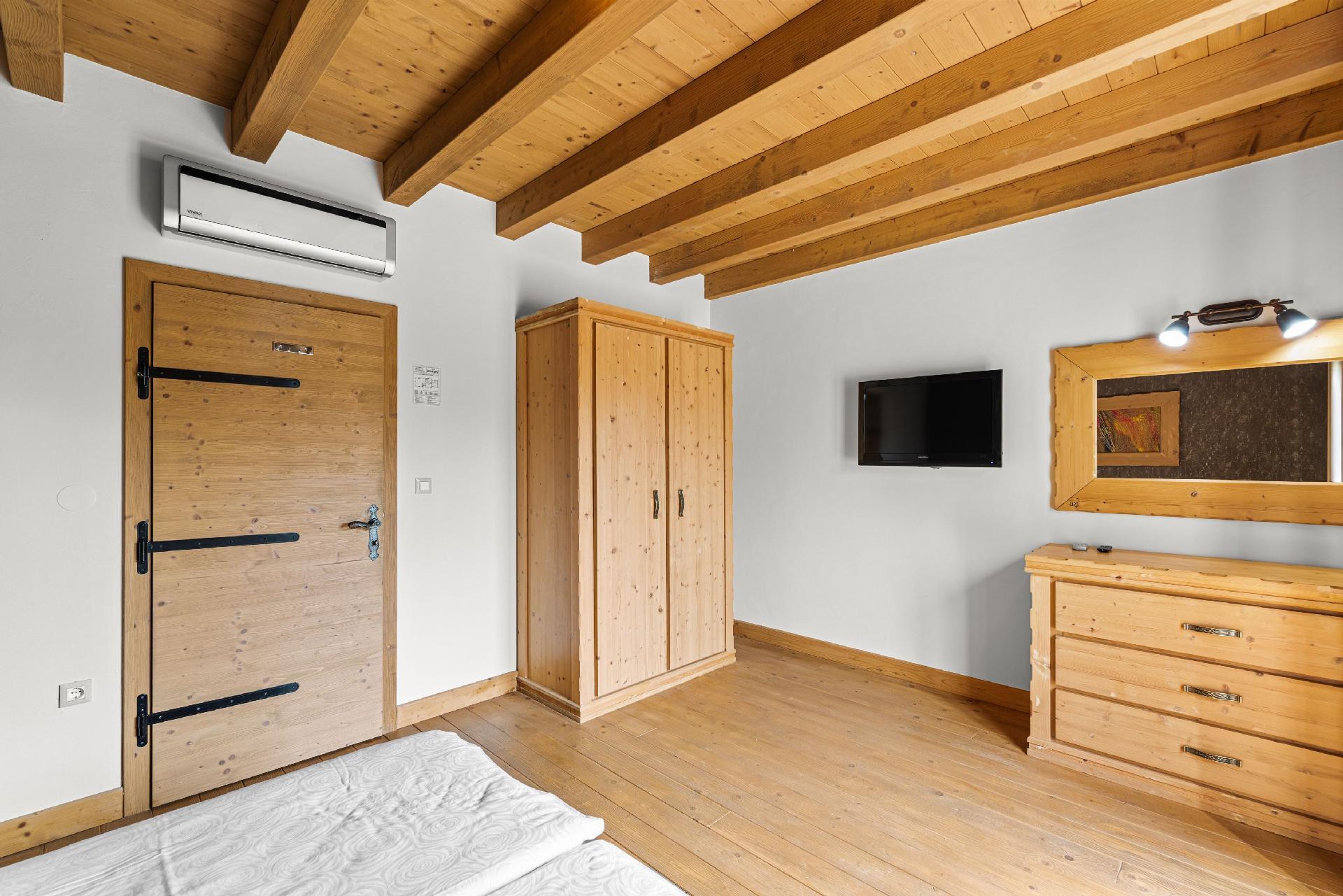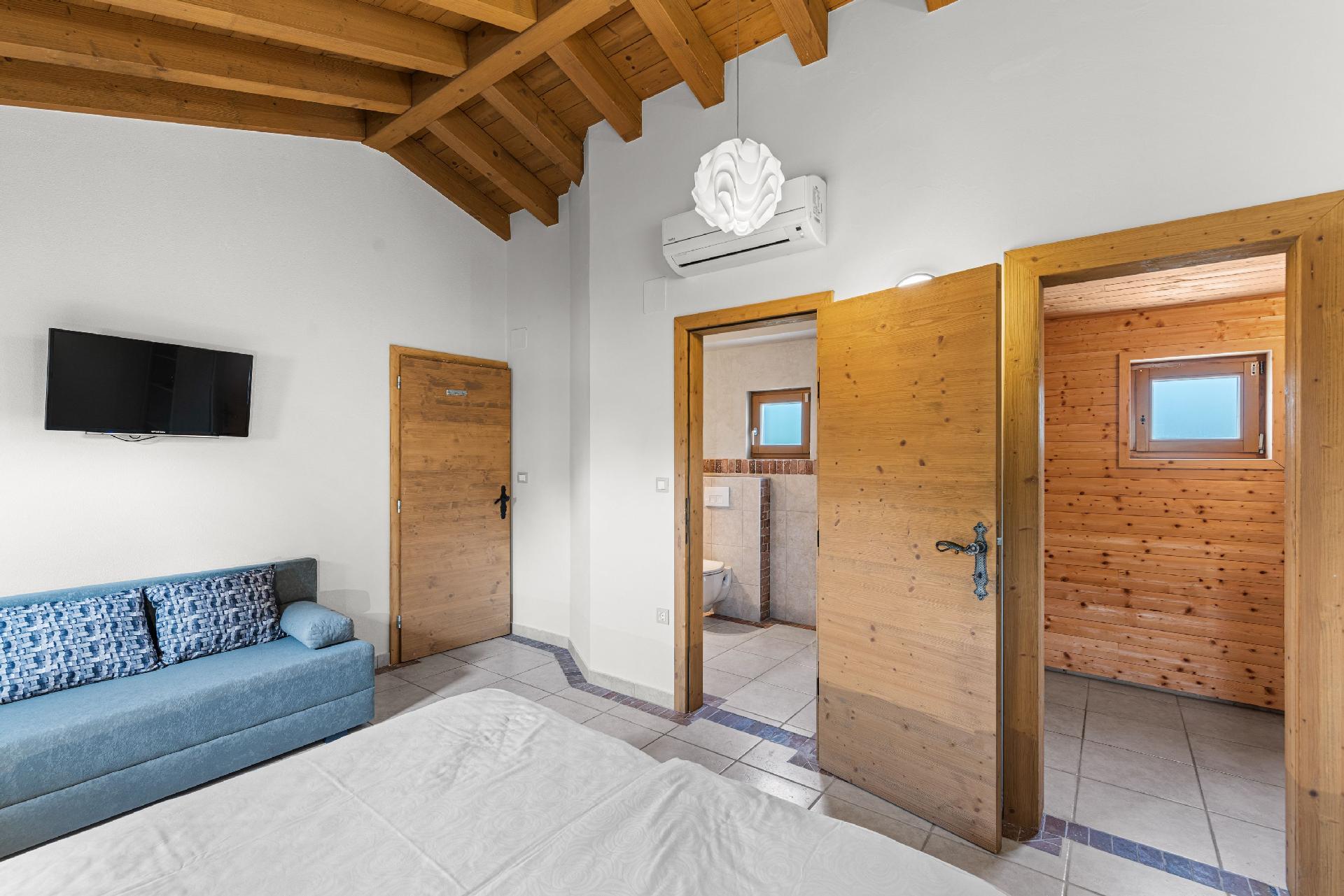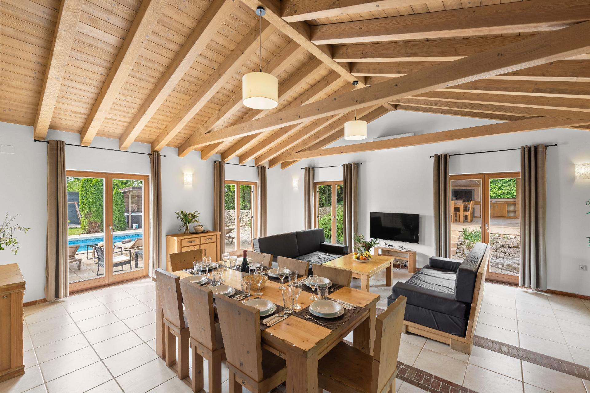 Inside, the villa enchants with an open-plan living, dining and kitchen area, which becomes the centre of the sociable get-together. The cosy brown sofa beds invite you to relax, while the rustic wooden table is perfect for shared meals and in-depth conversations. The charming country kitchen is equipped with modern conveniences such as a microwave, raised oven, dishwasher and ceramic hob. Decorations, murals and lovely accessories emphasise the harmonious overall impression of this breathtaking living space.