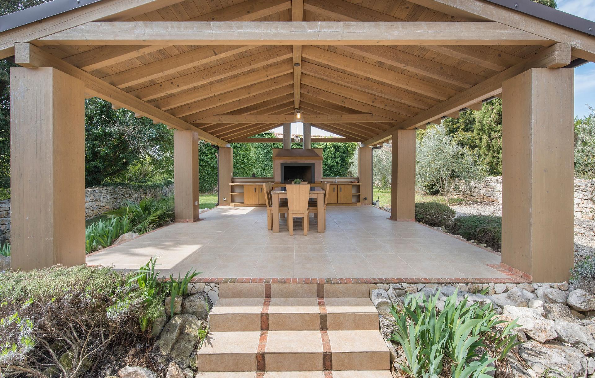 The outdoor area invites you to relax completely with a spacious sun terrace, comfortable loungers and lounge furniture as well as a refreshing pool. A romantic gravelled area leads to the spacious chill-out area. A stone terrace with an outdoor kitchen and barbecue area as well as a rustic wooden roof over the dining area for eight people make the outdoor facilities perfect for cosy evenings in the open air.