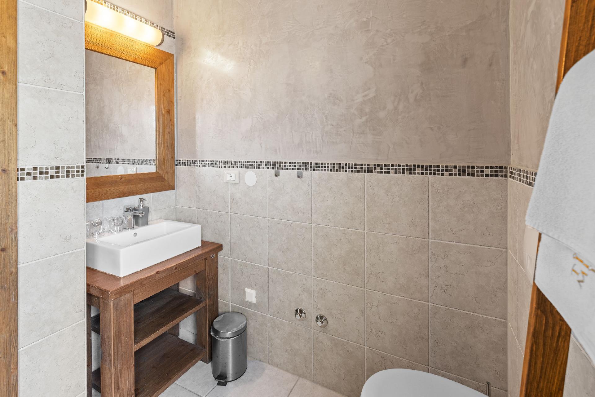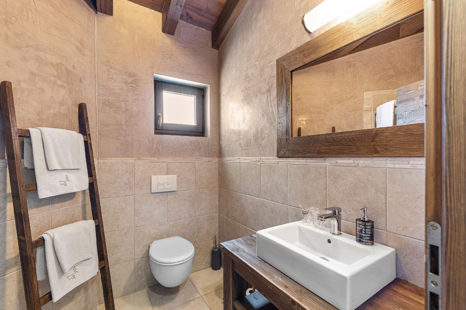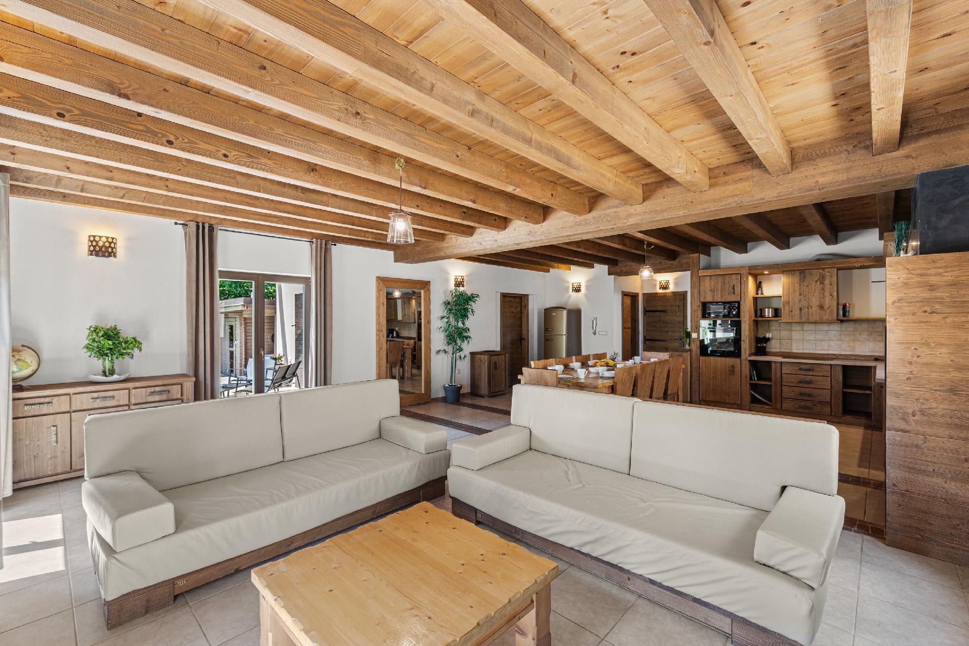 The interior leaves nothing to be desired: A rustic corner kitchen, equipped with a microwave, an eye-level oven, dishwasher and a luxury fridge, offers ideal conditions for culinary journeys of discovery. The five cosy bedrooms are each furnished with a double bed, a chest of drawers, a wardrobe and their own LCD TV as well as exclusive bathrooms with a choice of bath or shower, guaranteeing privacy and comfort. Natural materials and harmoniously coordinated colour tones underline the warm, cosy ambience of the entire villa, while selected works of art emphasise its luxurious character.