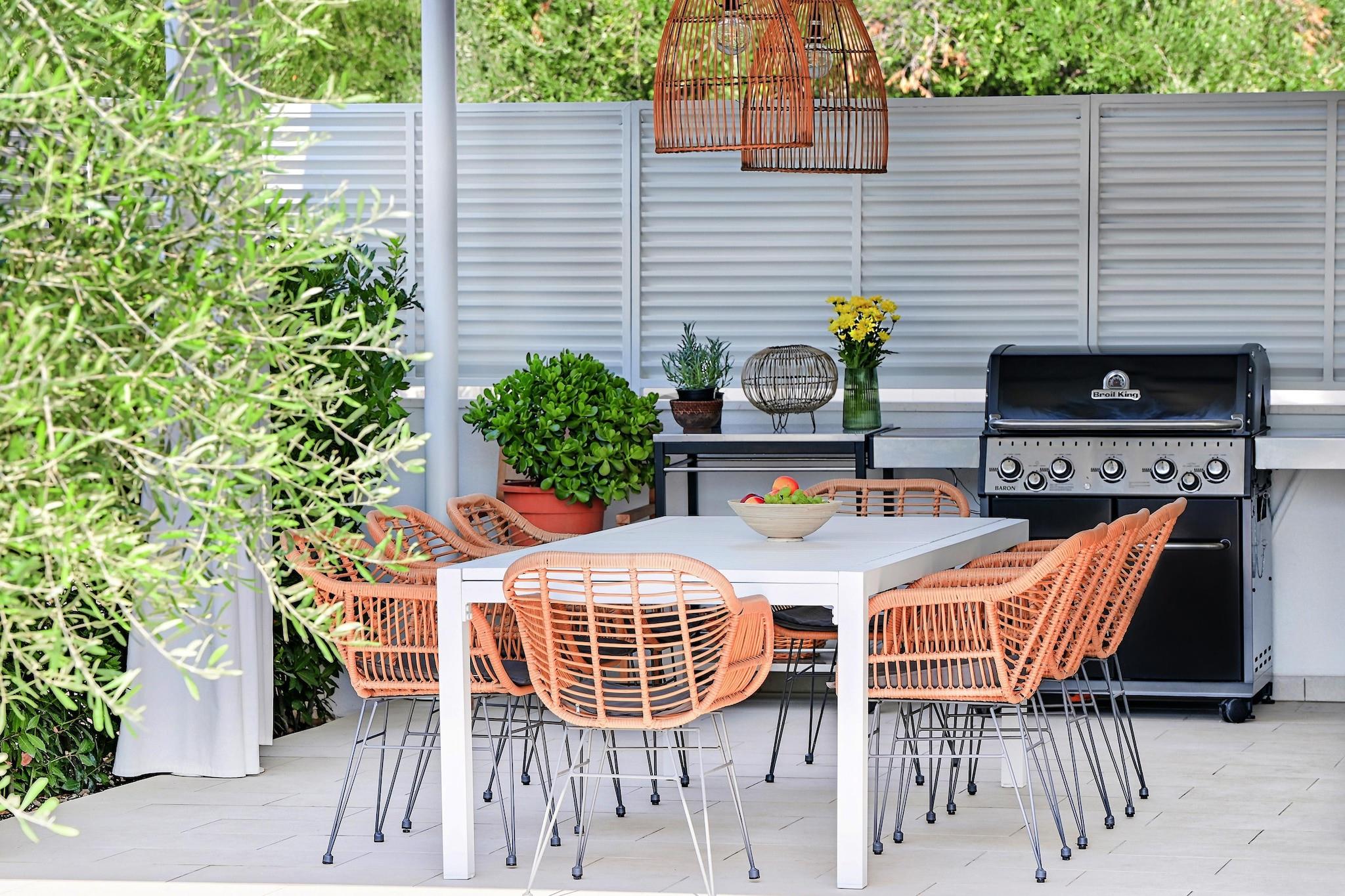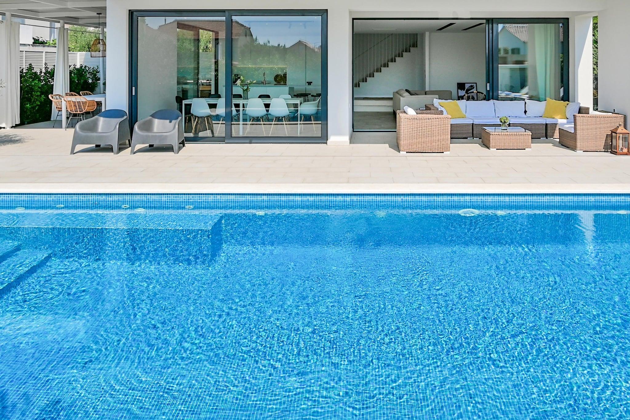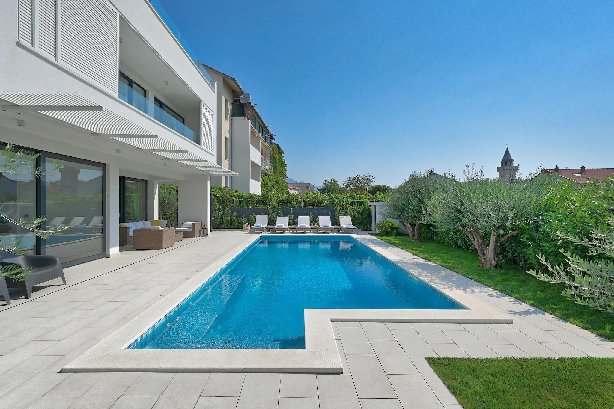 Located in the peaceful area of Kaštel Štafilic, this stylish 5-bedroom villa offers a luxurious retreat for up to 11 guests. Just 100 m from the sea and minutes from the town center, it’s the perfect base for exploring the Split Riviera, nestled between the UNESCO-listed cities of Split and Trogir. The villa features a spacious living room, fully equipped kitchen, and dining area on the ground floor, with large glass doors opening to a private terrace and 45 m² swimming pool. Enjoy sunbathing on loungers, grilling at the barbecue, or relaxing in the green garden. Air conditioning, SAT TV, and WiFi ensure comfort throughout. With 280 m² of indoor space and a 70 m² terrace, the villa includes private parking for 4 cars and 2 complimentary bikes. A serene and well-appointed escape near Croatia’s most iconic coastal towns.