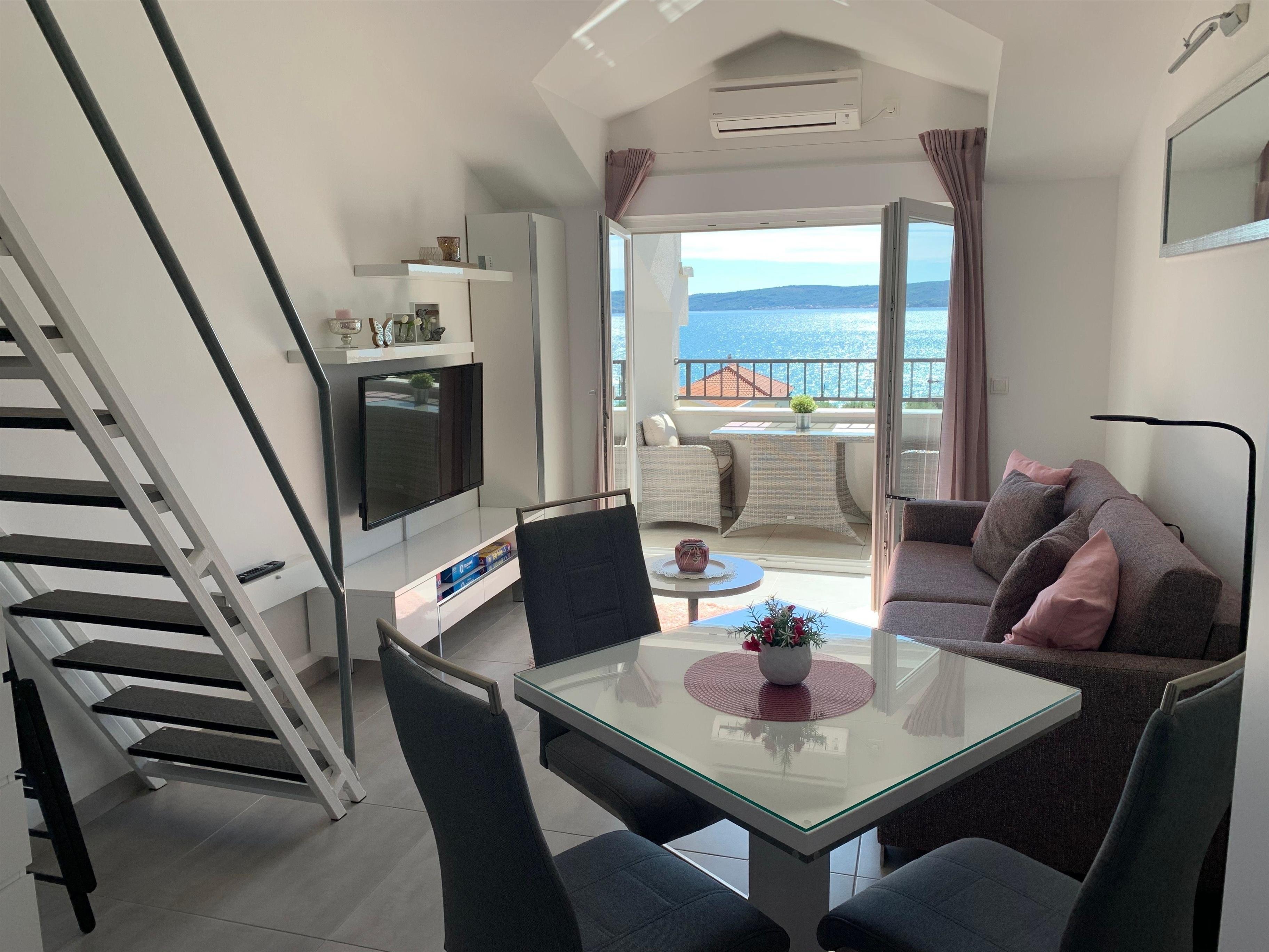 Liebevoll gemütlich eingerichtetes 4 Sterne Studio-Apartment an. Direkt am Wasser (100m) mit überdachtem Balkon (Loggia), direktem Meerblick und zusätzlicher Dachterrasse mit einer Galerie.Der Weg zum Strand ist sehr kurz