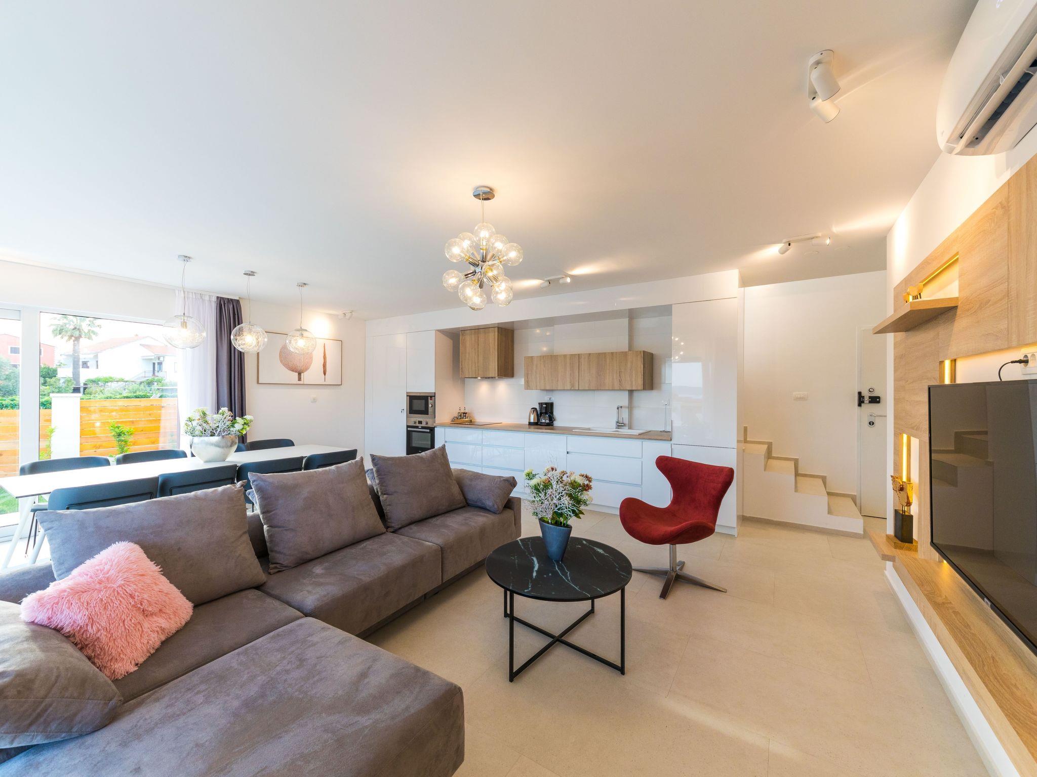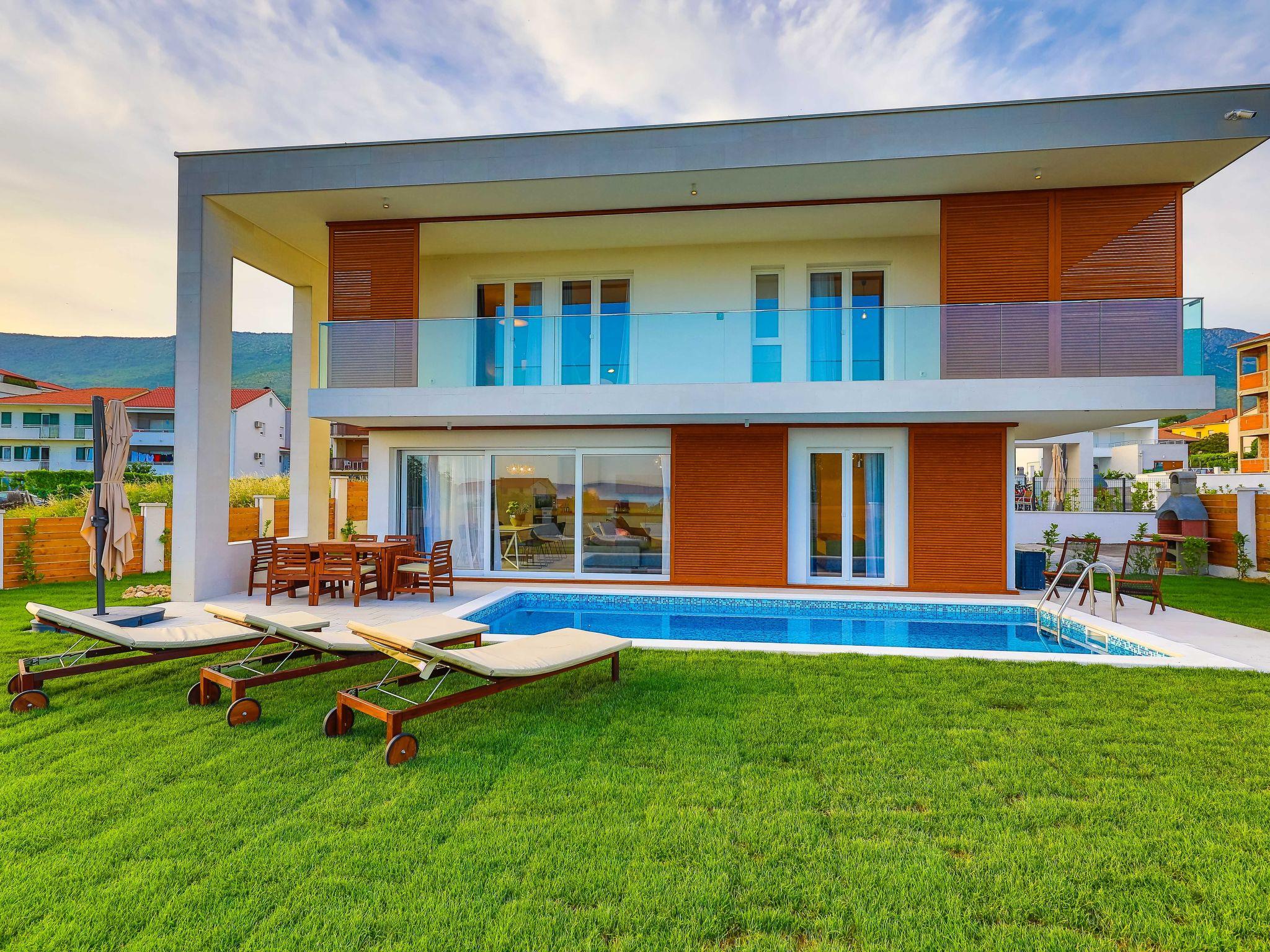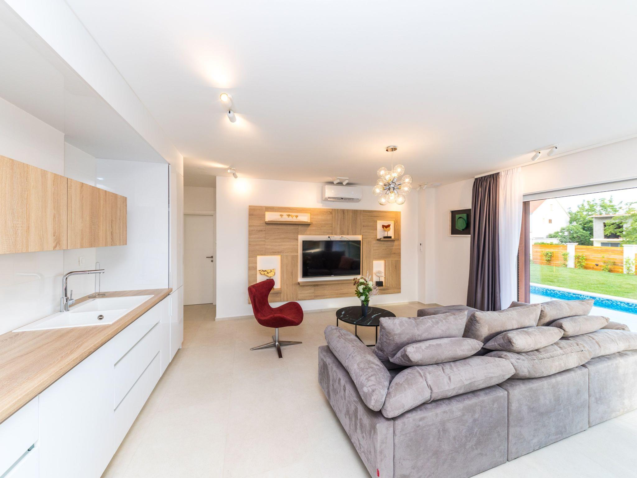The residence consists of 7 elegant and stylish villas on gated property designed for maximum comfort and luxury: villa Audrey, villa Grace, villa Brigitte, villa Marilyn, villa Elizabeth, villa Ingrid and villa Sophia. Each villa is carefully designed in a similar, but yet unique way with attention to details and the use of best materials which combine style and functionality in order to be your perfect home away from home.Villa Ingrid covers the area of 191 m2 divided on ground and first floor and consists of 4 contemporary bedrooms which can comfortably accommodate up to 8 persons, ideal for groups of friends or larger families.The ground floor is designed as a spacious and bright lounge area which consists of a fully equipped modern kitchen, contemporary living room with dining area, 1 bedroom with double bed and 1 bathroom with shower. The living room has access to the garden and pool area through a large sliding glass door which allows the entire area to become open concept. Villa Ingrid covers the garden of the area 143 m2 with a beautiful covered terrace and outside dining table for enjoying diners using an outdoor grill.Modern staircase leads to the first floor, designed as a resting area with 3 bedrooms with double beds and en suite bathrooms. Each bedroom in the villa is equipped with air conditioning and flat SAT-TV. Two bedrooms share a balcony with a partial seaview while one bedroom has a balcony with a beautiful seaview.Villa Ingrid is fully air conditioned and equipped with flat SAT-TVs, wi-fi internet, iron and ironing board, safe, oven, stove, hood, refrigerator with freezer, dishwasher, microwave, electric kettle, coffee machine, dishes and cutlery, hair dryer in each bedroom, washing machine and board games for children. Baby cot and high chair are available on request. The property offers 3 gated parking places, free of charge. Up to 2 pets are allowed in the villa, free of charge. Guests are provided with a welcome pack upon their arrival.