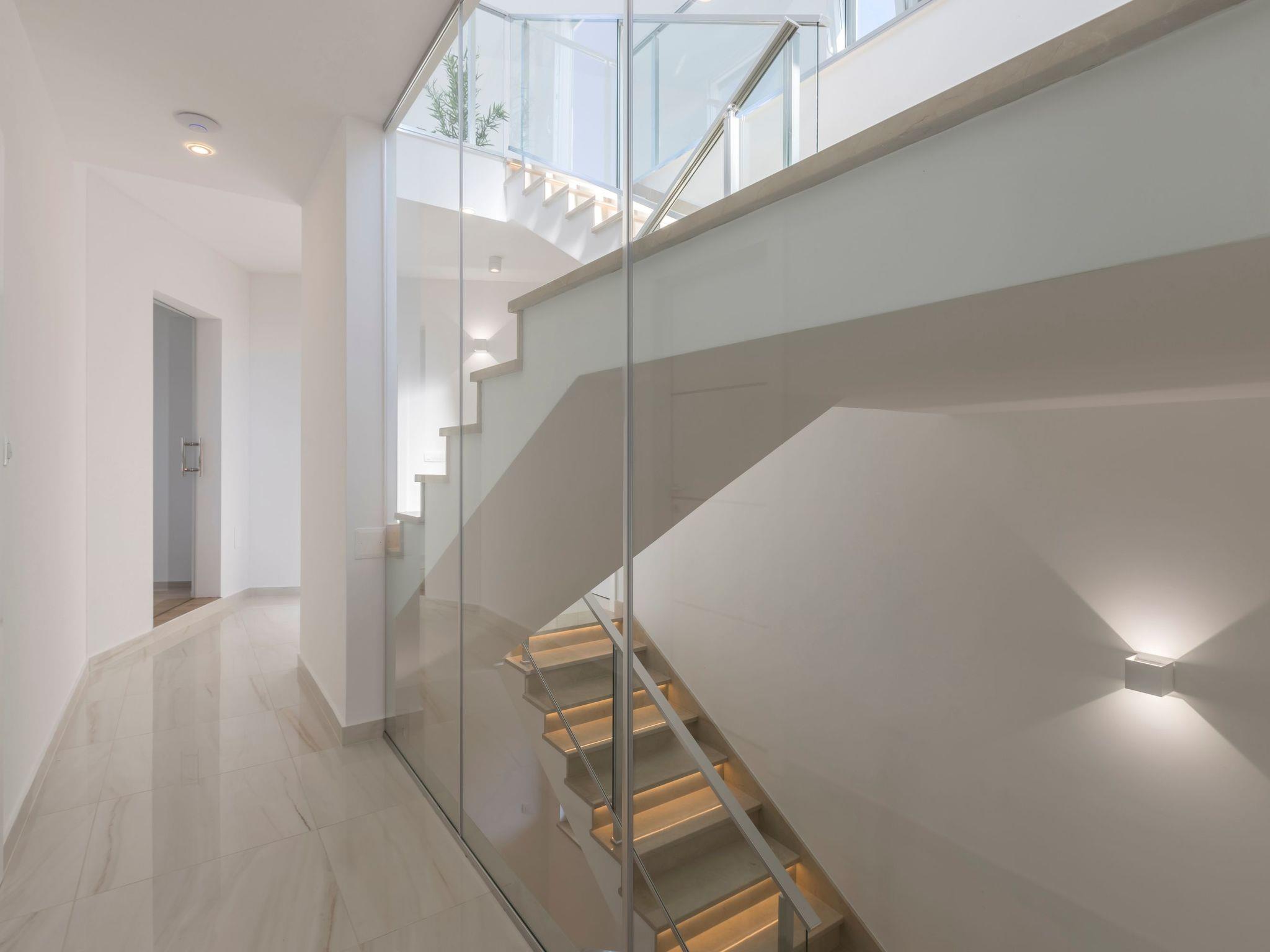 The outdoor area of the villa invites you to dream: In addition to the heated infinity pool, you will find a large terrace and a spacious garden surrounded by green vegetation, vibrant colours and a barbecue area for cosy evenings in the open air. On the first floor, an additional terrace with a whirlpool and sun loungers extends the range of outdoor facilities, ideal for relaxing and unwinding in peace and quiet.