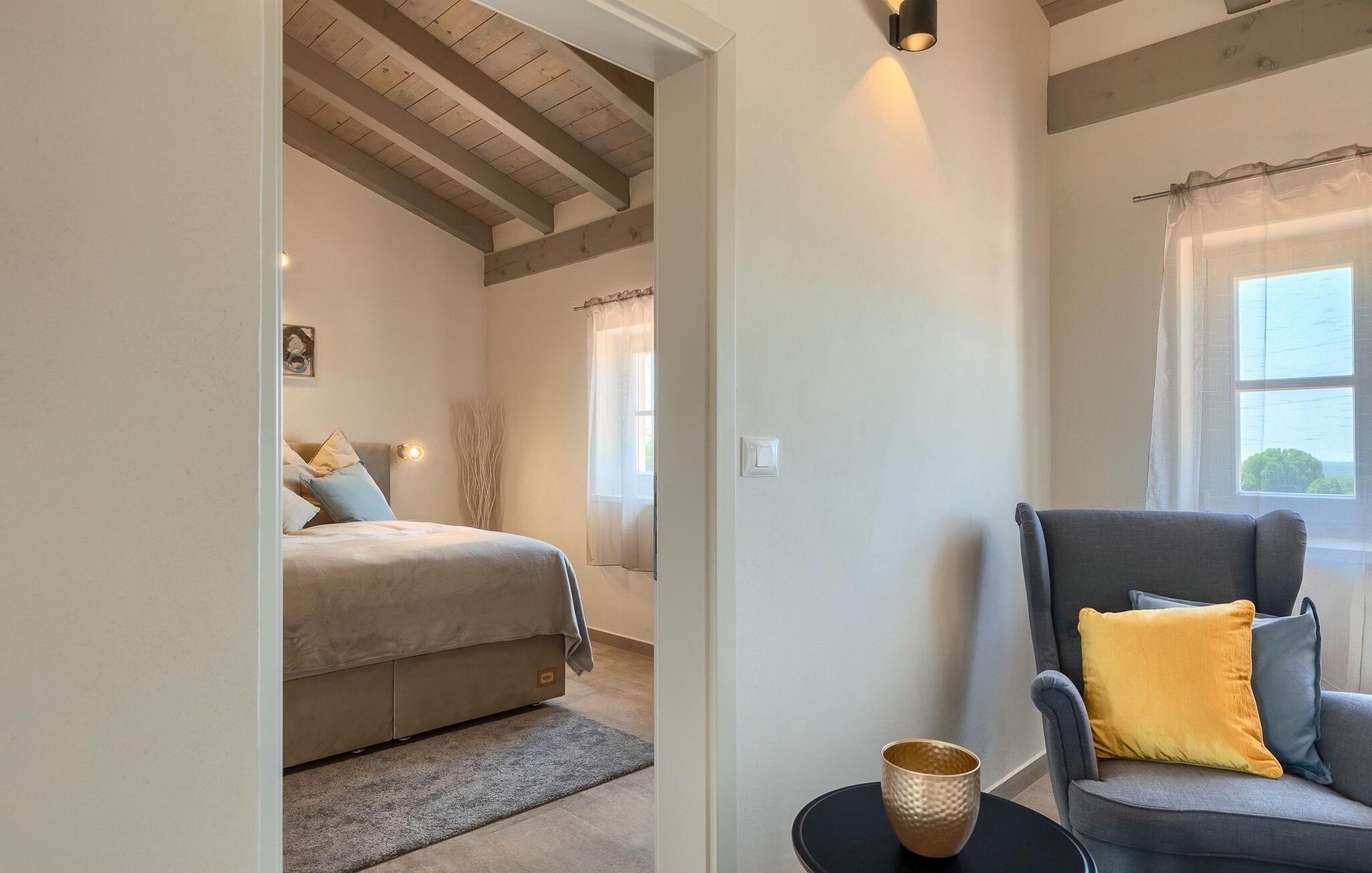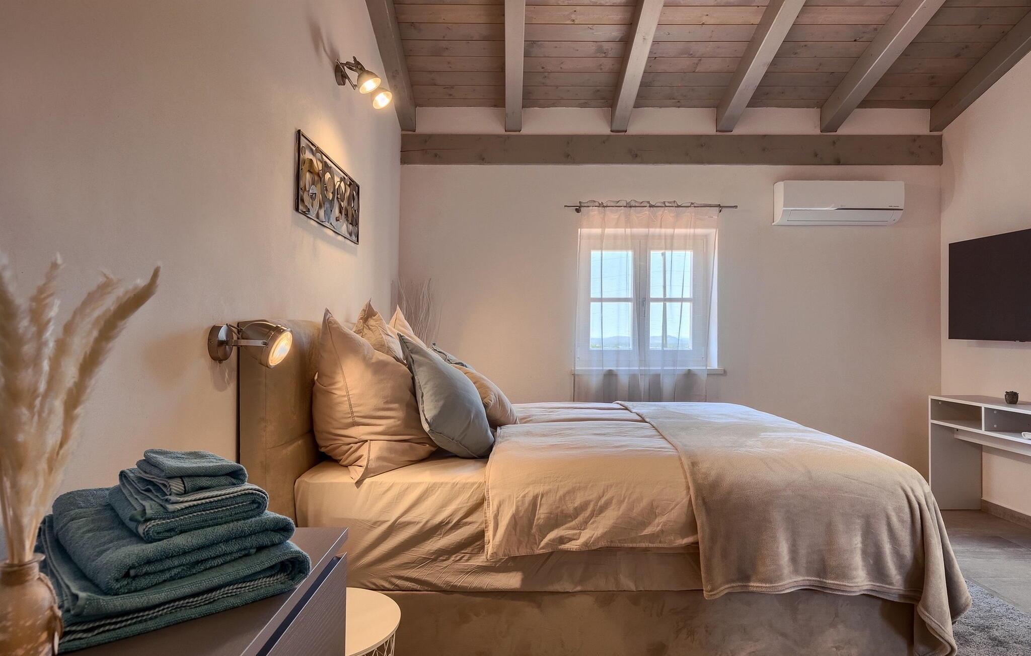 Die Villa MiLuMaMaNi ist eine charmante Familienvilla im Zentrum von Istrien, nur eine kurze Fahrt von der Küstenstadt Rovinj entfernt. Die moderne Villa ist in zwei Etagen aufgeteilt. Alles ist in einem sehr warmen Stil eingerichtet und gibt Ihnen ein Gefühl von Zuhause. Die Villa verfügt über insgesamt 4 gut ausgestattete Schlafzimmer und kann bis zu 10 Personen beherbergen. Zwei Schlafzimmer befinden sich im ersten Stock, während die anderen beiden Schlafzimmer im Erdgeschoss liegen. Alle Schlafzimmer verfügen über einen Fernseher, eine Klimaanlage und ein eigenes Bad. Das offene Erdgeschoss besteht aus einer modernen und voll ausgestatteten Küche mit Essbereich und einem gemütlichen Wohnzimmer mit Kamin. Die Villa ist dank der großen Fenster und Türen sehr hell.