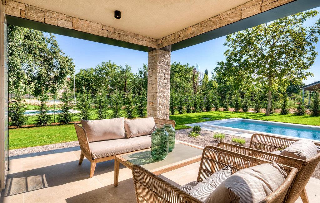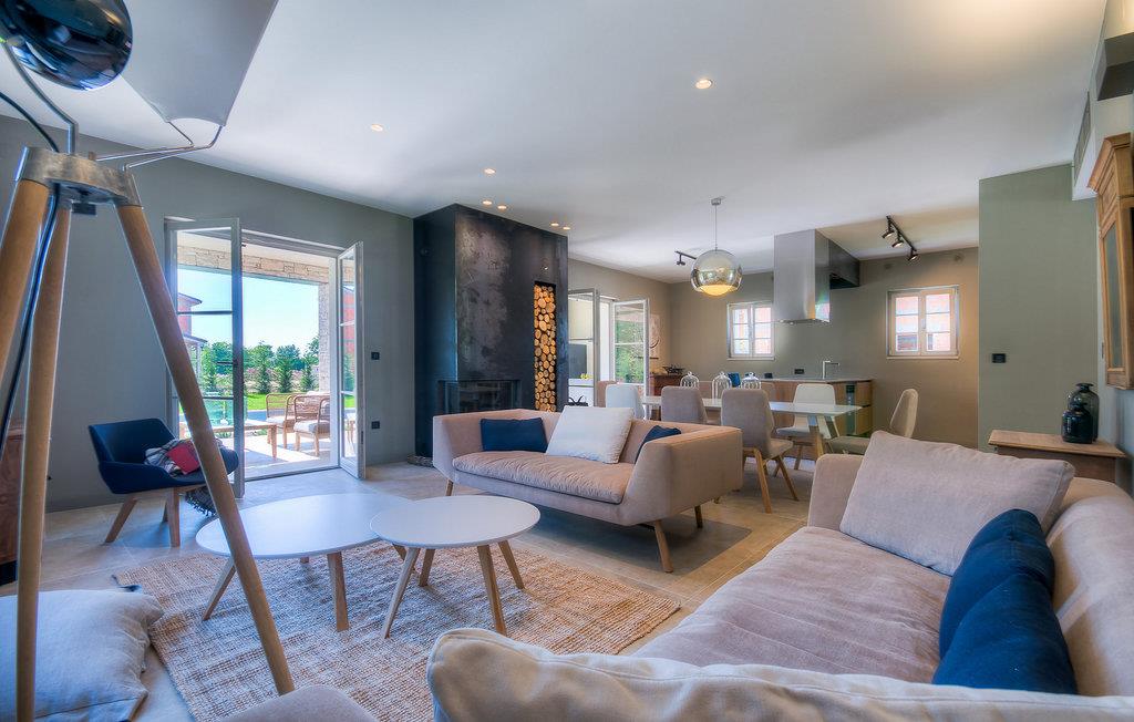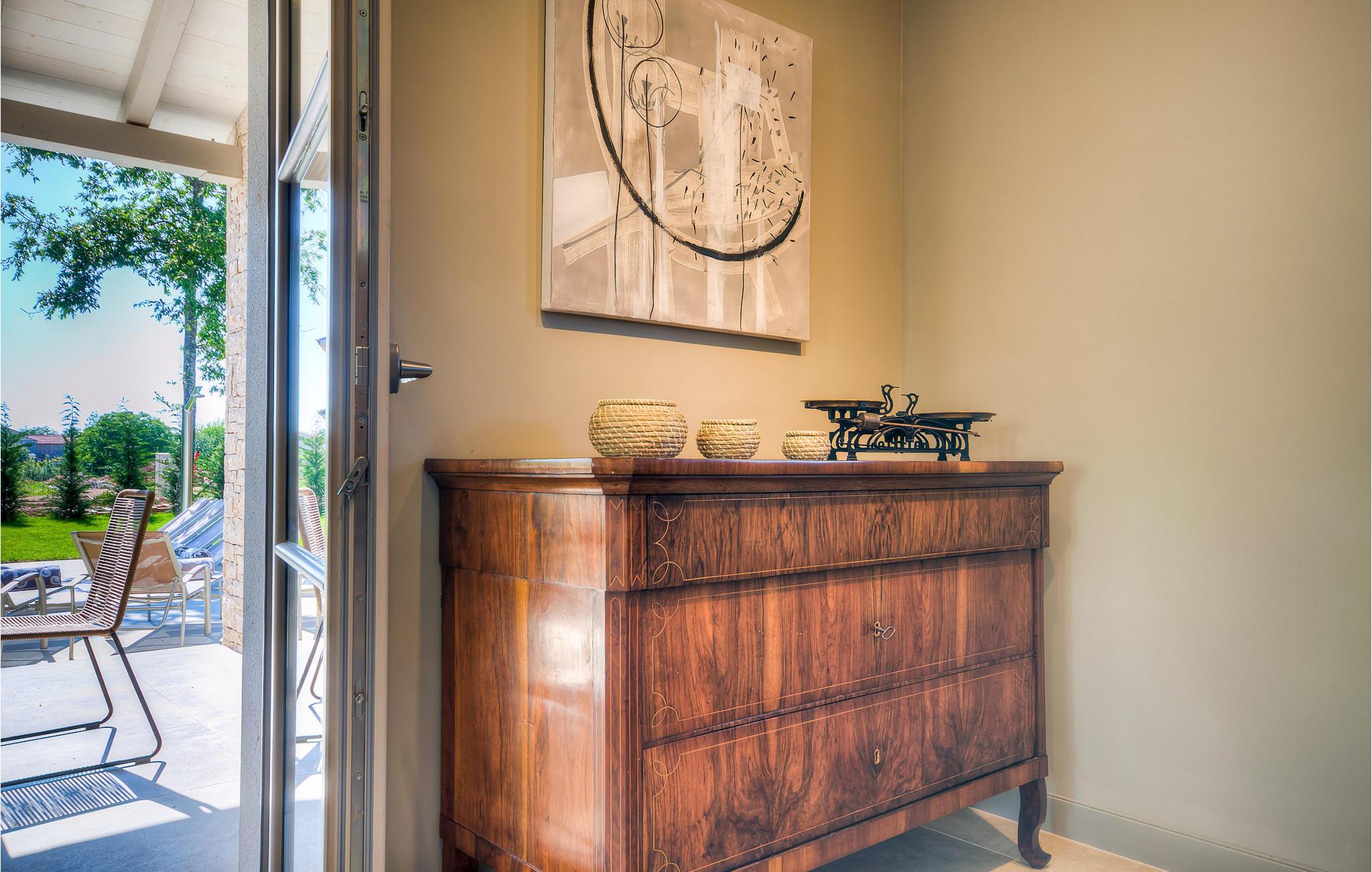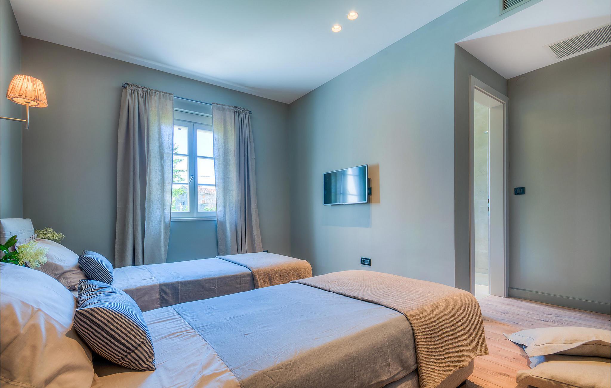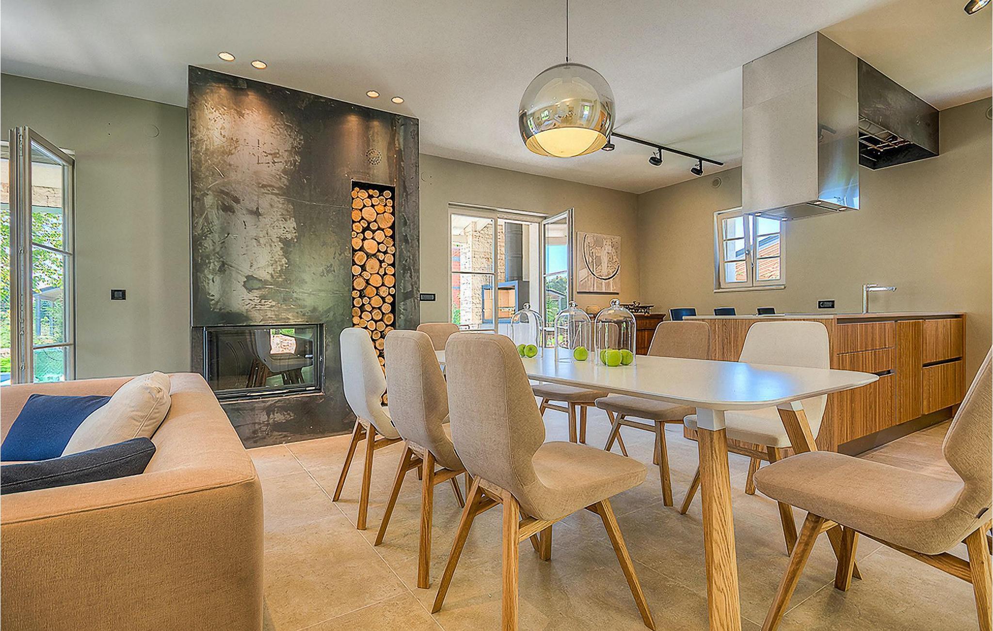 Falls Sie ein besonderes Erlebnis suchen, tief in die Tradition und Landschaft Istriens eingebettet, mit Komfort und Stil, ist die herrliche Villa Mia für Sie genau das Richtige. Umgeben von einem großen gepflegten Rasengarten mit wunderschönen Zypressen und dem einladenden Pool mit für faule Sonnenbäder idealer Terrasse, wird Sie dieses traumhafte Anwesen ganz bestimmt faszinieren. Natursteinwände, hübsche Holzläden und die gemütliche Veranda mit dem eingebauten Grill, sowie al fresco Ess- und Loungebereich verschaffen einen reizvollen ersten Eindruck, während der Innenbereich den hohen Erwartungen mehr als gerecht wird. Geschmackvoll gestaltet mit einer Mischung aus modernen und Vintage-Möbeln, attraktiver Beleuchtung und großen Fenstertüren, die die Zimmer besonders hell und luftig halten, versorgt das Haus eine warme, entspannende Atmosphäre, die sowohl traditionellen als auch modernen Geschmäckern zuspricht. Im Erdgeschoss dominiert ein großzügiger, offener Raum verteilt in Wohn-, Ess- und Kochbereiche mit einem eleganten Kamin und bequemen Sofas, wo Sie in gemütlicher Atmosphäre die Eindrücke des Tages austauschen können. Eines der vier stilvoll eingerichteten Schlafzimmer befindet sich im Erdgeschoss, während die anderen drei über die obere Etage verteilt sind, jedes mit Flachbildfernseher, sowie einem eigenen wunderschön eingerichteten Bad. Der erste Stock verfügt noch über eine hübsche Terrasse, von wo aus Sie die herrliche Aussicht über die umgebende Landschaft genießen können. Villa Mia ist nicht nur als perfekte Basis zu empfehlen, um unbestreitbare Reize Istriens zu entdecken, sondern auch für Familien, die in vollem Luxus Spaß haben und richtig entspannen wollen.Gerade zwischen den bezaubernden kleinen mittelalterlichen Ortschaften von Žminj, Svetvincenat und Kanfanar gelegen, könnte diese wunderschöne Villa nicht besser gestaltet werden für einen Urlaub, der faule Tage von dolce far niente mit Besichtigungstouren in einer der schönsten Gebieten Istriens kombiniert. Die malerischen, mittelalterlichen Hügelstädtchen, traditionelle Dörfer, wo Zeit stillgestanden ist, sowie Landschaften der einzigartigen Schönheit sind ideal für Aussichtsfahrten, Radtouren und Wandern. Hervorragende traditionelle Küche und erstklassige Weine für welche diese Region weltbekannt ist, fügen die letzten Zutaten zu einem unvergesslichen Urlaub hinzu. Wo auch immer Sie gelangen, werden Ihnen die Einheimischen einen wunderbaren, herzlichen Empfang in diese faszinierende Region bieten. Sie können auch Lebensmittel direkt von den lokalen Herstellern kaufen. Und wenn Sie in der Stimmung für etwas Anderes sind, sind die kristallklare Adria mit ihren wunderschönen Stränden, sowie die besuchten touristischen Hotspots nur eine kurze Autofahrt entfernt.
