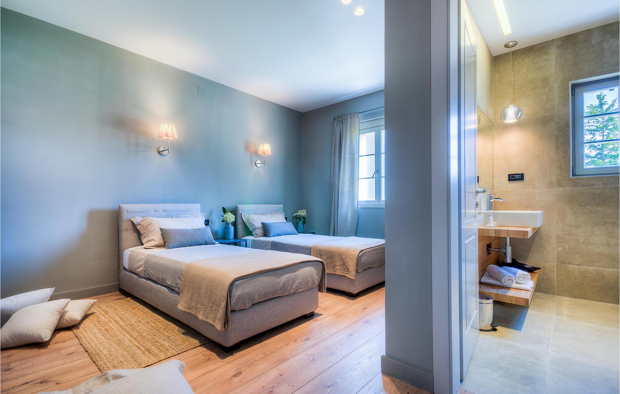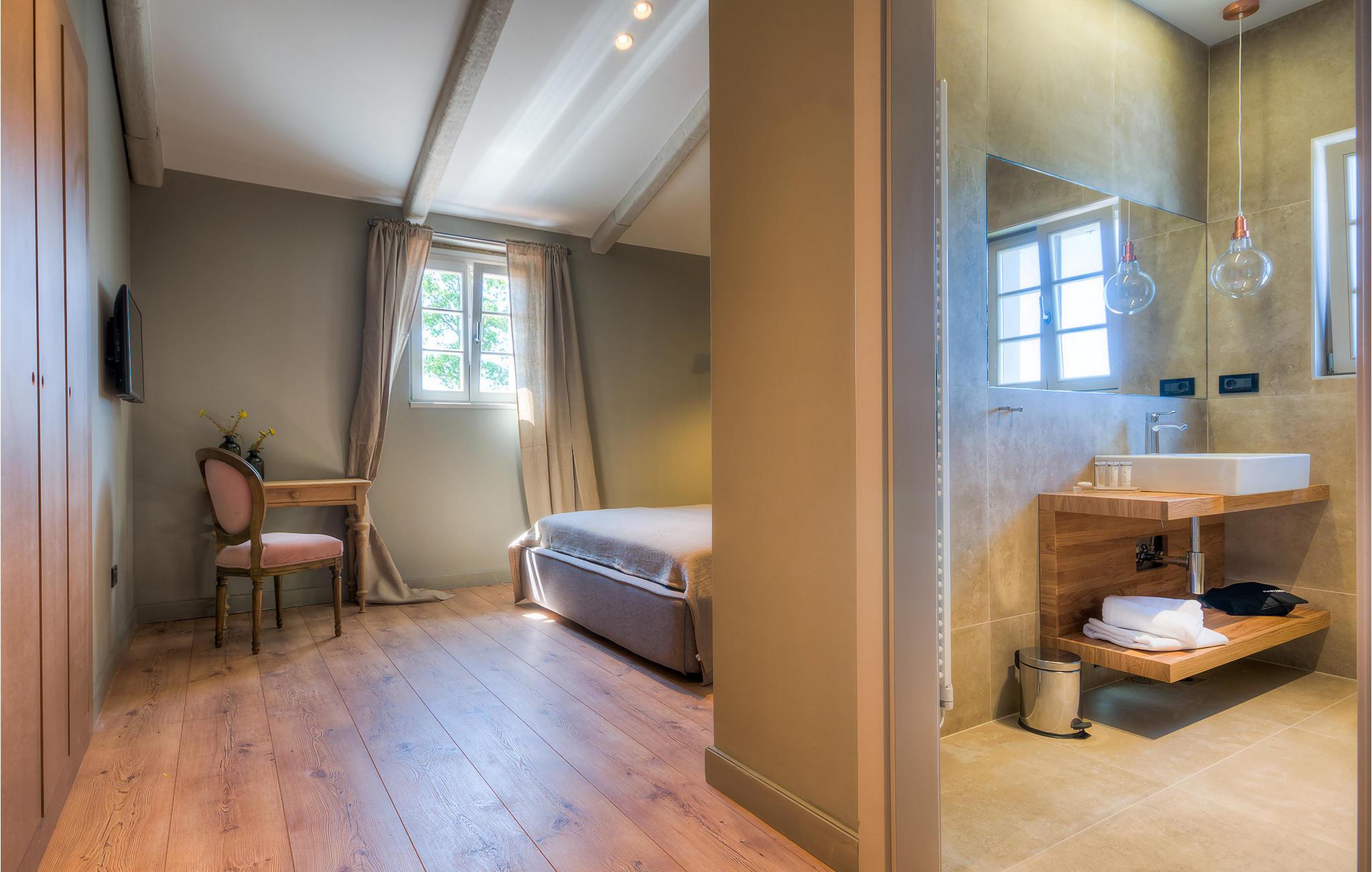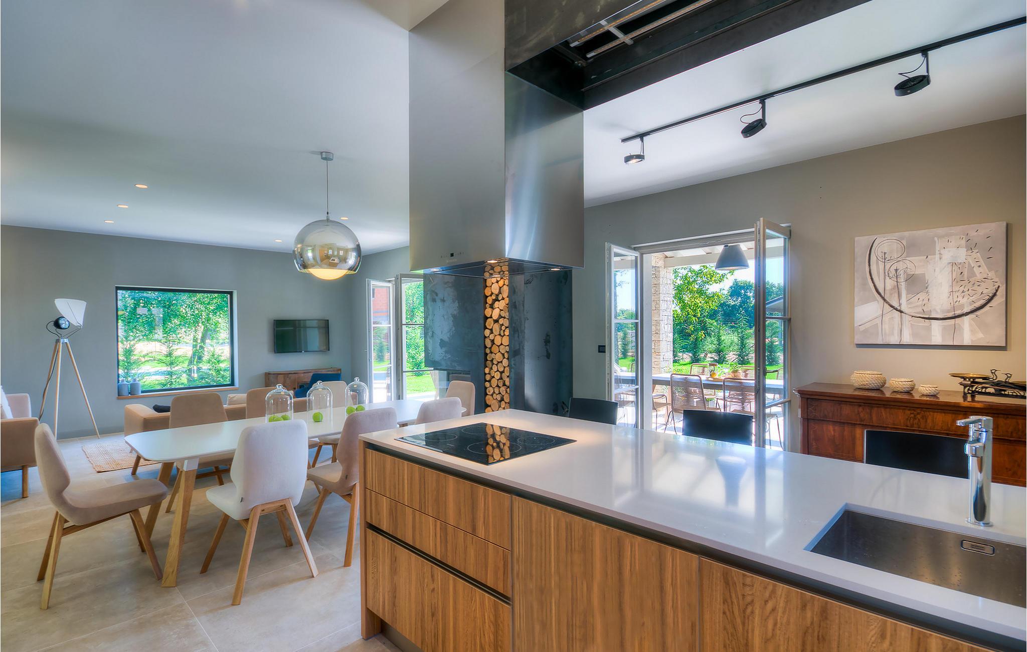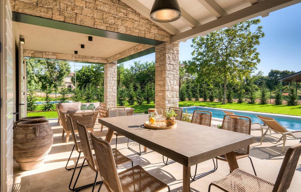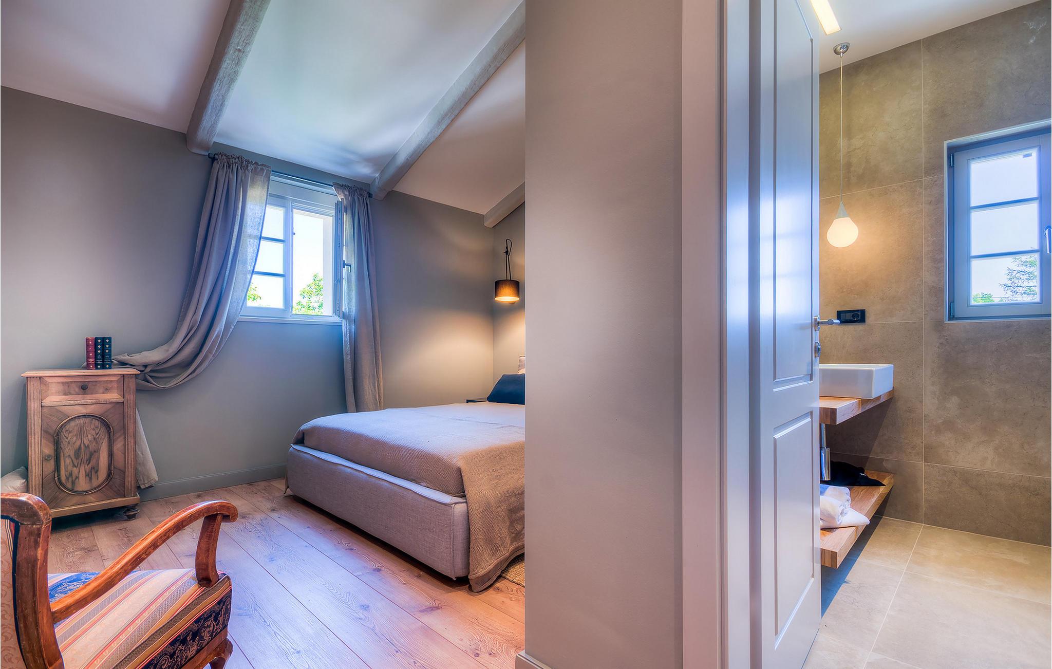 Falls Sie ein besonderes Erlebnis suchen, tief in die Tradition und Landschaft Istriens eingebettet, mit Komfort und Stil, ist die herrliche Villa Mia für Sie genau das Richtige. Umgeben von einem großen gepflegten Rasengarten mit wunderschönen Zypressen und dem einladenden Pool mit für faule Sonnenbäder idealer Terrasse, wird Sie dieses traumhafte Anwesen ganz bestimmt faszinieren. Natursteinwände, hübsche Holzläden und die gemütliche Veranda mit dem eingebauten Grill, sowie al fresco Ess- und Loungebereich verschaffen einen reizvollen ersten Eindruck, während der Innenbereich den hohen Erwartungen mehr als gerecht wird. Geschmackvoll gestaltet mit einer Mischung aus modernen und Vintage-Möbeln, attraktiver Beleuchtung und großen Fenstertüren, die die Zimmer besonders hell und luftig halten, versorgt das Haus eine warme, entspannende Atmosphäre, die sowohl traditionellen als auch modernen Geschmäckern zuspricht. Im Erdgeschoss dominiert ein großzügiger, offener Raum verteilt in Wohn-, Ess- und Kochbereiche mit einem eleganten Kamin und bequemen Sofas, wo Sie in gemütlicher Atmosphäre die Eindrücke des Tages austauschen können. Eines der vier stilvoll eingerichteten Schlafzimmer befindet sich im Erdgeschoss, während die anderen drei über die obere Etage verteilt sind, jedes mit Flachbildfernseher, sowie einem eigenen wunderschön eingerichteten Bad. Der erste Stock verfügt noch über eine hübsche Terrasse, von wo aus Sie die herrliche Aussicht über die umgebende Landschaft genießen können. Villa Mia ist nicht nur als perfekte Basis zu empfehlen, um unbestreitbare Reize Istriens zu entdecken, sondern auch für Familien, die in vollem Luxus Spaß haben und richtig entspannen wollen.Gerade zwischen den bezaubernden kleinen mittelalterlichen Ortschaften von Žminj, Svetvincenat und Kanfanar gelegen, könnte diese wunderschöne Villa nicht besser gestaltet werden für einen Urlaub, der faule Tage von dolce far niente mit Besichtigungstouren in einer der schönsten Gebieten Istriens kombiniert. Die malerischen, mittelalterlichen Hügelstädtchen, traditionelle Dörfer, wo Zeit stillgestanden ist, sowie Landschaften der einzigartigen Schönheit sind ideal für Aussichtsfahrten, Radtouren und Wandern. Hervorragende traditionelle Küche und erstklassige Weine für welche diese Region weltbekannt ist, fügen die letzten Zutaten zu einem unvergesslichen Urlaub hinzu. Wo auch immer Sie gelangen, werden Ihnen die Einheimischen einen wunderbaren, herzlichen Empfang in diese faszinierende Region bieten. Sie können auch Lebensmittel direkt von den lokalen Herstellern kaufen. Und wenn Sie in der Stimmung für etwas Anderes sind, sind die kristallklare Adria mit ihren wunderschönen Stränden, sowie die besuchten touristischen Hotspots nur eine kurze Autofahrt entfernt.