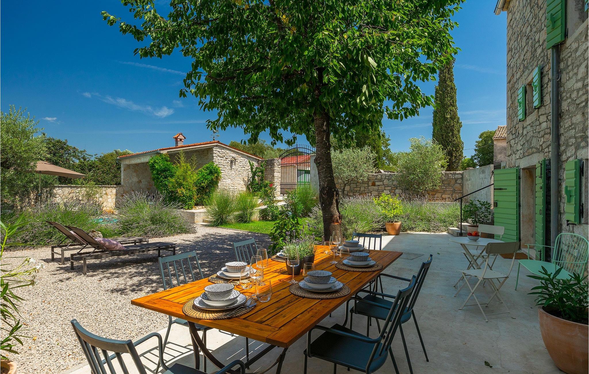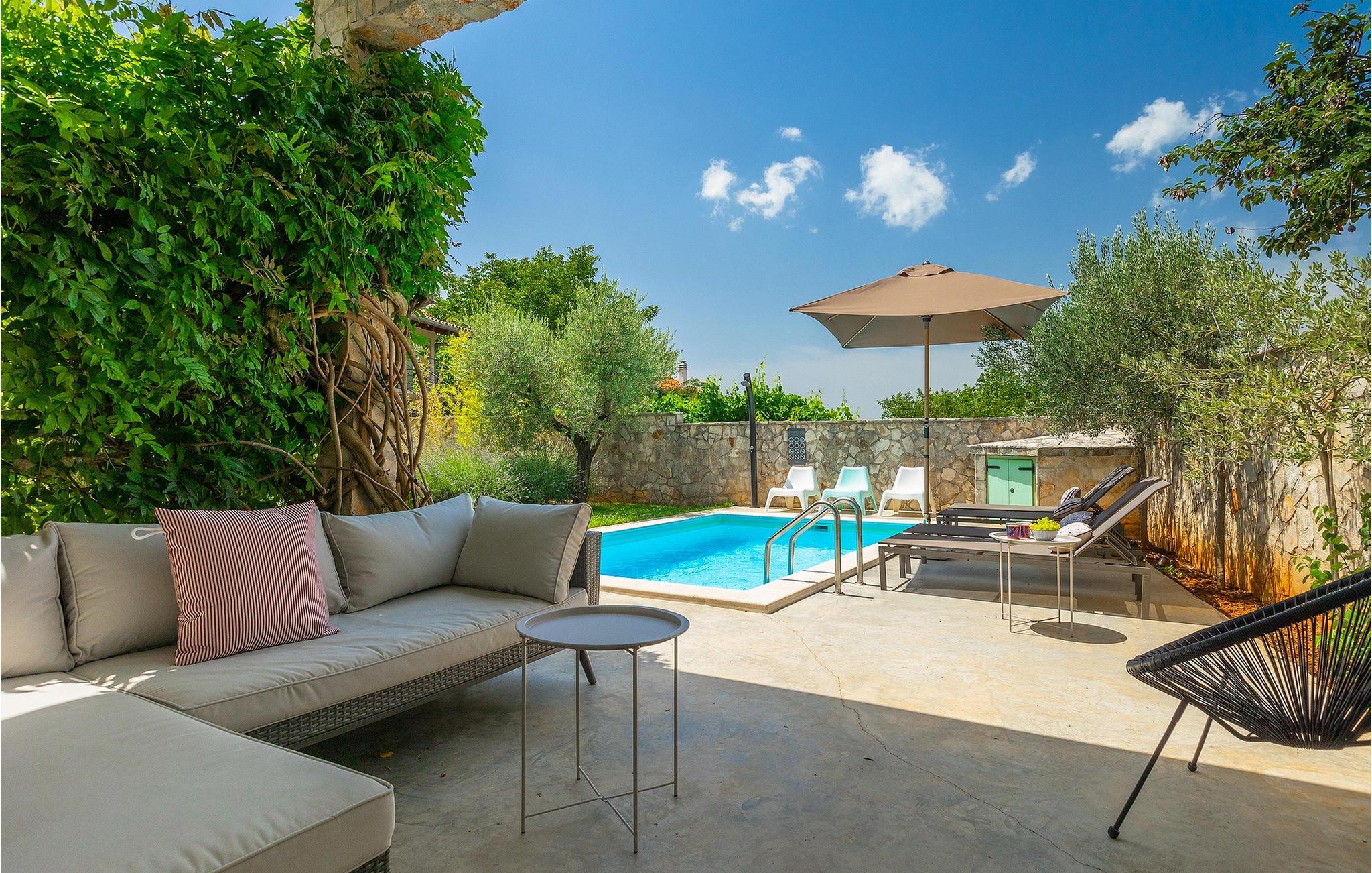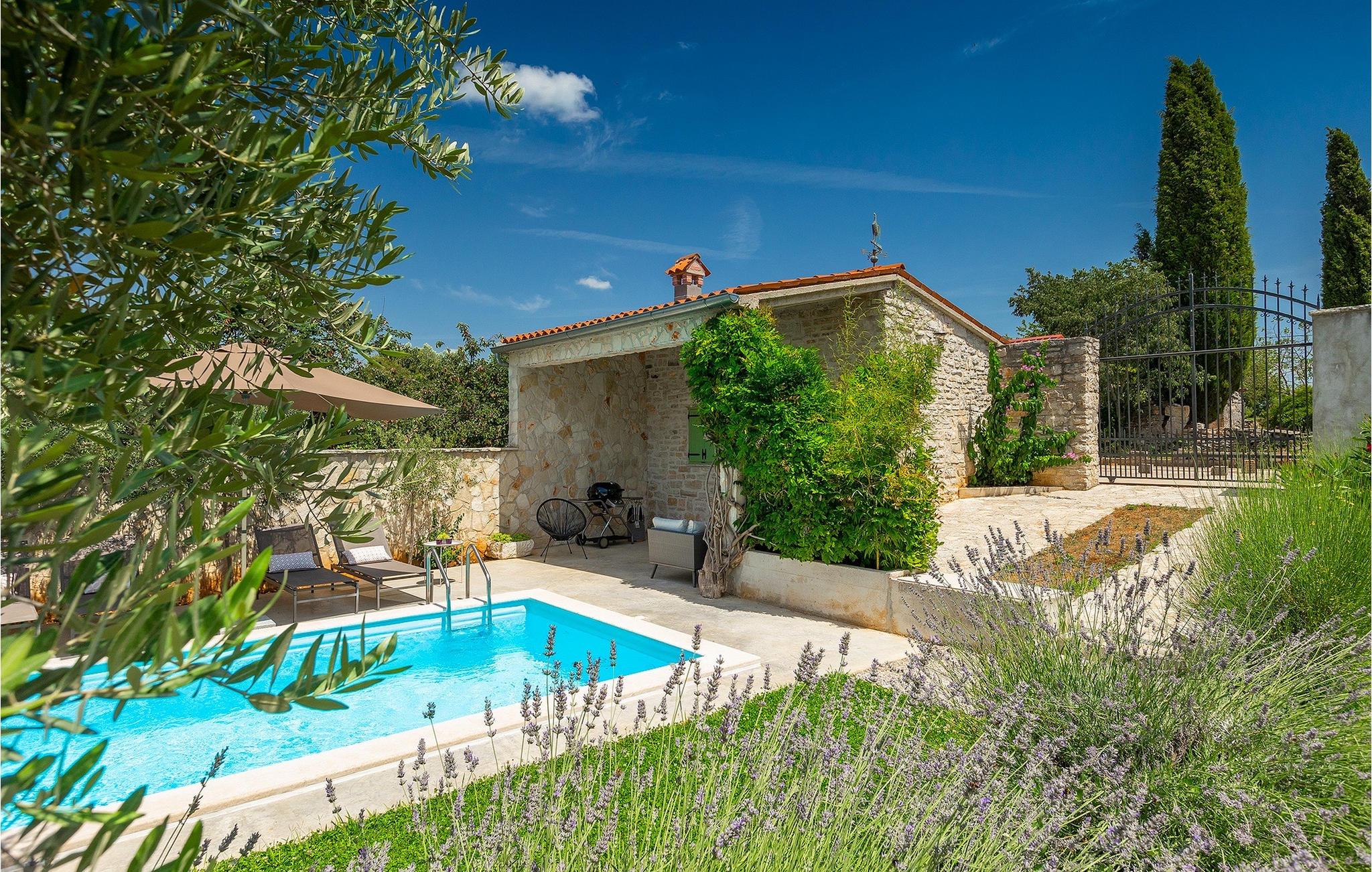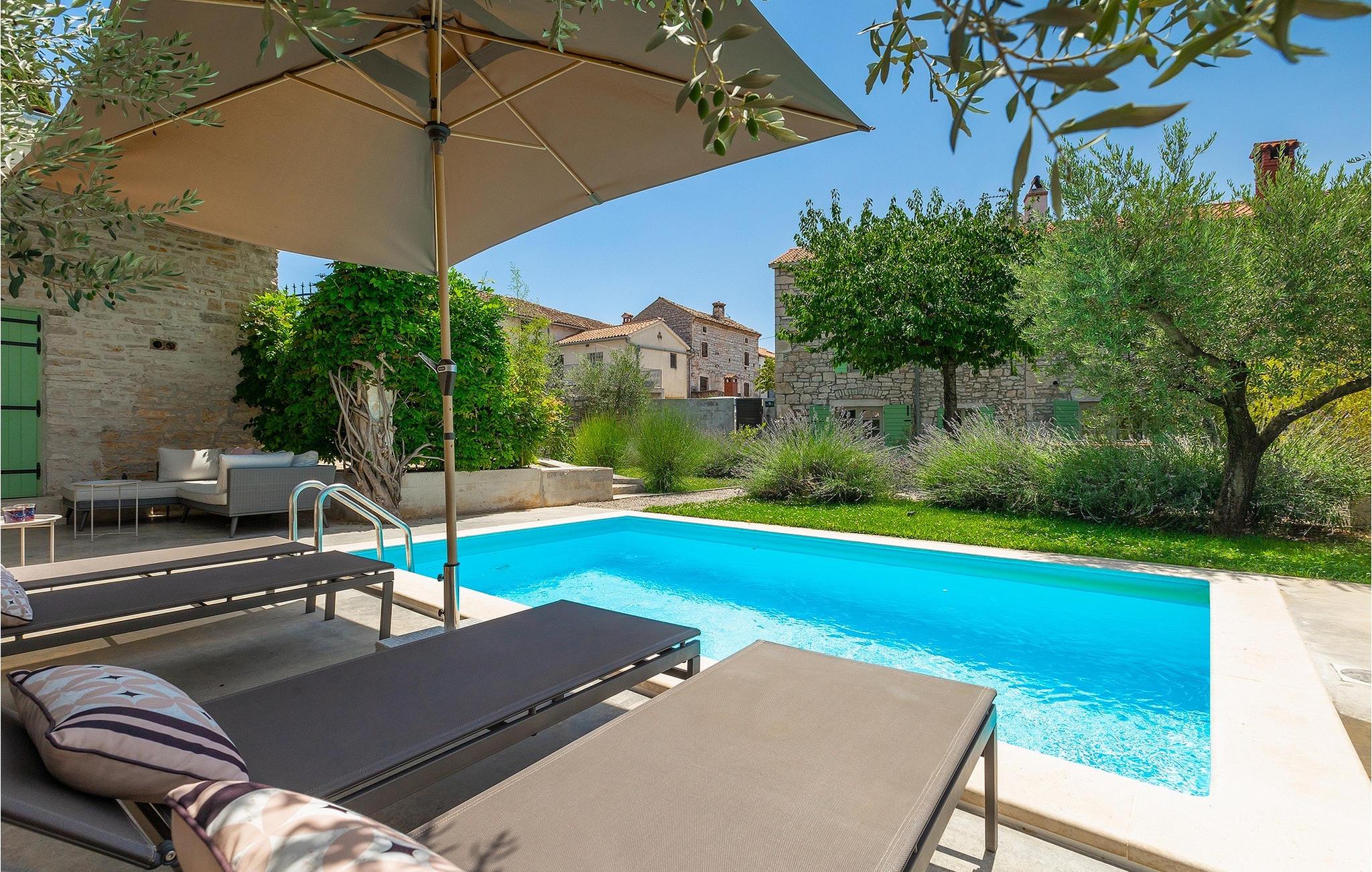 Der Außenbereich ist ebenso atemberaubend - zur Verfügung stehen Ihnen der private Pool, mehrere Sitzecken im Garten und der Außen-Essbereich, damit Sie Ihre Mahlzeiten im Freien genießen können.Die Ferienvilla befindet sich in der Nähe der Kleinstadt Kanfanar, aber sie ist auch nur eine kurze Fahrt von der schönen Küstenstadt Rovinj entfernt. Die alte Architektur der Stadt und der umliegenden Dörfer ist gut erhalten, Weingärten und Olivenbäume dominieren diesen Bereich mit seinem warmen, mediterranen Klima. Kanfanar und die umliegende Landschaft sind sehr bekannt, nicht nur wegen des historischen und kulturellen Erbes, sondern auch aufgrund der hervorragenden und authentischen istrischen Küche. Rovinj, die nächste größere Stadt, wird Sie durch seine mittelalterlichen Gassen und warmes mediterranes Ambiente verzaubern. Die Hauptkirche der heiligen Euphemia, wo sich Reliquien der Heiligen befinden, ist eine der schönsten barocken Bauten in ganz Istrien. Von der Kirche aus hat man einen wunderbaren Blick auf das offene Meer und zahlreiche kleine Inseln in der Ferne.