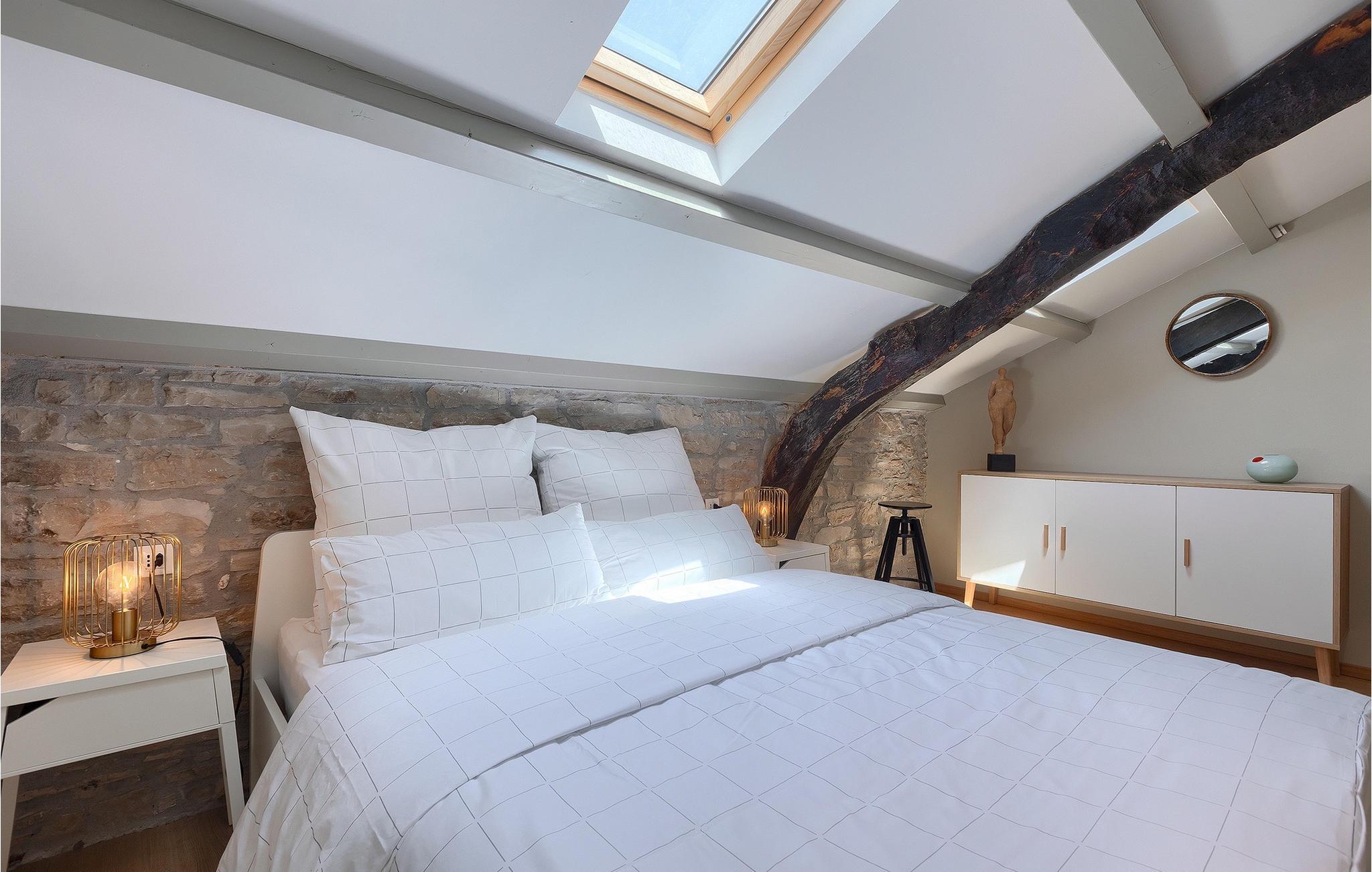 Weitere 2 Schlafzimmer, beide warm, einladend und eingerichtet mit Liebe zum Details, sind im zweiten Stock. Hier befindet sich auch das zweite Badezimmer.