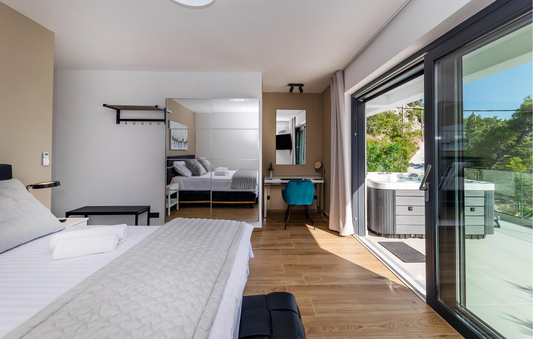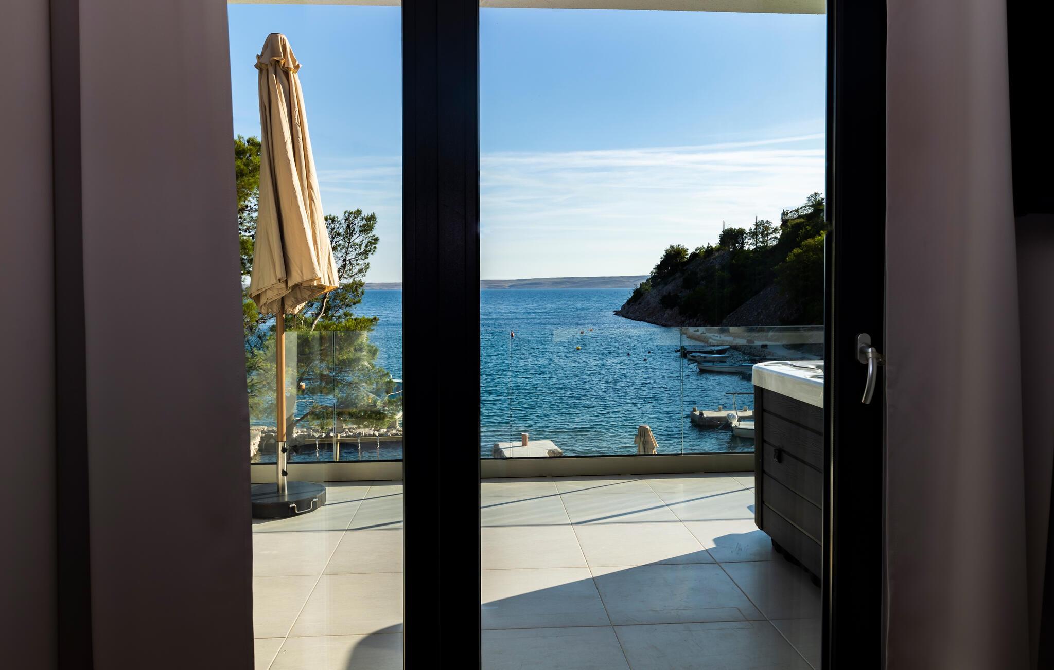 Draußen laden die Terrassen dazu ein, ungestört die Sonne zu genießen. Entspannen Sie im Liegestuhl und genießen Sie Erfrischungen im Pool oder nehmen Sie ein Bad im Whirlpool mit Meerespanorama.