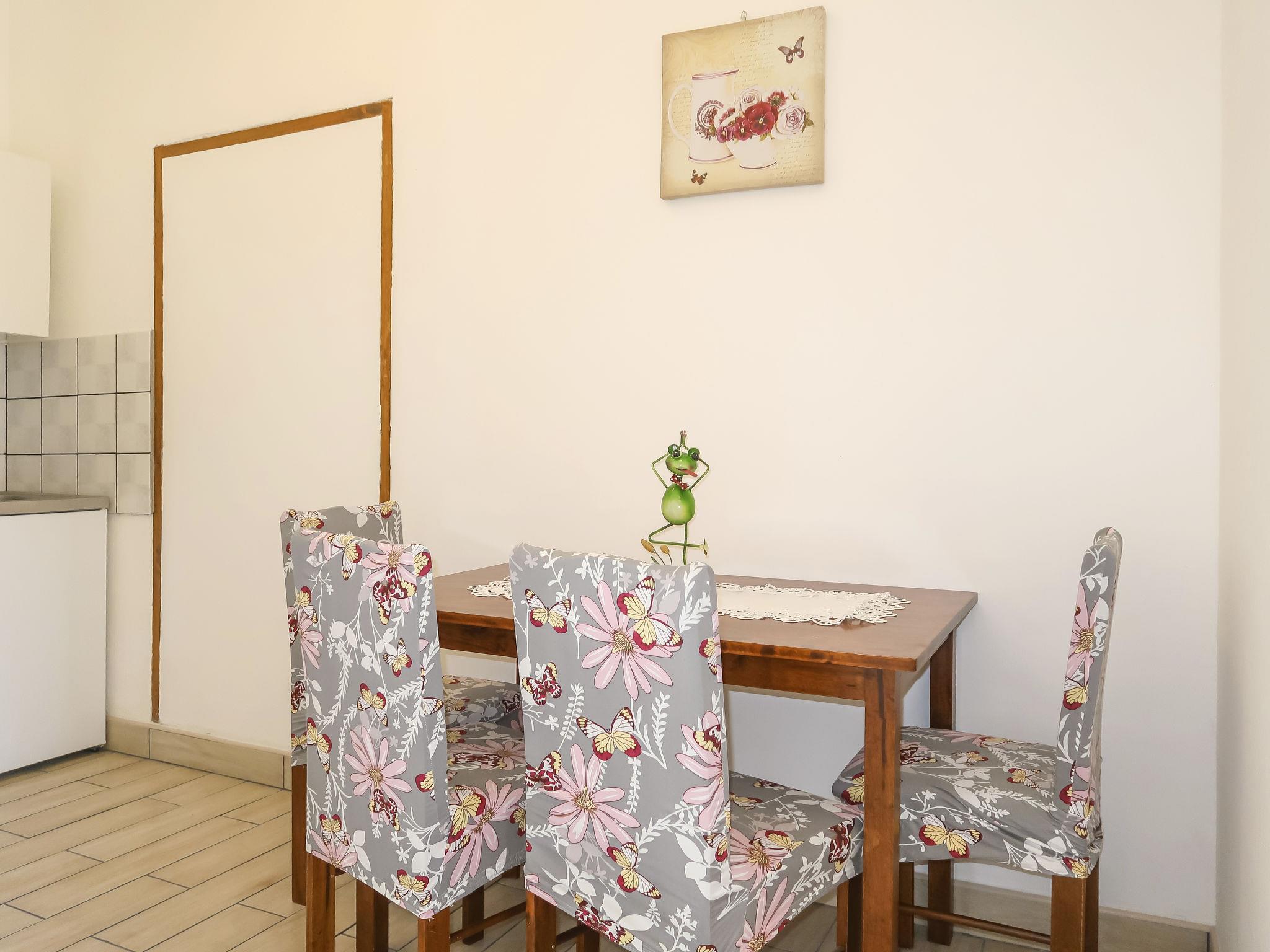 4-room apartment 80 m2, on the ground floor. Entrance hall with air conditioning. 1 room with 1 double sofabed (150 cm, length 190 cm), satellite TV. 1 room with 2 beds. Dining room with kitchen corner. 1 room with 1 french bed and satellite TV. 1 room with 1 x 2 bunk beds. Dining room with air conditioning. Exit to the terrace. Open kitchen (2 hot plates, dishwasher, toaster, kettle, microwave, electric coffee machine). Shower, shower/WC, sep. WC. No heating option. Terrace 20 m2. Terrace furniture. Facilities: washing machine. Internet (WiFi, free). Please note: non-smoking house. No internal connecting door between the separated properties. The apartment consists of 2 apartments rented as one unit. Highly placed windows in the bedroom with french bed.