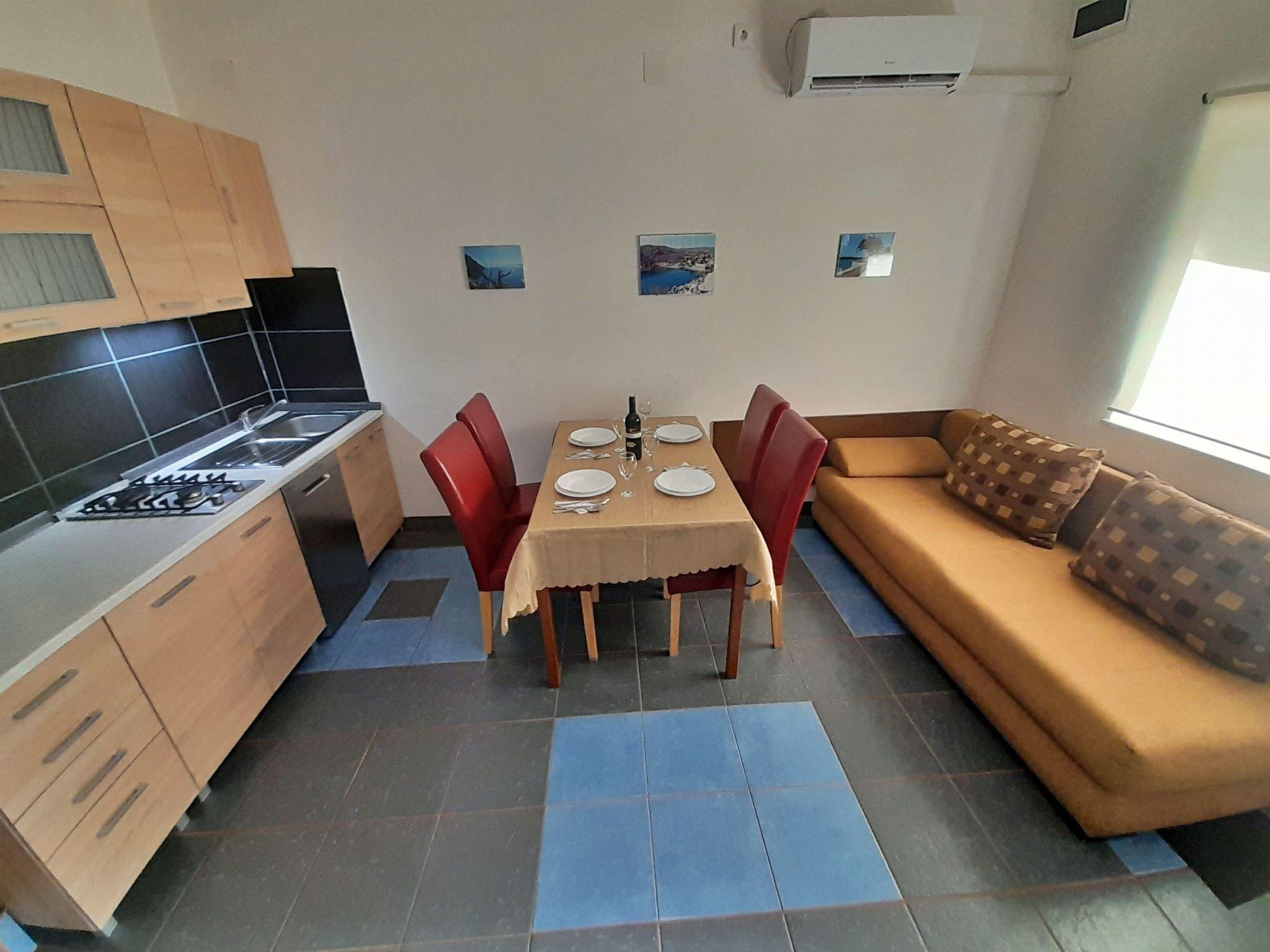 The 50m² apartment is on the ground floor and can accommodate two to four people. It has a bathroom with a shower and a bedroom with a double bed (160 x 200cm). The living room-kitchen consists of a sitting area with a double sofa bed (140 x 200cm), a dining space and a kitchen unit, equipped with a hob, fridge, microwave, coffee machine and kettle.