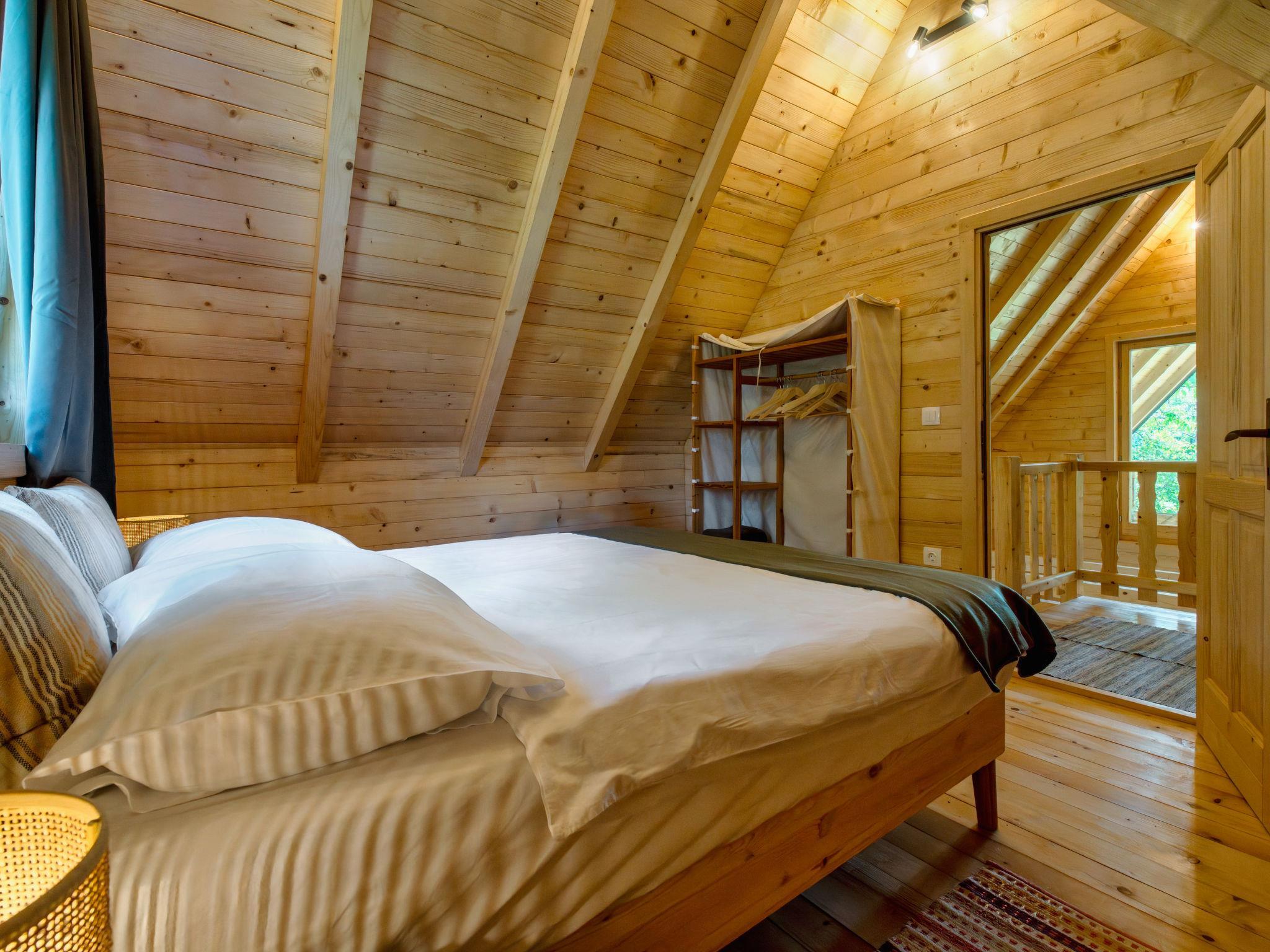 2-room chalet 48 m2 on 2 levels. Wooden furniture furnishings: living/dining room with 1 double sofabed (160 cm, length 200 cm), cable TV (flat screen), electric heater and air conditioning. Exit to the terrace. Open kitchen (oven, dishwasher, 2 induction hot plates, toaster, kettle, freezer). Shower/WC. Top floor: 1 room with sloping ceilings, ceiling height 100 - 300 cm with 1 french bed (180 cm, length 200 cm). Electric heating, forced-air heating. Deck chairs (2). Facilities: Internet (WiFi, free). Maximum 1 small pet/ dog allowed.