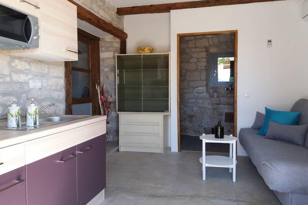 Our holiday home is available for rent from the beginning of April to the end of October – including the beautiful month of September/October when the sea is still pleasantly warm and the surrounding nature is perfect for hiking and biking. It's also available during the warm spring/early summer. Therefore, the beautiful pool is heated by both solar energy and an air-to-water heat pump! We offer our guests arrival and departure on Sundays so they can avoid the traffic jams on Fridays and especially Saturdays. Villa Perla in Kastelir near Porec offers breathtaking sea views. Located approximately 9 km from Porec, you can escape the hustle and bustle while still being just minutes away from Porec or one of the stunning beaches. In Kastelir, you'll find restaurants, bars, and all the shops you need for daily life. This beautiful, original Istrian stone house has been completely renovated and newly furnished and features four bedrooms, each with either two single beds or one double bed. The total living space is approximately 120 m² and is equipped with air conditioning. It consists of a main house with a living/kitchen area and a guest WC on the ground floor, leading to a covered terrace with breathtaking views over Porec and out to sea. This terrace can be transformed into a conservatory in seconds using a sliding door. From there, you have access to the first bedroom with an en-suite shower and a separate WC. The kitchen is completely new and equipped with a stove, dishwasher, and coffee machine. A new washing machine is also available. Directly in front of the house is the newly landscaped outdoor area with a 30 m² swimming pool, plenty of sun loungers, and an outdoor seating area with a barbecue. The first floor offers two bedrooms, each with a double bed, and a brand-new bathroom with a shower – all rooms offer sea views from the beds! Furthermore, the house includes a beautiful apartment with its own entrance, a living area with a kitchenette, a separate bedroom with two single beds, and a lovely bathroom with a shower. This area, with its separate entrance, is ideal for providing grandparents or teenagers with their own private space, or, due to its structural features, for simplifying the stay for one or more people with disabilities. Televisions are available in all living areas. Dogs are allowed upon prior arrangement – surcharge: EURO50 per week per dog. The pool is regularly cleaned by a very friendly person who is always available to answer questions or help with any problems. Bed linen and towels are provided.