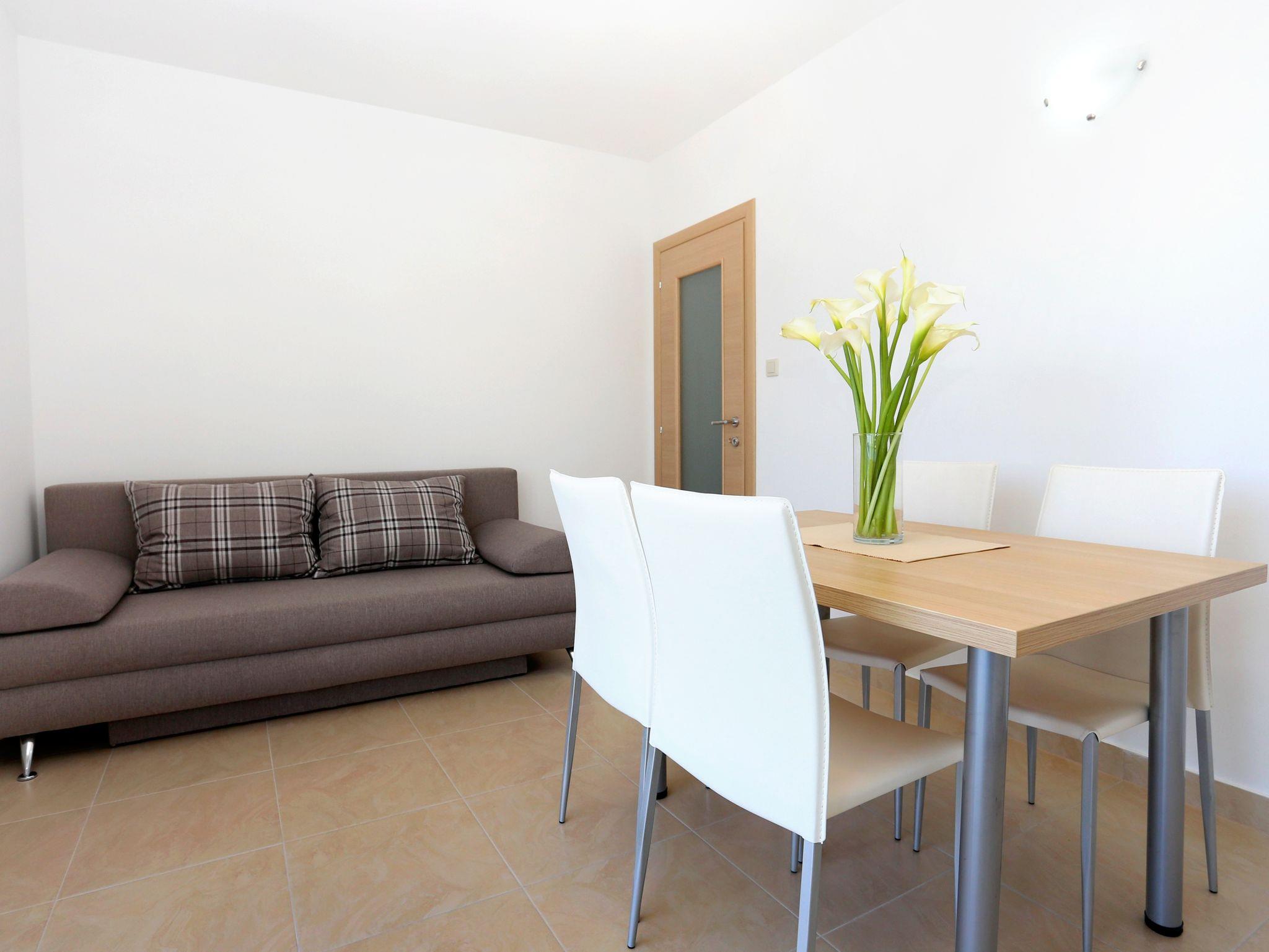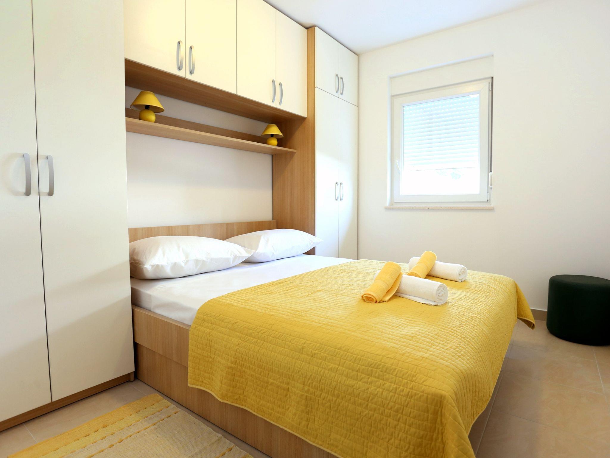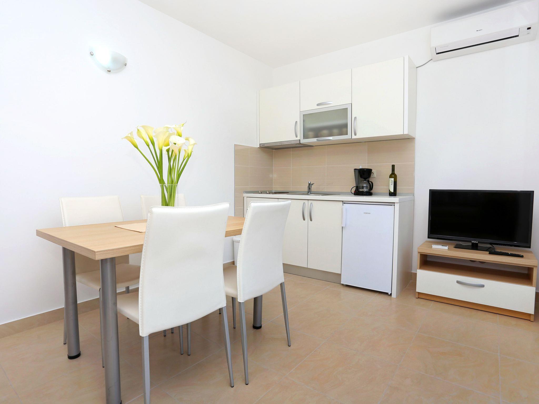 Ferienwohnung bietet Platz für 4 Gäste. Die Betten sind in Schlafzimmern, die es 1 gibt, und in Wohnzimmer, innerhalb einer Gesamtfläche von 30m2, angeordnet. Die Gäste haben eine eigene Terrasse zur Verfügung, auf der sie in warmen Sommernächten genießen können. Das Apartment bietet Meerblick. IM PREIS INBEGRIFFEN: Kurtaxe, Endreinigung, Klimatisierung, Parkplatz, Internet, Bootsanlegeplatz, Kinderbett, Bügeleisen, Bügelbrett, Föhn, Sonnenschirm, Liegestühle. VERBINDLICHE ZUSÄTZLICHE KOSTEN: Aufzahlung für Kurzaufenthalte (prozentualer Zuschlag pro Nächtigungsanzahl: 30% - 1, 20% - 2, 10% - 3). Die Verfügbarkeit zusätzlicher Dienstleistungen in Ihrem reservierten Termin und die Preise derselben (falls nicht aufgeführt) müssen im Voraus überprüft werden. Zusätzliche Dienstleistungen die in der Zahlungsaufforderung nicht aufgeführt sind werden direkt beim Vermieter bezahlt, angenommen der Gast nutzt auch diese. Ermäßigung auf den Grundpreis: Gratistag 14=13 (bei einem Aufenthalt von 14 Tagen oder mehr erhalten Sie einen Gratistag für den Aufenthalt bis 31.12.26).