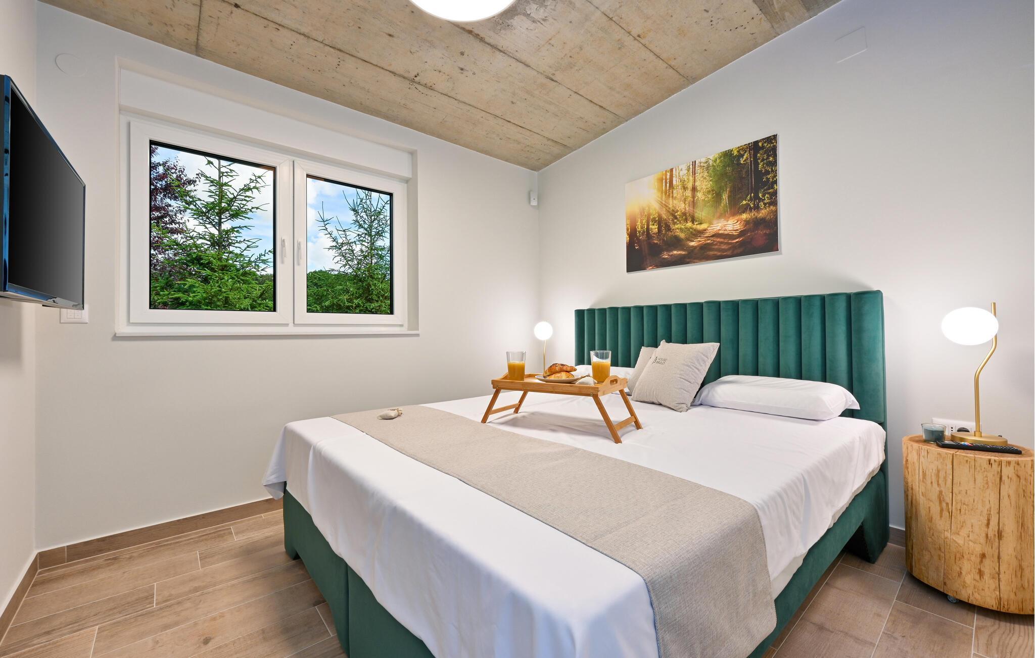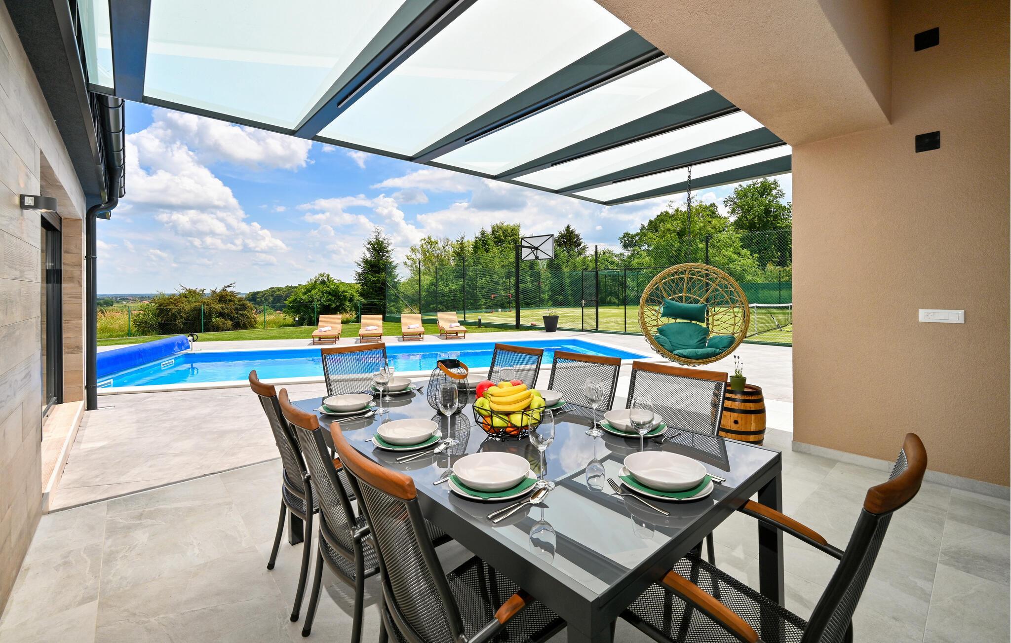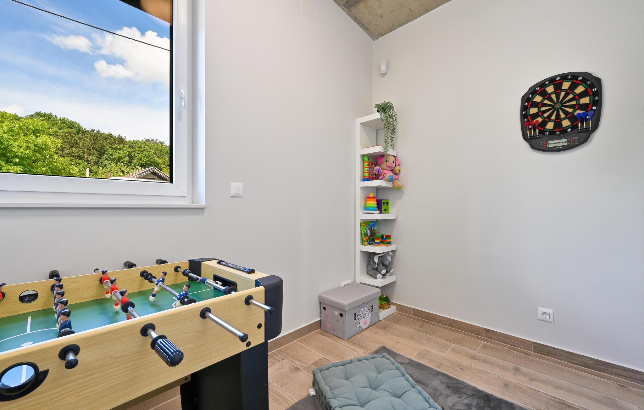 In einem Vorort von Koprivnica befindet sich dieses moderne Ferienhaus mit Swimmingpool und einem Indoor-SPA-Bereich mit Whirlpool und Sauna. Umgeben von viel Grün und in einer natürlichen Umgebung wird es Ihnen mit Sicherheit einen entspannten und ruhigen Urlaub bescheren. Das Haus lässt keine Wünsche offen, denn es wird Sie ab Beginn mit seinem Komfort und Design überzeugen. Alle werden sich hier wohlfühlen. Denn Ihre Kinder werden sich über das Spielzimmer freuen, während die Erwachsenen auf der Sofalandschaft entspannen können.