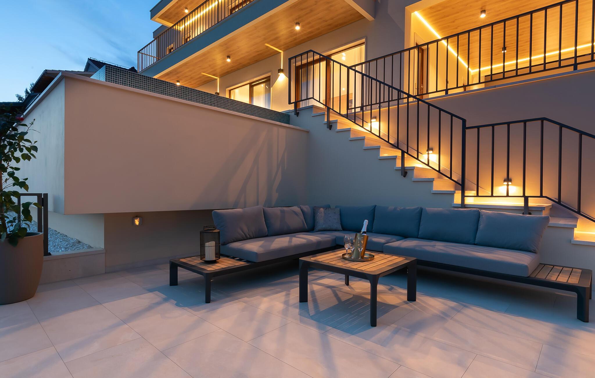 Erfrischen Sie sich im stilvollen Infinity-Pool und lassen Sie den Blick über das endlose Blau schweifen. Entspannen Sie auf den bequemen Sonnenliegen oder genießen Sie gesellige Stunden auf der großzügigen Terrasse, die ideal für gemeinsame Mahlzeiten im Freien ist.