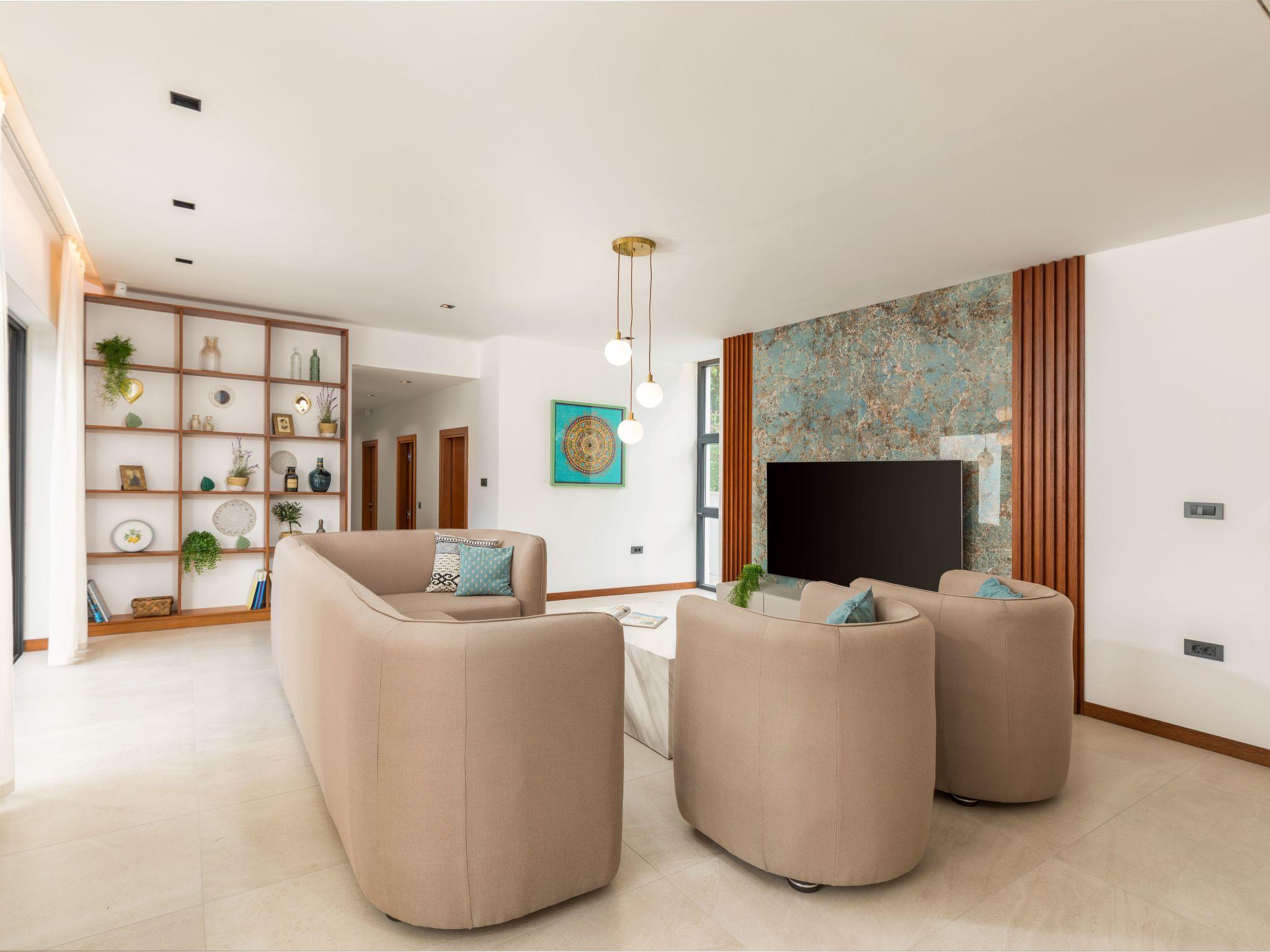 The modern ground floor villa is bright and inviting and offers a comfortable stay for up to ten guests. The open-plan living area is furnished with a comfortable seating set and a Smart TV. It flows seamlessly into the dining area and the fully equipped kitchen, creating a cosy feel. Five luxurious bedrooms with double beds and adjoining bathrooms guarantee individual retreats. Each room has its own TV, air conditioning and direct access to the outdoor area.