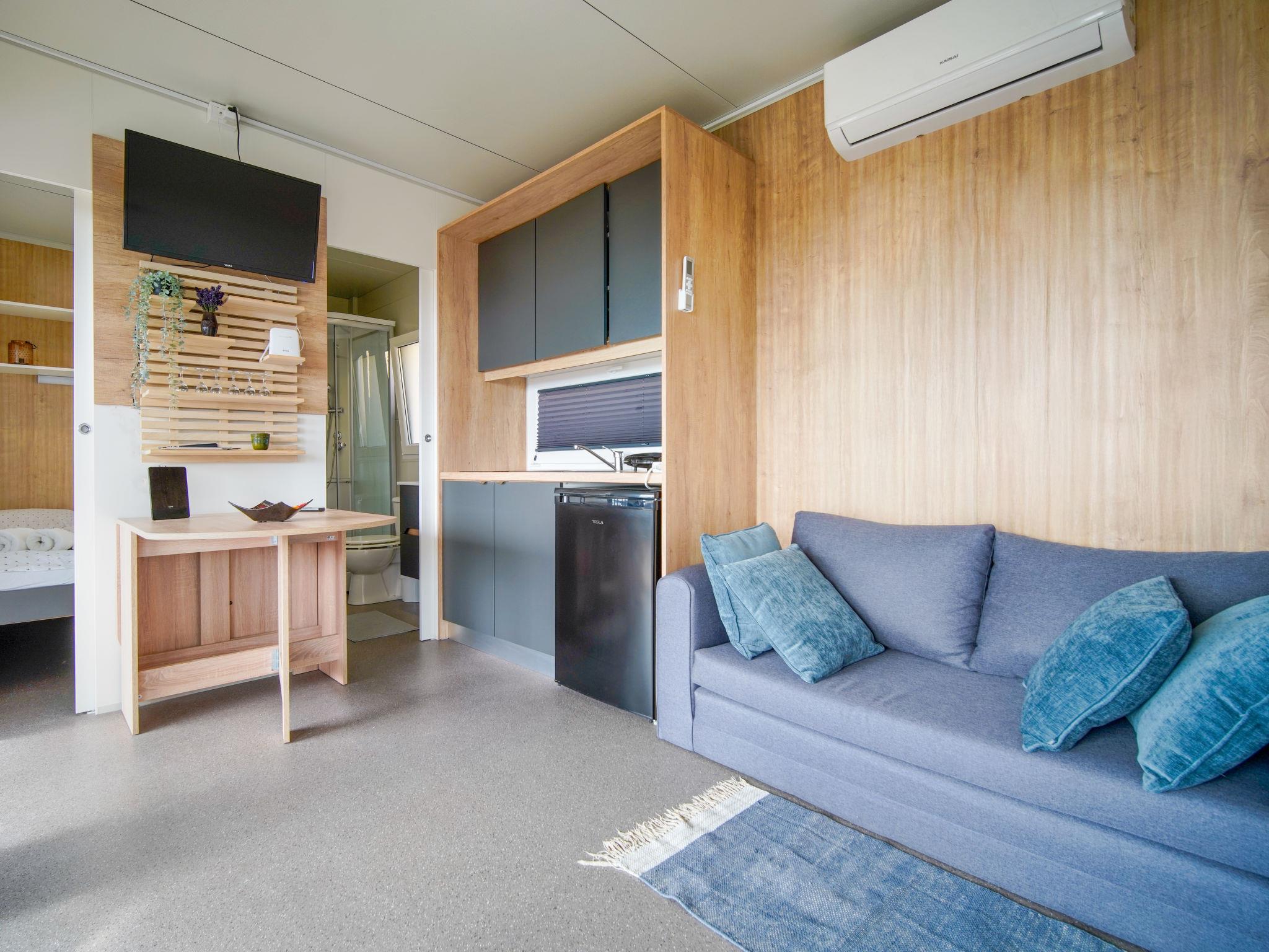 3-room mobile home 24 m2. Living/dining room with cable TV and air conditioning. 1 room with 1 french bed (160 cm, length 200 cm). 1 room with 1 french bed (140 cm, length 200 cm). Open kitchen (2 induction hot plates, toaster, kettle). Shower/WC. Forced-air heating. Terrace 24 m2, roofed. Terrace furniture. Beautiful view of the valley and the countryside. Facilities: iron, mosquito net, children's high chair, baby cot, hair dryer. Internet (WiFi, free). Please note: non-smoking house. Maximum 1 pet/ dog allowed.