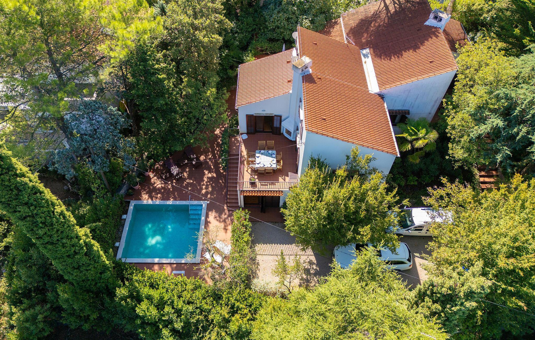 Draußen erwartet Sie ein traumhafter Garten mit viel Grün, ein einladender Außenpool und drei großzügige Terrassen mit hochwertigem Mobiliar. Genießen Sie gesellige Grillabende und lassen Sie den Blick über das nahe Meer schweifen. Die ersten Strände sind bequem zu Fuß erreichbar, und das Zentrum von Malinska mit Restaurants und Cafés liegt in der Nähe. Parkmöglichkeiten befinden sich direkt auf dem Grundstück.