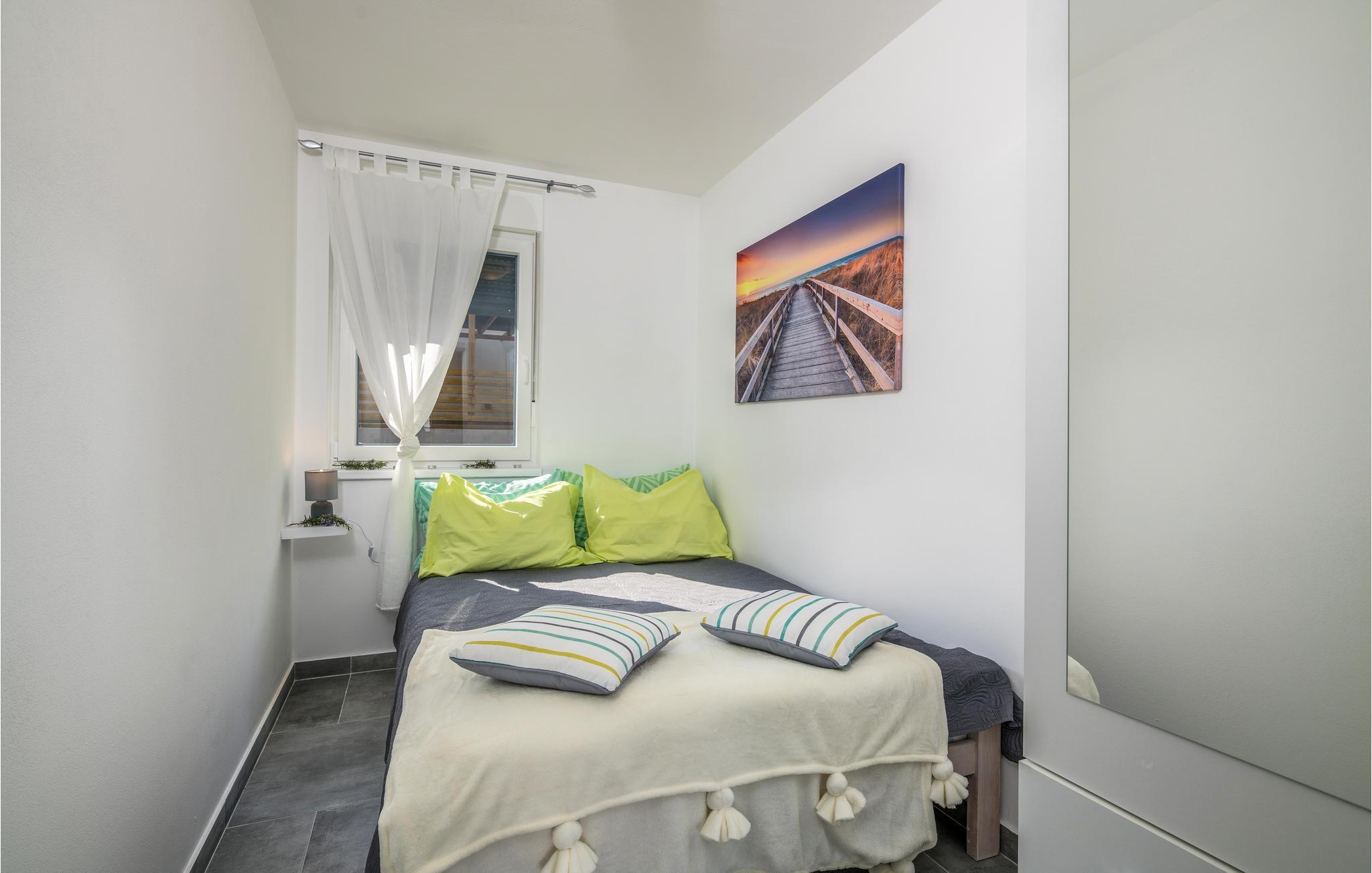 Vom Wohnzimmer erreichen Sie eine der zwei überdachten Terrassen mit Grill, wo Sie die Sonne genießen können. An warmen Sommertagen lockt der private Außenpool zu Abkühlung und Badespaß. Nur wenige Minuten zu Fuß entfernt befinden sich der schöne Kiesstrand und das Meer - ideal für einen Urlaub mit vielen Strandtagen. Die Wohnung hat außerdem eine tolle Lage, um andere Orte auf der Insel Krk zu besuchen.