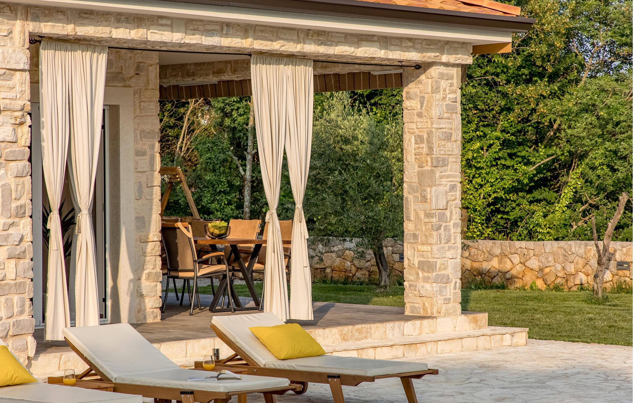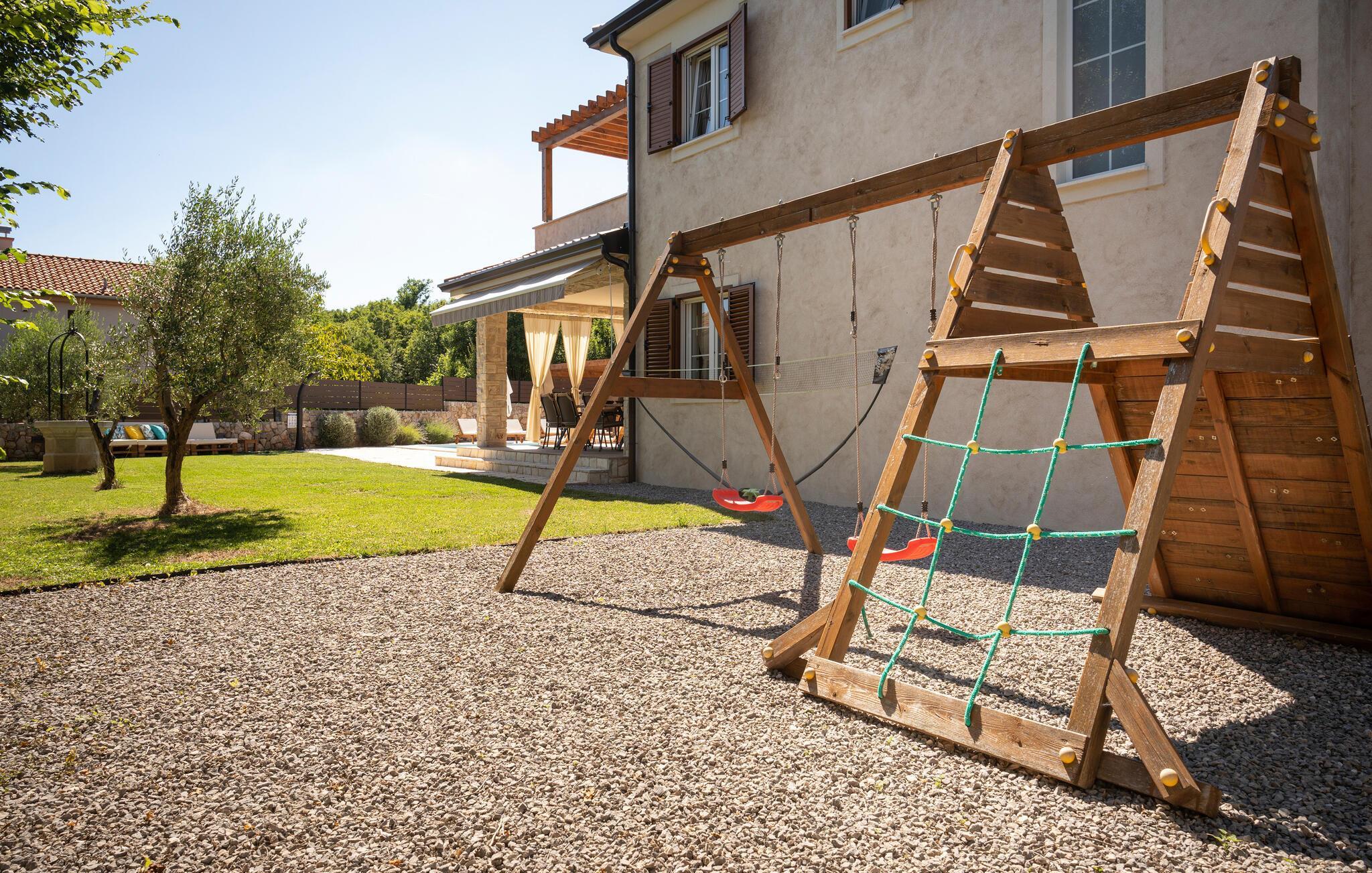 Die Villa LuLu auf der Insel Krk ist ein idealer Ort für Ihren Urlaub. Die Villa hat eine wunderschöne Umgebung mit einem kleinen Olivenhain, einem Kinderspielplatz, einem Außengrill und einem beheizten Pool mit Sonnenliegen. Die Villa bietet vier Zimmer mit angeschlossenem Bad, jedes Zimmer ist mit Klimaanlage und TV ausgestattet. Das Erdgeschoss der Villa verfügt über ein Schlafzimmer mit Bad, Küche, Esszimmer, Wohnzimmer mit Klimaanlage und TV sowie eine separate Toilette. Im Obergeschoss befinden sich drei Schlafzimmer und eine große Terrasse mit Blick auf den Pool und das Grün. Das Esszimmer und das Wohnzimmer öffnen sich zu einer Außenterrasse, auf der Sie die schöne Umgebung genießen können. Die Villa verfügt über eine große Umgebung und hat überdachte Parkplätze. Wenn Sie dem Alltag entfliehen möchten, bietet Ihnen die Villa LuLu unvergessliche Momente und Ruhe.