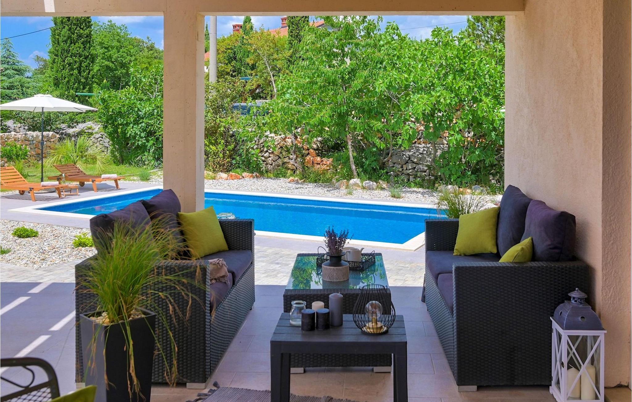 Die wunderschöne Villa Crassula liegt auf der Insel Krk und ist ein idealer Ort, wenn Sie Ihren Familienurlaub auf dieser wunderschönen Insel verbringen möchten. Die Villa verfügt über einen großen und weitläufigen Garten mit viel Grün. Ein privater Pool, umgeben von Sonnenliegen, ist der perfekte Ort, um sich an heißen Sommertagen zu erfrischen. Es gibt einen Essbereich im Freien sowie einen Holzkohlegrill. Das Erdgeschoss der Villa verfügt über ein Wohnzimmer, eine voll ausgestattete Küche und ein Schlafzimmer. Im 1. Stock haben Sie zwei weitere Schlafzimmer und zwei Badezimmer. Alle Schlafzimmer sind klimatisiert und verfügen über einen eigenen Fernseher.