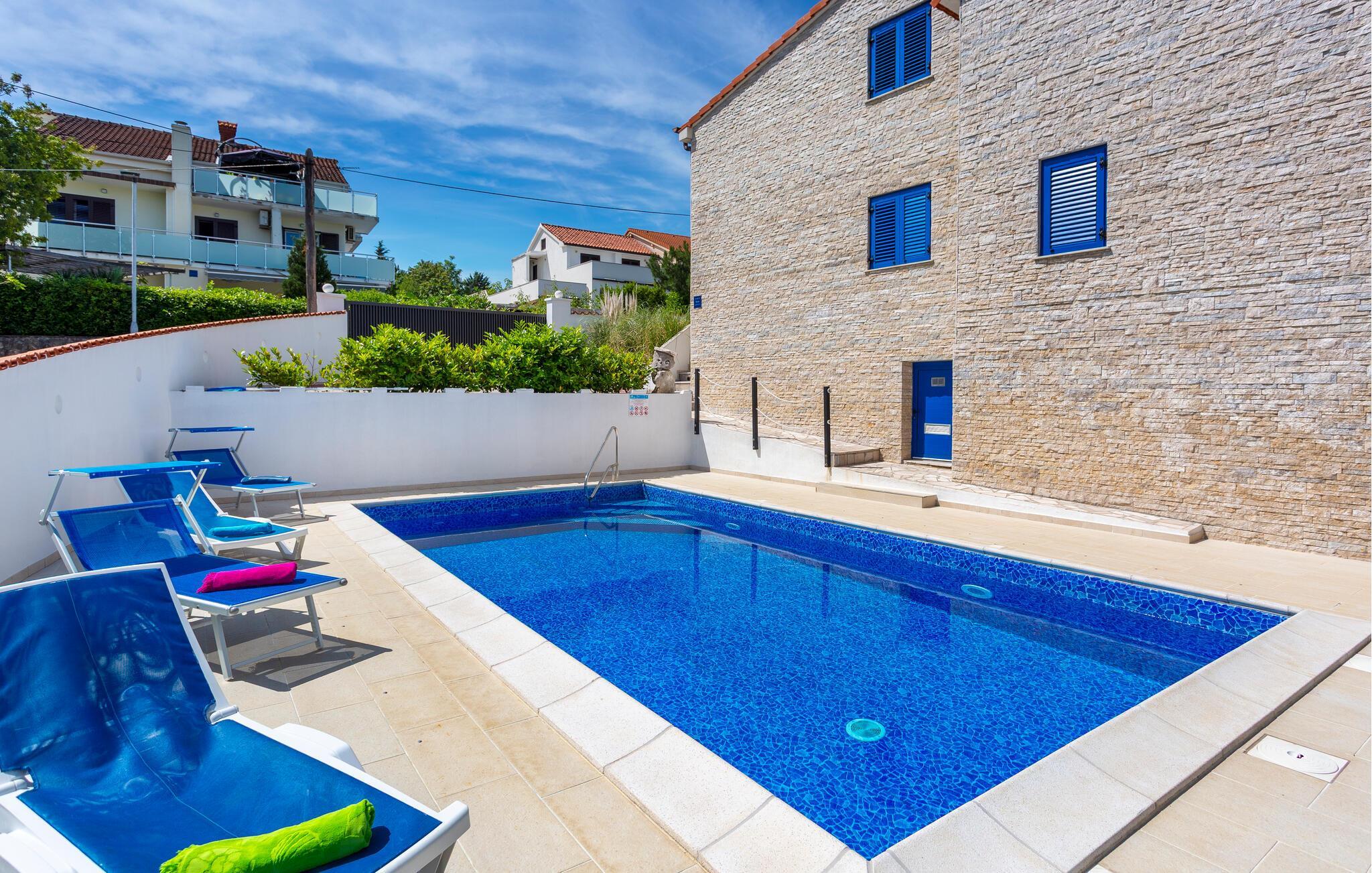 Es liegt in Klimno, ist geräumig und besitzt große Terrassen. So haben Sie im Erdgeschoss und im ersten Stock die Gelegenheit die Morgensonne im Freien zu genießen. Einen schöneren Start in den Urlaubstag gibt es kaum. Vom Erdgeschoss führt eine Außentreppe in den 1. Stock. Das Dachgeschoss wird vom ersten Stock jedoch über eine Innentreppe erreicht. Der Swimmingpool sorgt für viel Entspannung und Spaß.