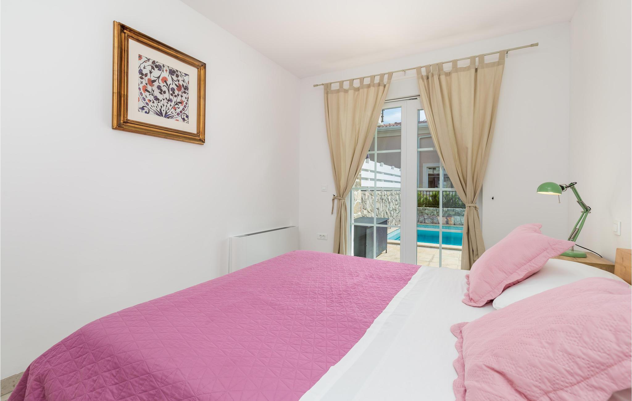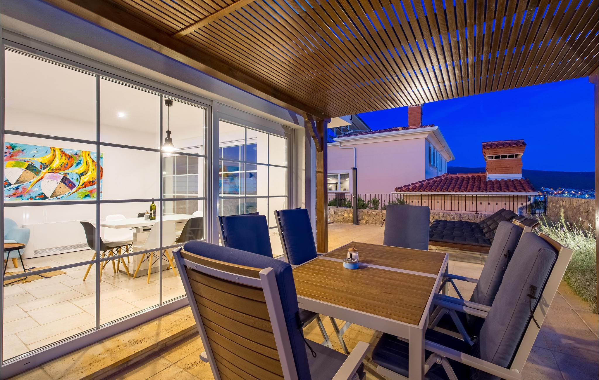Auf der Insel Krk im kleinen Dorf Kornic befindet sich dieses wunderbare Ferienhaus mit Pool. Es ist etwa fünf Autominuten entfernt von der historischen Stadt Krk und der Stadt Punat mit dem gut geschützten Hafen. Durch die Hügellage bietet sich vom Haus ein fantastischer Ausblick auf das Meer und die Olivenhaine, für die die Region bekannt ist. Das mit Liebe zum Detail eingerichtete Haus ist in typischer Inselarchitektur errichtet und besteht aus einer gelungenen Mischung aus modernen und traditionellen Elementen. Vom Wohnzimmer haben Sie direkten Zugang auf die Terrasse mit Grill, Lounge- und Sonnenbereich sowie beheiztem Pool. Das Hauptschlafzimmer liegt im Erdgeschoss und die anderen beiden sind im Obergeschoss. Das Haus ist klimatisiert, verfügt über eine Fußbodenheizung und auf dem großen und umzäunten Grundstück befinden sich auch die Parkplätze.