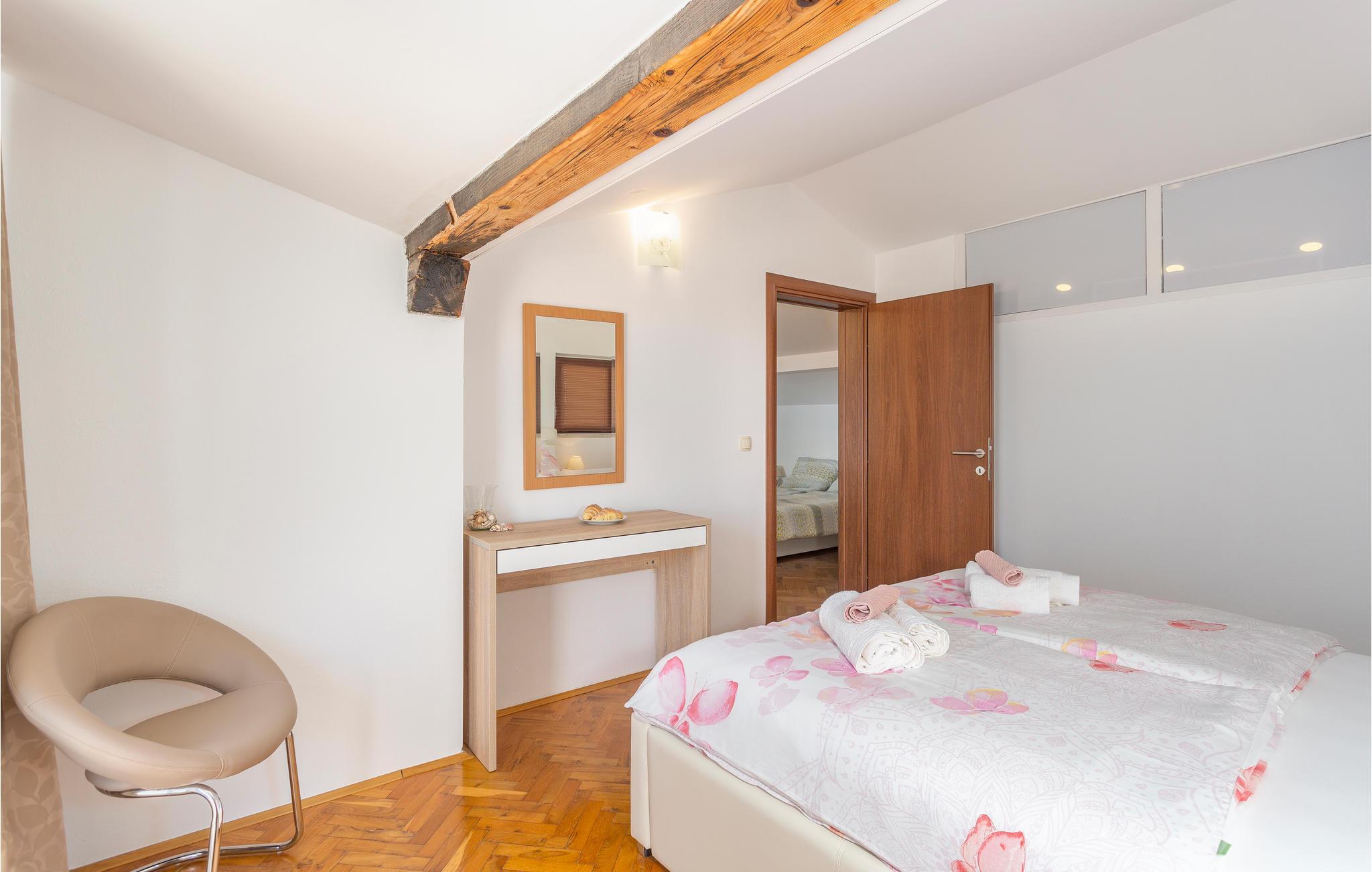 Im beliebten Touristenort Malinska auf der Insel Krk befindet sich diese wunderbare Ferienunterkunft. Die Wohnung ist geräumig und besonders komfortabel. Freuen Sie sich über den Zugang zur eigenen Terrasse, auf der Sie Ihren Morgenkaffee trinken oder abends einfach bei einem Glas Wein entspannen können. Der gemeinsame Hof ist mit mediterraner Vegetation bepflanzt und gepflegt, und lädt mit seinem Gemeinschaftsgrill zu langen Abenden und Mahlzeiten ein.
