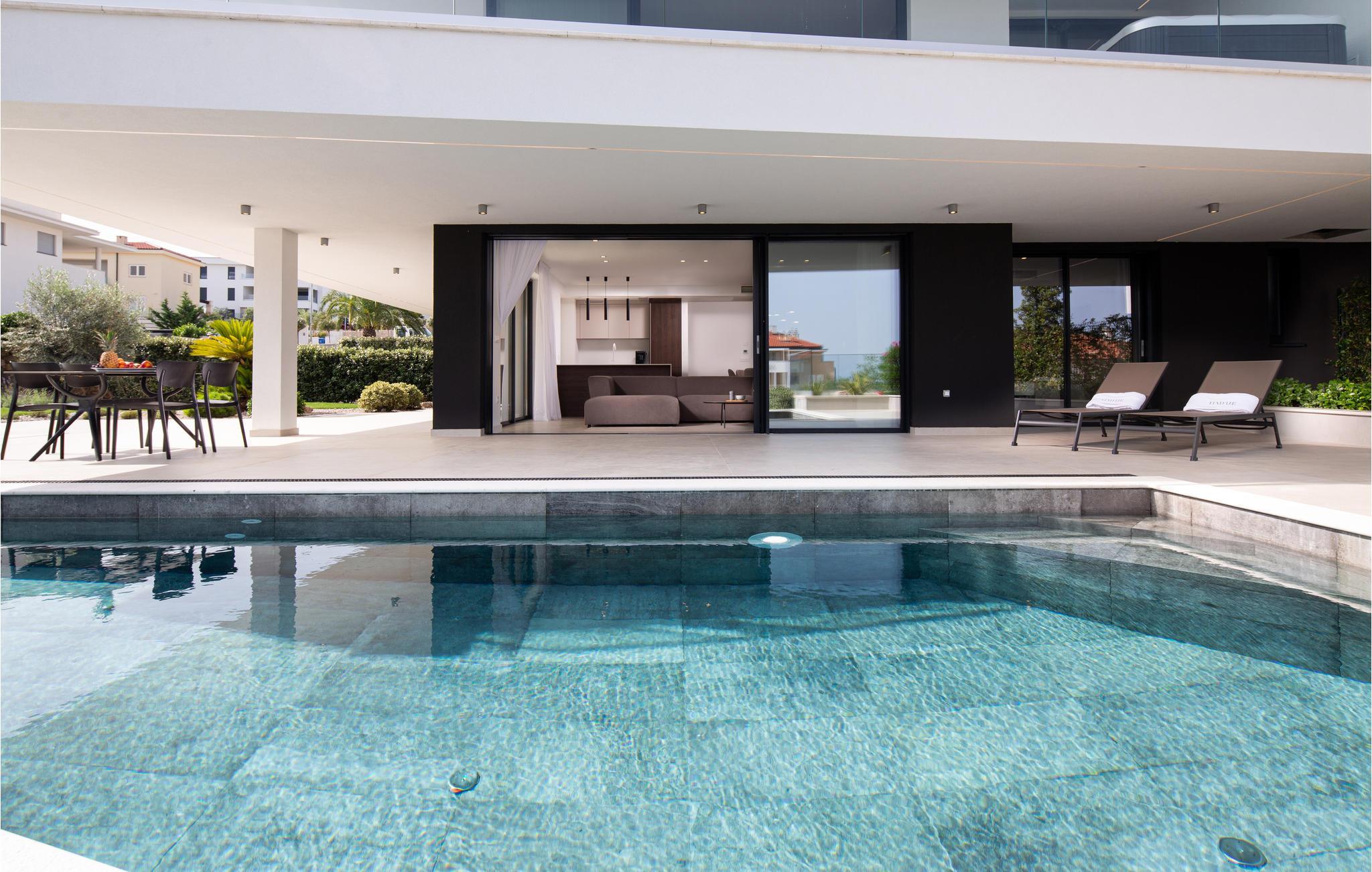 Draußen lädt die Terrasse dazu ein, die Sonne in vollen Zügen zu genießen. Treten Sie gleich morgens nach draußen und springen Sie in den Pool. Entspannen Sie im Liegestuhl und genießen Sie die Ruhe.