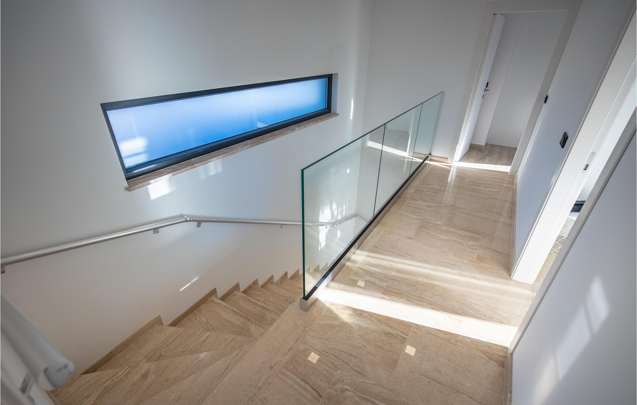 Große Glasflächen dienen als nahtloser Übergang vom Wohn- und Küchenbereich sowie von einem der Schlafzimmer zur Gartenterrasse. Im Obergeschoss erwarten Sie drei weitere Schlafzimmer mit eigenen Badezimmern. Jedes Schlafzimmer verfügt über einen Smart-TV, einen Safe und Zugang zum Balkon, von dem sich ein herrlicher Blick auf das Meer und die Landschaft bietet. Im Erdgeschoss steht Ihnen noch ein Wellnessbereich mit einem ca. 22 m² großen Innenpool und eine Sauna zur Verfügung. Im Untergeschoss sind ein Weinkeller sowie Freizeiteinrichtungen wie Billard und Tischfußball.