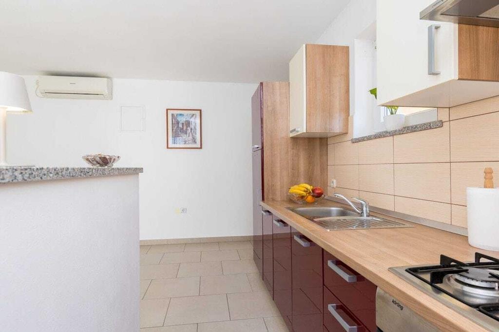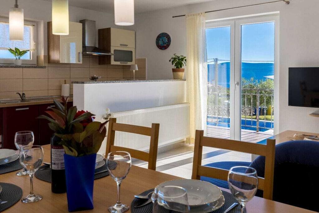Accommodation David and Matej is intended for a group of 8 guests. Accommodation David and Matej has an area of 100 m2, the accommodation is designed for 8 people with the possibility of an extra bed, four bedrooms and two bathrooms are at your disposal. It is located on the ground floor of the house. The accommodation is well equipped. In front of the house there is a large new swimming pool and a covered outdoor terrace with stone barbecue. The accommodation is ideal for a group of guests, friends and a family of 8 people. All content only for you. From the pool and from the whole house there is a beautiful view of the sea. The house is located in a quiet place on Krk Linardici, near the towns of Krk and Malinska, Njivice, Baška, Vrbnik.