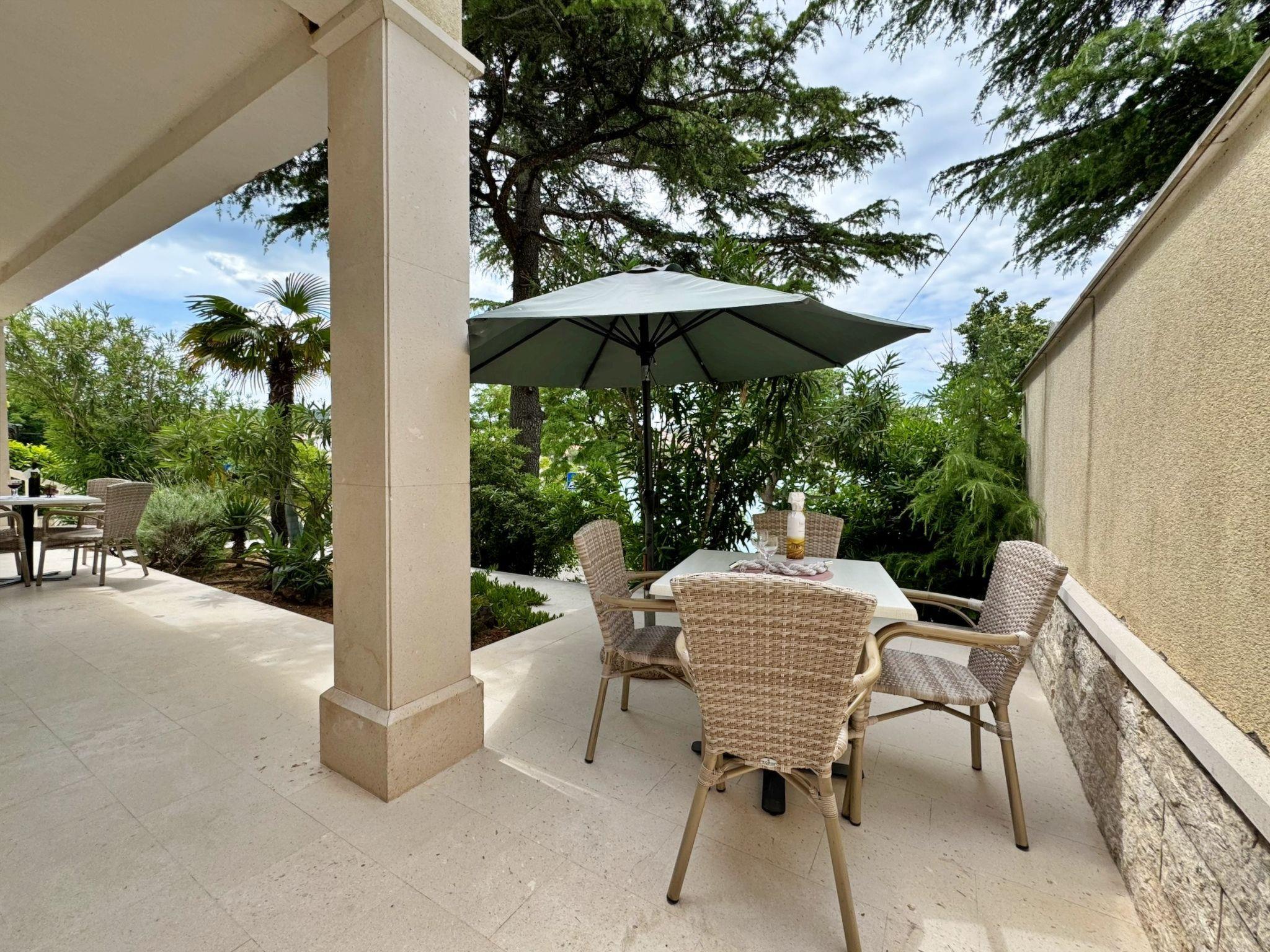 The outdoor area of this flat is no less impressive. Enjoy the picturesque garden, which you share with another flat. The 20 m² terrace, which can be accessed through the living room and the bedroom, offers a wonderful view and is perfect for enjoying the fresh sea air. An outdoor shower and a communal barbecue area provide added convenience. There is also a private car park behind the house, making your stay here particularly convenient.