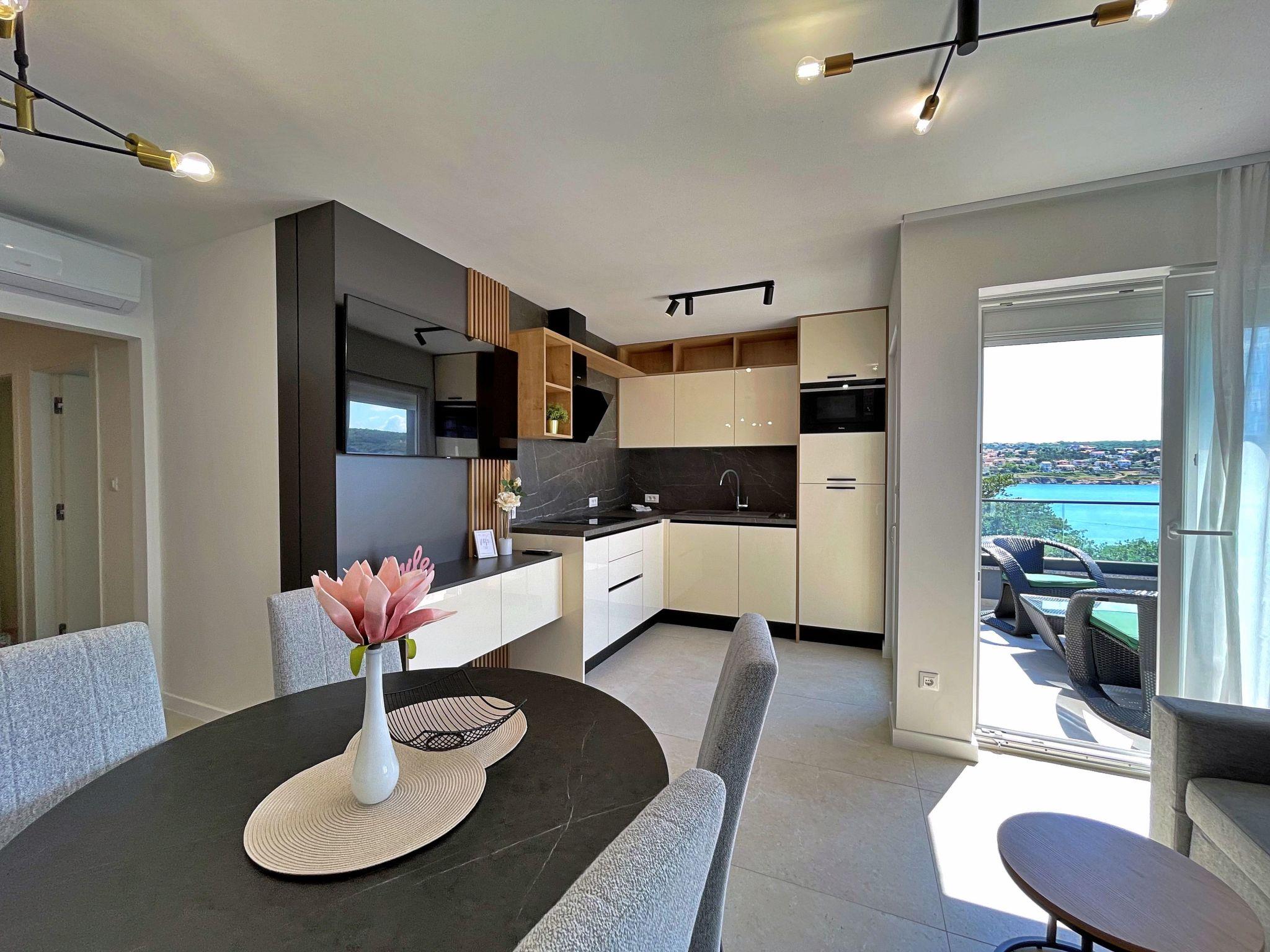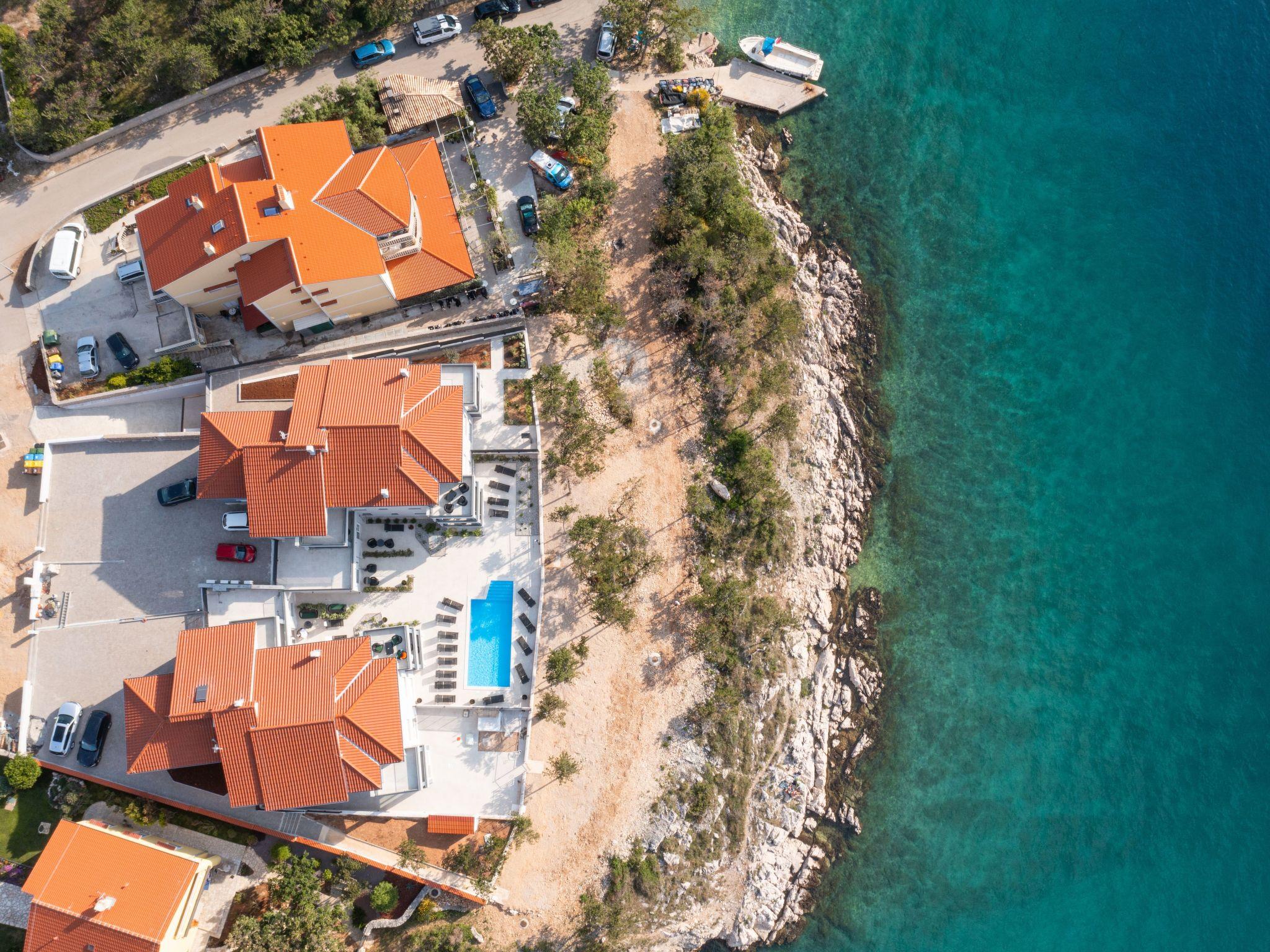 This luxurious, modern seafront flat is located in a quiet apartment complex just 30 metres from the sea, surrounded by nature, secluded coves, pebble beaches and hiking trails. It offers a communal saltwater pool (36 m2), which is open from May to October and whose temperatures usually reach 20-26 °C. The flat is located on the 2nd floor and has two bedrooms, each with a double bed, a modern kitchen with induction hob, fridge-freezer, kettle, coffee machine, toaster, microwave and dishwasher. The bathroom has a shower and toilet. The dining area and living room offer a cosy space with a sofa and smart TV, while free WiFi is available throughout the building.
