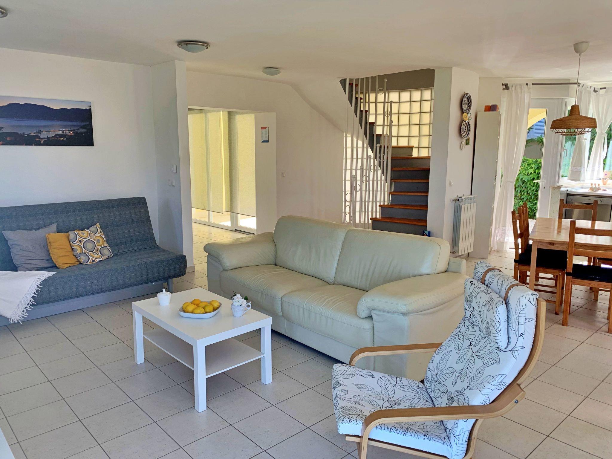 The flat is spread over two floors with a total of three entrances. The ground floor has an open-plan kitchen, dining and living area and a toilet. The fully equipped kitchen includes an electric hob (4 hotplates), an oven, a fridge with freezer compartment, a coffee machine, a kettle, a toaster and a dishwasher. The living area offers comfortable seating, a dining area and a TV with satellite and cable channels as well as a sea view through the window.