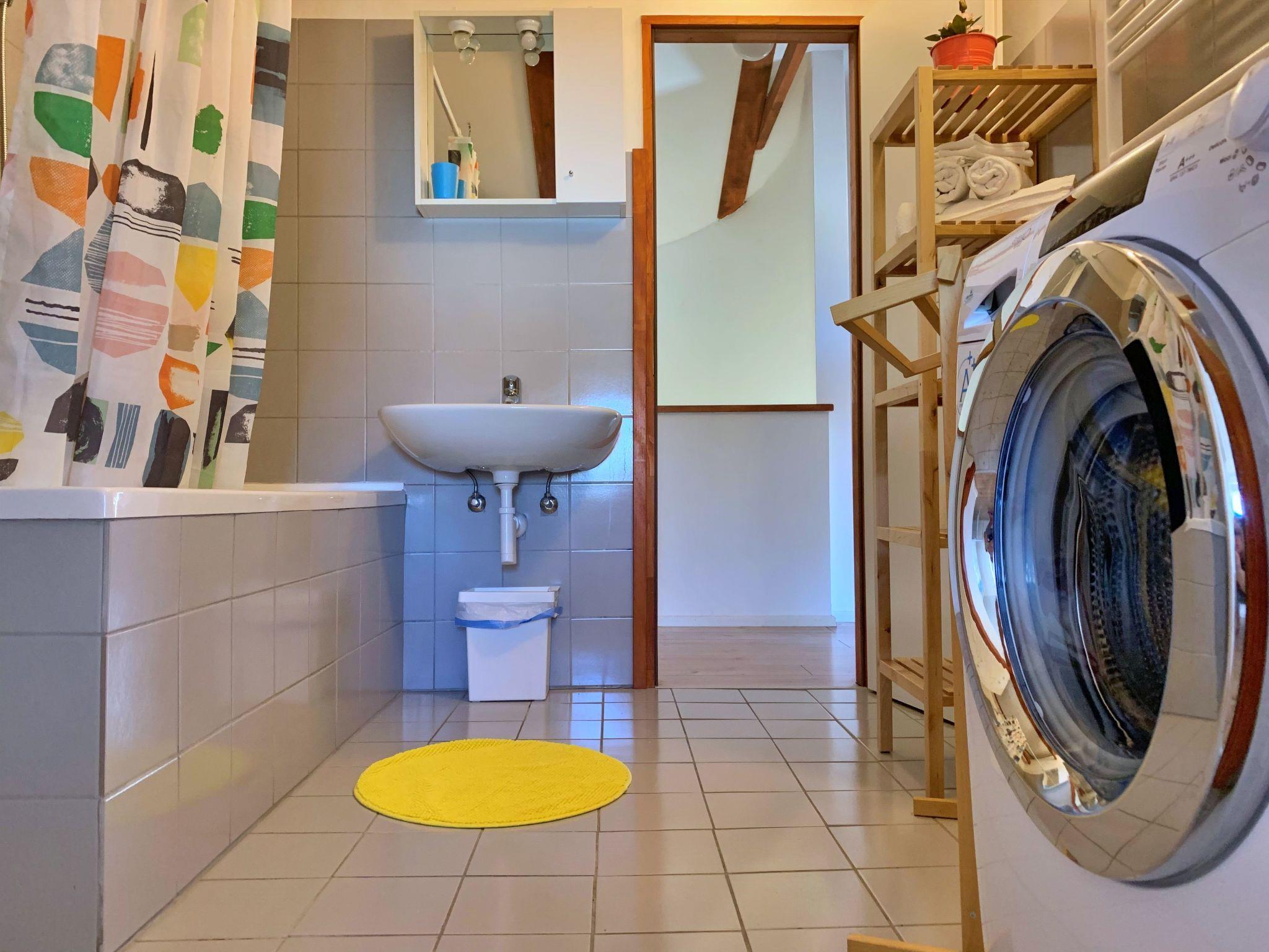 Upstairs, two bedrooms each have their own bathroom: one with a shower, the other with a bathtub, washing machine and both with toilets. One bedroom has its own balcony (4 m2) with breathtaking views of the sea and the town. The sandy beach is only 90 metres away and the town centre can be easily reached on foot in 450 metres.